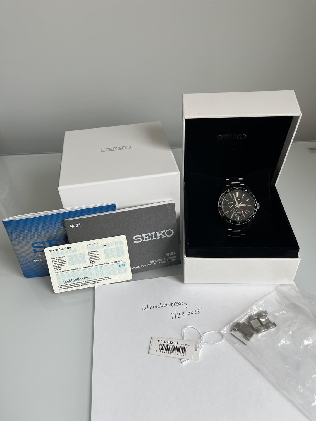 Hi, I am selling my Seiko SPB221J1 Presage Sharp-Edged GMT with the beautiful textured Sumi-iro (charcoal black) dial and integrated power reserve, GMT, and pointer date complications. This is a Japan-made model in excellent condition as shown in pictures. ⸻ Specs: • Model: SPB221J1 (also known as SARF005 in JDM markets) • Case: 42.2 mm stainless steel (DiaShield coated) • Thickness: 13.7 mm • Lug to Lug: ~49.2 mm • Movement: Seiko 6R64 (automatic GMT, power reserve, pointer date) • Power Reserve: ~45 hours • Crystal: Sapphire with inner AR coating • Bracelet: Stainless steel, full links included • Caseback: Exhibition / see-through • Water Resistance: 100M • Dial: Textured Asanoha pattern, Sumi-iro black ⸻ Condition: Excellent. Worn only a handful of times for special occasions. No scratches on the crystal. Very minimal wear—just a few light marks on the clasp from normal handling. Runs strong and keeps good time. I am selling this watch because I need to downsize my watch collection and to raise money for my 2 kids. ⸻ Included: • Original inner and outer Seiko boxes • Manuals/papers • All bracelet links (sized but complete) ⸻ Price & Terms: $800 USD shipped via USPS Priority Mail, insured with signature required. • Payment: PayPal Friends & Family only • No returns – I’m a private seller. Please be confident before purchasing. I will make absolute sure it’s bubble wrapped well. • I will only sell to buyers with a clear post/comment history on Reddit. No brand new accounts. This is my first time trying this community. ⸻ About Me: Longtime Reddit user (15+ years) with visible post history in r/Watches and other subs. I previously posted about purchasing an SBGA407 in Japan, among other watches – feel free to check my profile. I’m happy to answer any questions or provide additional photos if needed.