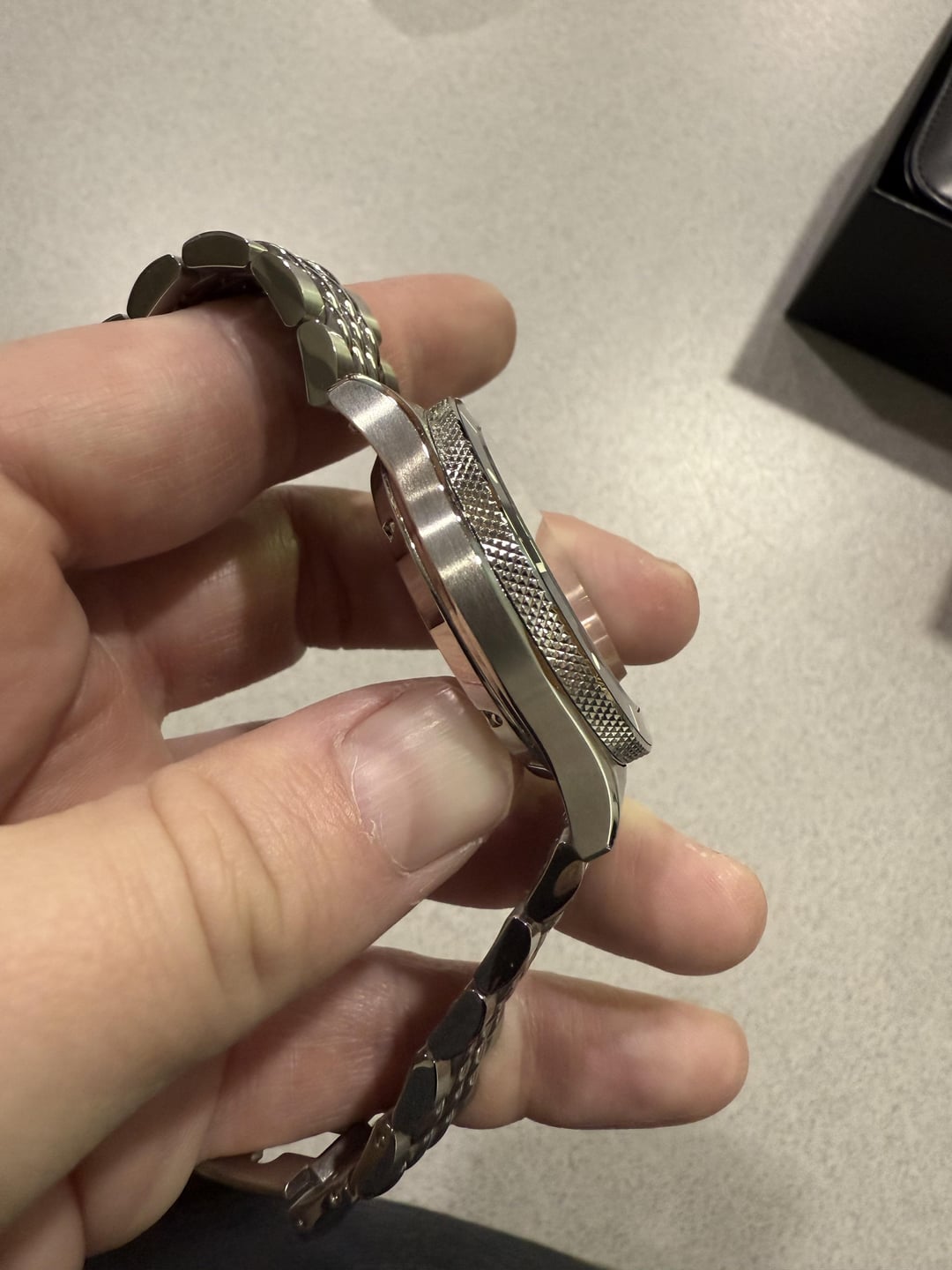 Condition: Bought just two weeks ago. Have worn 4-5 times. Small scuffs on the clasp is the only wear. Unfortunately, it's slightly too big for my wrist. Please see photos. I am happy to show screenshots and receipts to confirm this. Comes with original box and original papers as well as all the extra links (full kit). Nice leather travel case included (includes slots for two watches) Designed in Denmark. Made in Germany. Movement: Automatic Miyota 9019. It’s been at -2 seconds per day since I’ve had it. Size: 40mm case diameter Dial: Beautiful black dial with waffle pattern with gilted hands and edges around markers Bezel: Cereamic unidirectional rotating. Great feeling clicks. Sounds great Bracelet: Beads of rice style, on the fly tool-less micro adjustment (currently sized for 7.25 wrist, all extra links included) Includes: Original packaging, full kit Price: $350 shipped (CONUS only) Payment: Venmo and Zelle only Location: Utah, USA Trades: Not currently considering trades Contact: PM me - happy to provide more pics or wrist shots upon request