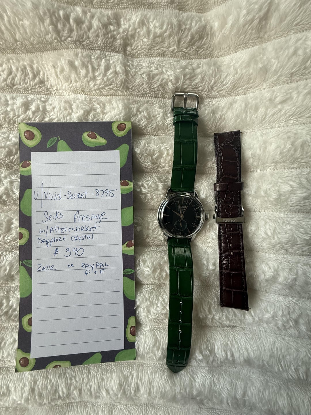 Seiko Presage Green dial With aftermarket Sapphire Crystal installed not original mineral crystal. Comes with 2 straps $390 shipped in CONUS Zelle or PayPal F&F Additional cost to ship outside of US