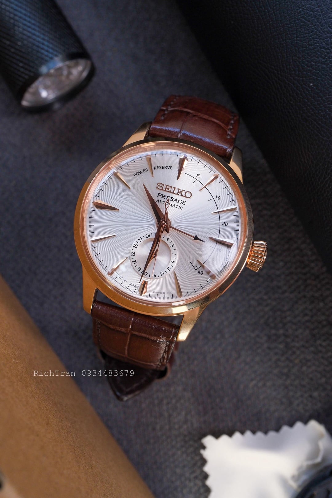 Hi R/watchexchange Up for sale Seiko Presage Cocktail SSA346 ( SARY132 ). Beautiful and elegant Presage Cocktail. The rose gold tone and detailed sunburst dial really stand out. Details: -Movement: 4R57 Automatic with 29 jewels, 21600vph, 42H power reserve -Dial: Silver sunburst, power reserve indicator, and sub-dial date display -Case Size: 40.5mm * 14.4mm, lug to lug 47mm -Crystal: Hardlex, no scratchs -Strap: Original Brown Leather -Clasp: Original Seiko Clasp *Condition: Very Good. There are only a few minor hairline scratches, but nothing major or noticeable during wear. Still has factory protective stickers on the caseback *Included: Box, papers *Timestamp: https://i.postimg.cc/vZfCj87r/DSCF5794.jpg *Photos: https://postimg.cc/gallery/zfLDg1k *Price: 370$ Shipped worldwide via DHL/FedEx Express (insured & tracking) *Payment: PayPal FF or GS (4.6% for buyer) Feel free to PM me for more photos or details. Thanks for looking!