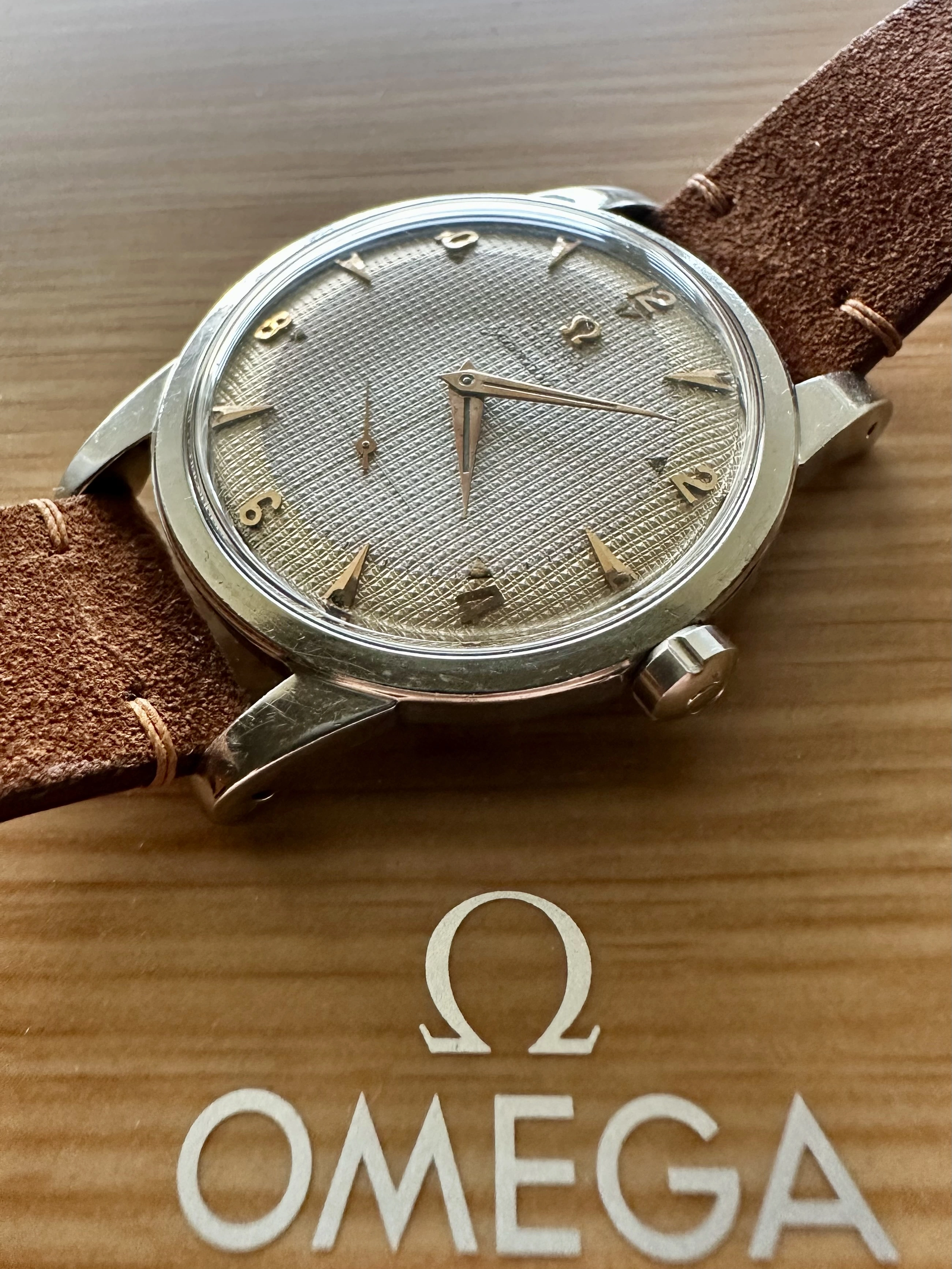 Good day all. Up for sale is a very special watch. If you want something unique, very collectible, and also very seldom available - then you'll want to look at this particular Seamaster 2657 because it is very beautiful and very difficult to find. This stainless Seamaster 2657 has a 36mm case, dauphine hands, rose gold furniture and a stunning two-tone hobnail dial. The case appears to be unpolished, has drilled lugs, and the correct Omega crown. The 1953 caliber 344 bumper was completely serviced from my watchmaker on 6/20/2024. All worn parts were replaced and the service paperwork will be included with the sale.
