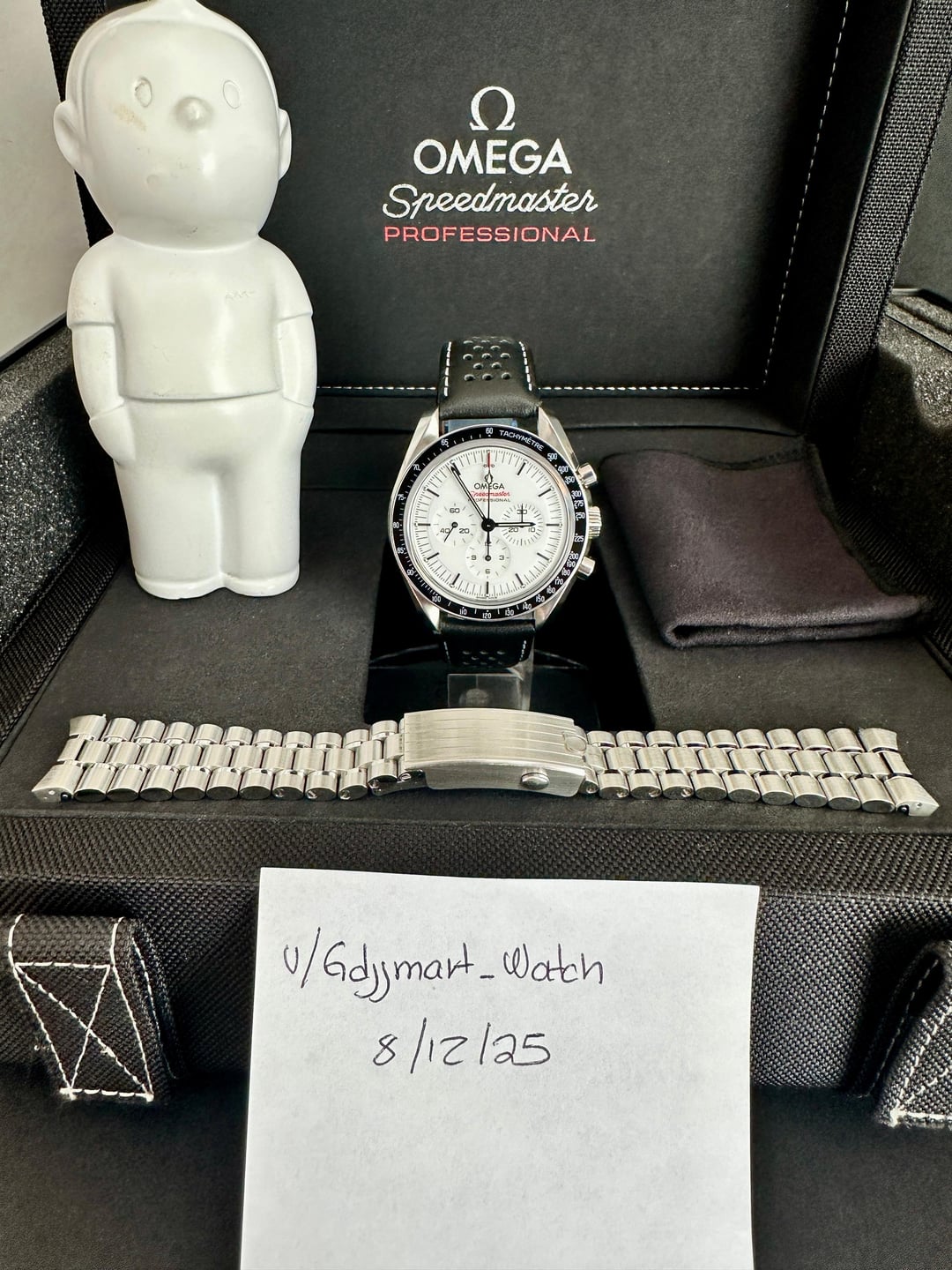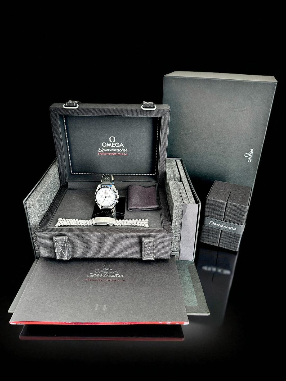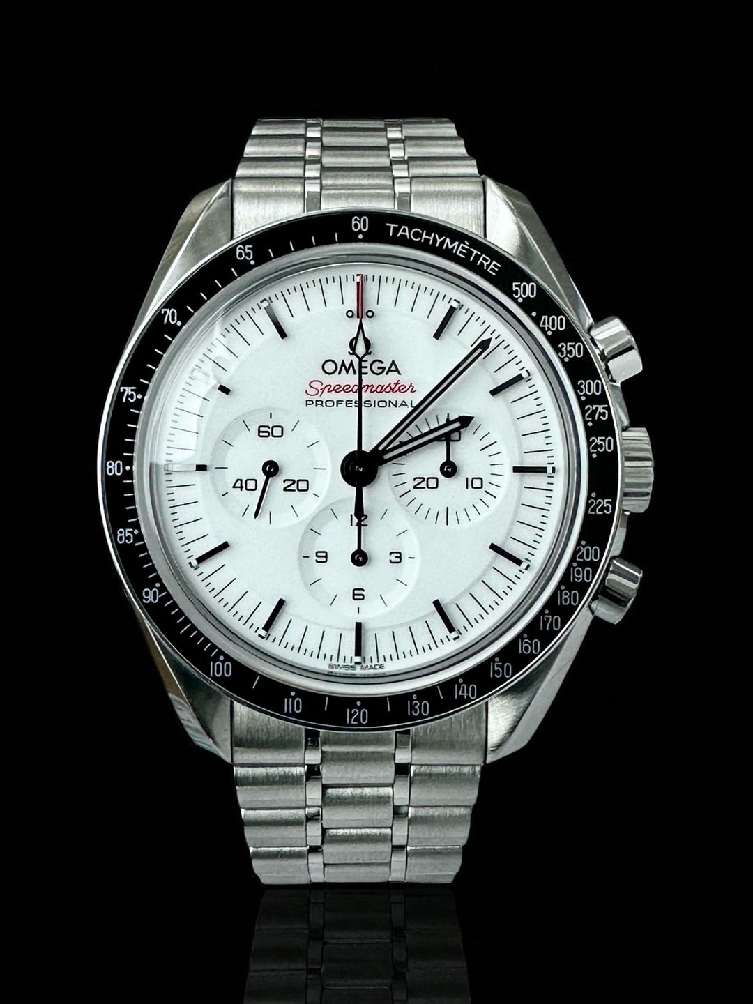 For sale is a Omega Speedmaster Professional Moonwatch White Dial This model is Sold Out at Omega today! Ref. 310.30.42.50.04.001 * **Condition:** Watch is in excellent pre-owned condition, crystal, bezel, case and bracelet clean. * **Scope of delivery:** * Outter Box * Inner Box * Travel Box * Cleaning Cloth * Stainless Steel Bracelet with ***micro clasp adjustment*** * New AM leather racing strap * No cards (Year is at least 2024, year of launch) * **Price: $6,999** Shipped Fedex Insured CONUS Watch ships from San Diego, CA face to face transaction Ok for local buyers or Facetime at any time. Plenty of references across different platforms. Follow us on Instagram at **Dopplertimepieces** Thanks, please comment before DM *The Speedmaster Moonwatch is one of the world’s most iconic timepieces. Having been a part of all six moon landings, the legendary chronograph is an impressive representation of the brand’s adventurous pioneering spirit.* *Presented on a polished-brushed bracelet, this 42 mm Moonwatch in stainless steel features sapphire crystal glass on the front as well as on the caseback. Inspired by the 4th generation Speedmaster style worn on the moon, it also includes an asymmetrical case, a white lacquered step dial with applied OMEGA logo and indexes, Moonwatch style hands, and the famous dot over 90 on the black anodised aluminium bezel ring.* *The watch is driven by the OMEGA Co-Axial Master Chronometer Calibre 3861, which powers the small seconds sub-dial, 30-minute recorder and 12-hour recorder, along with the central chronograph function.*