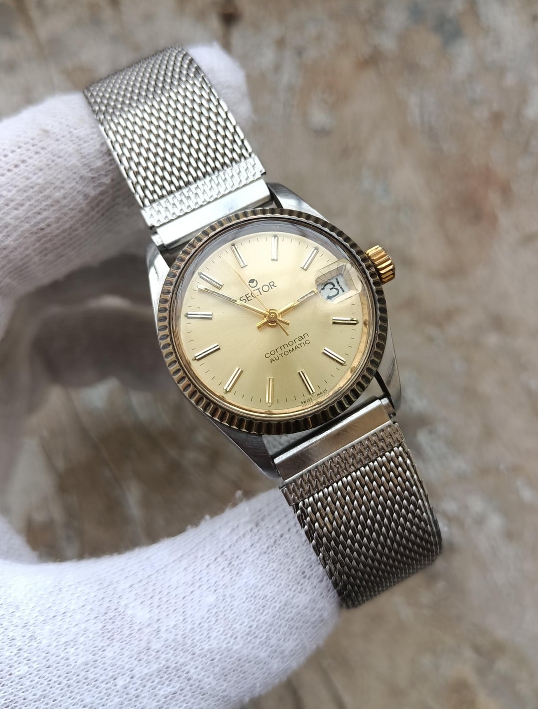 SECTOR Cormoran Automatic Watch. Cal. 2671. Description and Features: Overall this is in good Working condition. Gold Dial With Fluted Bezel. Automatic (self-winding) Crystal: Acrylic Crystal. Power Reserve: \~38 Hours. Movement: Swiss Made. Case Material: Stainless steel. Bracelet: Mesh Stainless steel. Functions: Date display at the 3 o’clock position. Wrist Fit: Fits wrists up to approximately 7.5 inches. Please see the pictures carefully. SPECIFICATIONS: Movement: self-winding, Case Diameter, 35 mm, Thickness 12 mm, Lug Width 18 mm, Lug to Lug 39 mm, Watch only. Please comment before messaging. Payment Method: PayPal friends & family, Crypto, Payoneer & Binance Only. Shipping From FedEx Express Shipping. Price $135 Shipped. After payment confirmation the scheduled shipping time will be 2-3 working days.