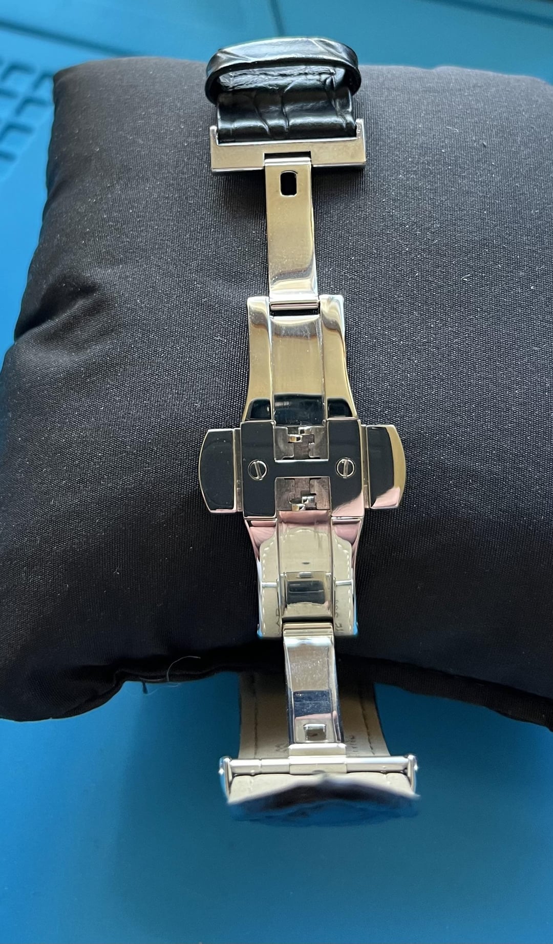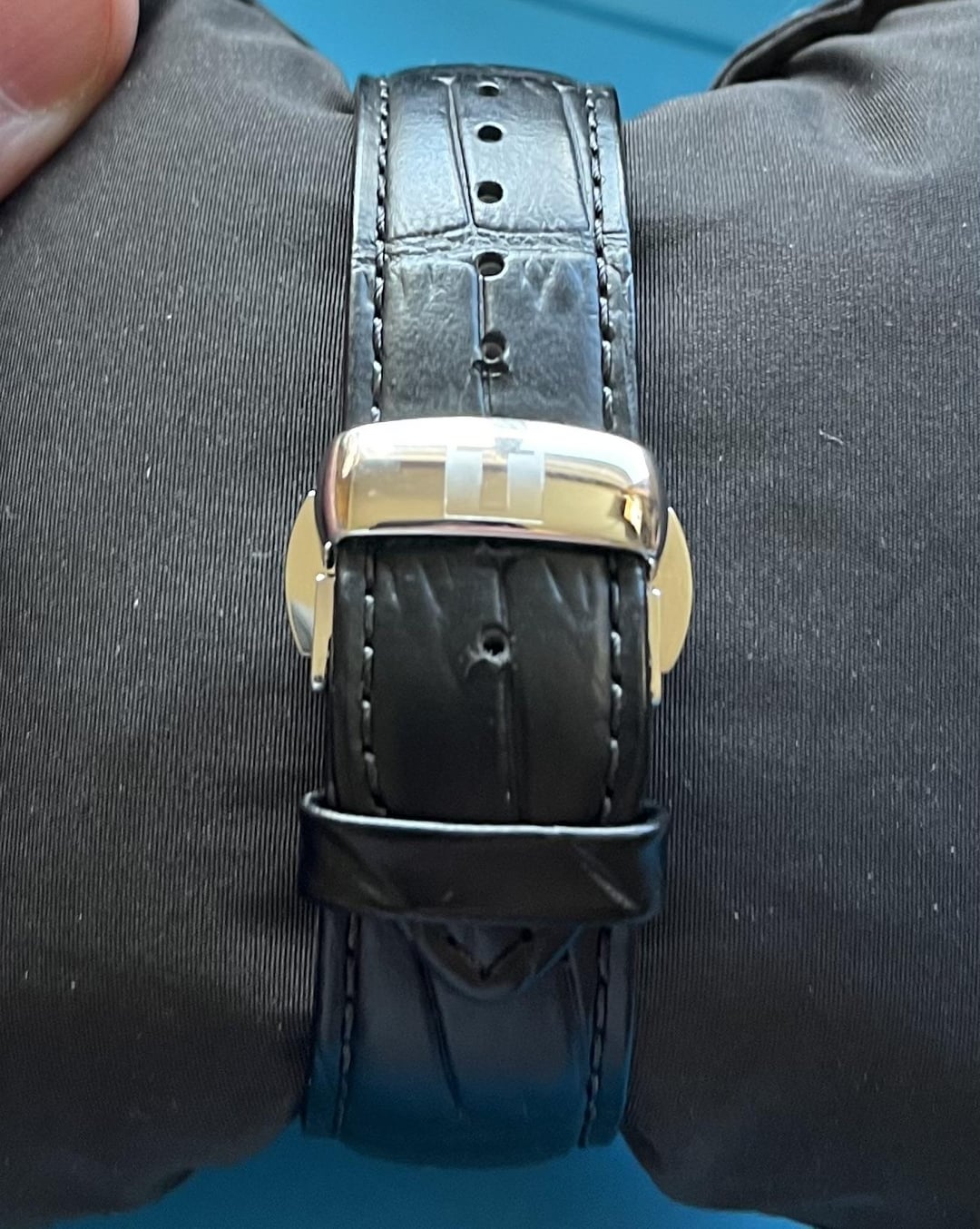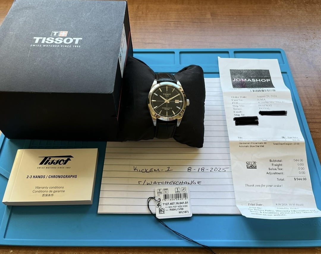 Tissot Gentleman Powermatic 80 40mm Blue Cross Hatch Dial and Original Alligator Leather Strap #T127.407.16.041.01 I am the original owner and purchased this watch new from Jomashop in August 2024. I’ve only worn it a handful of times and it’s in excellent used condition with only light signs of wear. I circled the worst blemish (still fairly small) I could find on the bezel in one of the pics. Also has light scratches on under side of lugs from switching straps. Comes with original black alligator strap with deployant clasp, hang tags, owners manual, inner box, outer sleeve, and original receipt from Jomashop with 2 years remaining on their in-house warranty I believe. Functions perfectly and is running ~ +/- 1 second per day. Just going a different direction with my small collection. Asking $350 via Zelle or Cash App. Includes USPS Priority shipping within US. Please comment here then send a PM for communication. Thank you!