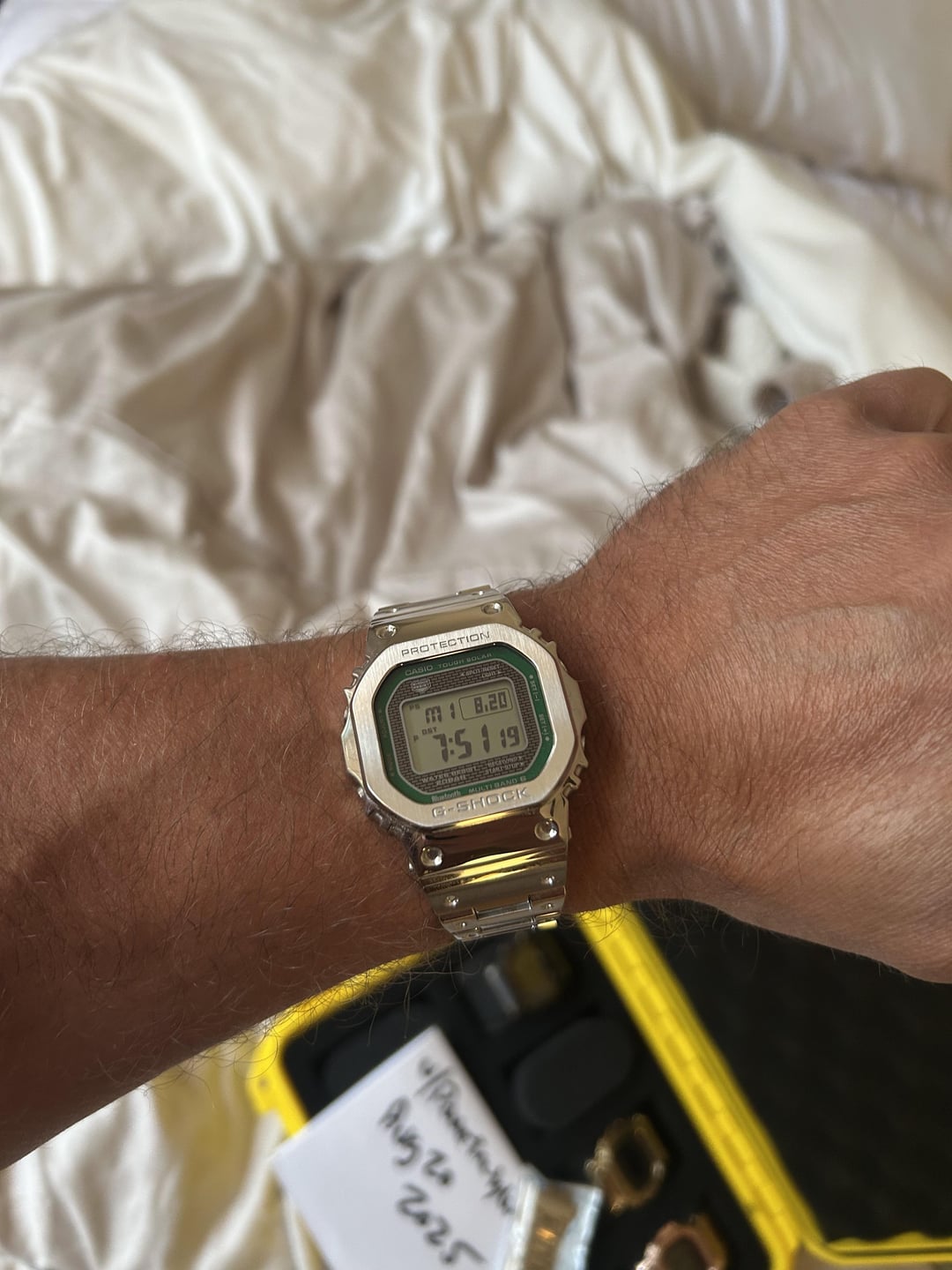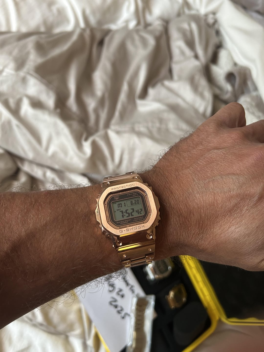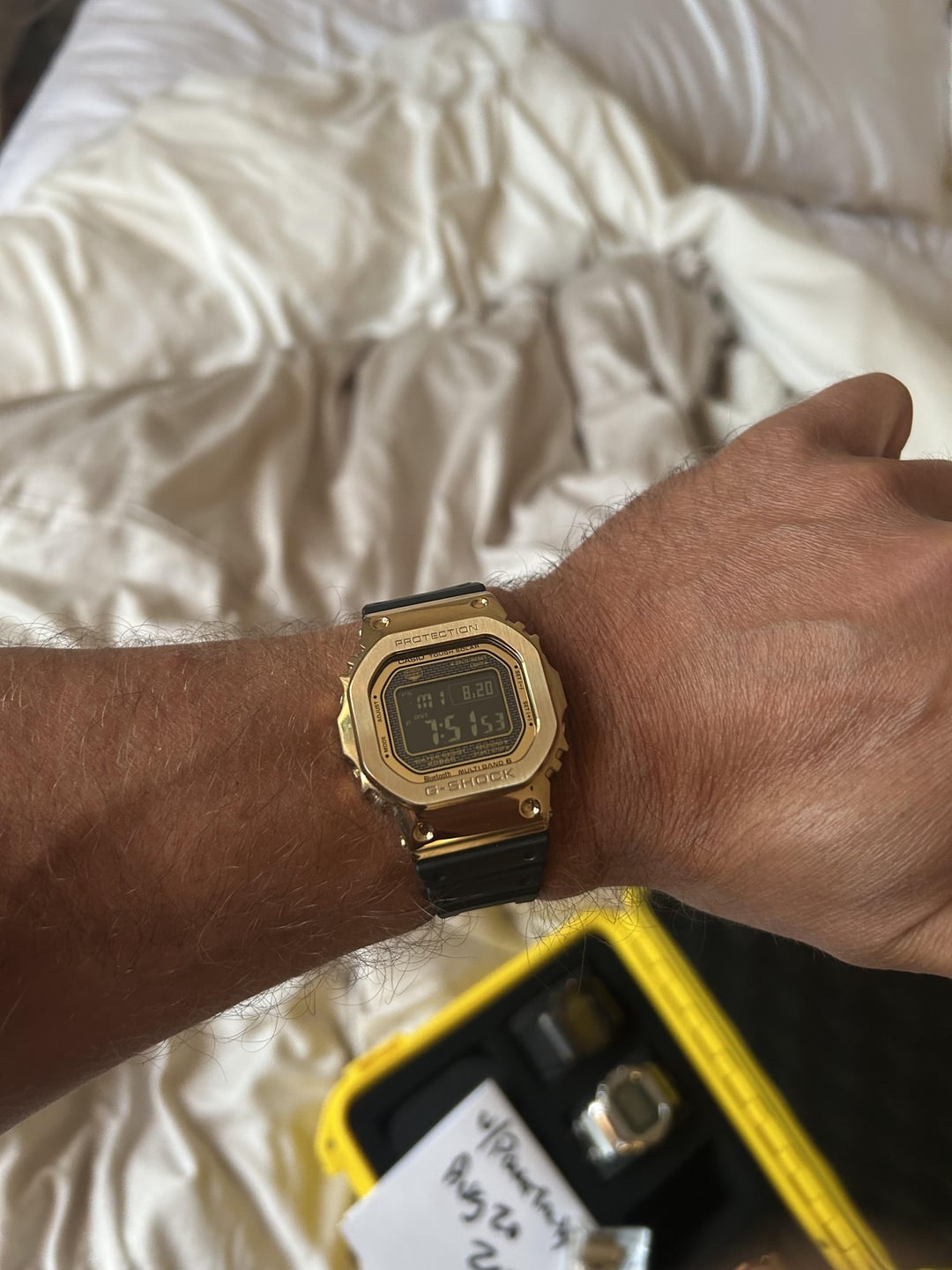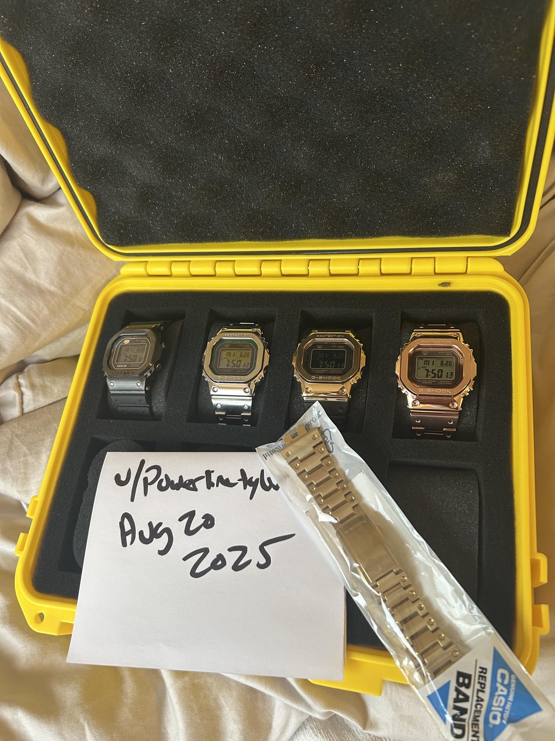 Hey there. All watches come with near full warranty from AD as well as their respective boxes and papers. From left to right MRG-B5000R-1 - Strap cut to about 7.5” wrist watch has been worn once. 9/10 condition due to the strap being cut. Asking **2400 shipped** GMW-B5000D-3 - Recent model, ideal full metal g really. Spices things up from the black border with this nice green. A looker. 8/10 is conservative but due to hairlines it’s a fair rating. **SOLD** GMW-B5000GD-9 - Gold Blingmaster but I sourced the OEM Kolor limited strap. The Kolor version of this watch is nearly identical but fetches insane prices. I opted for the blingmaster, removed the bracelet, and sourced the Kolor strap for about 100 bucks. Killer combo. **350 shipped for the whole package with strap and bracelet** GMW-B5000GD-4JF - Limited edition rose gold. Unworn, 9.5/10 stickers removed and bracelet sized. **400 shipped** I’m not a dealer, I’m a watch collecting lunatic. Take my losses as your gain