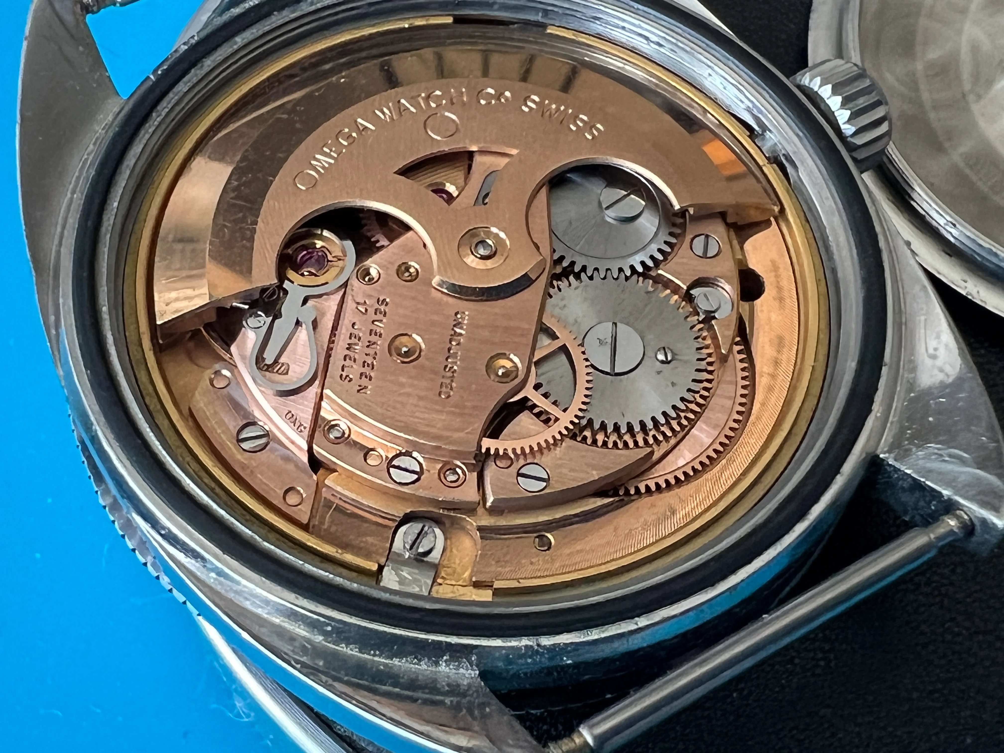 The bezel turns freely, the original pip is partially intact but does show some damage. Crown is original and crystal is generic. Quickset date function works as it should.