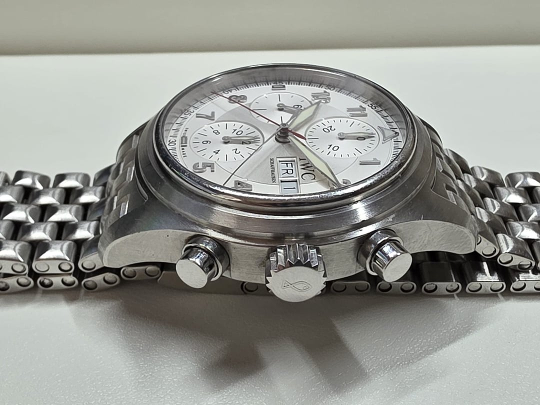 **IWC Doppelchronograph Spitfire Pilot’s Watch** **Ref: IW371348** This watch is in great condition for its age, remaining unpolished with honest signs of wear throughout. It’s running well on the timegrapher, and all chronograph and rattrapante functions operate as they should. It will come watch-only, housed in an IWC travel case. The rare “pyramid” bracelet is generously sized and will fit wrists slightly over 7.5 inches. A very cool piece of IWC history at an excellent value. Price = $3,499 shipped Pics & Timestamp = [https://imgur.com/a/K01js5o](https://imgur.com/a/K01js5o) IG = watchfornia Cheers, Adam