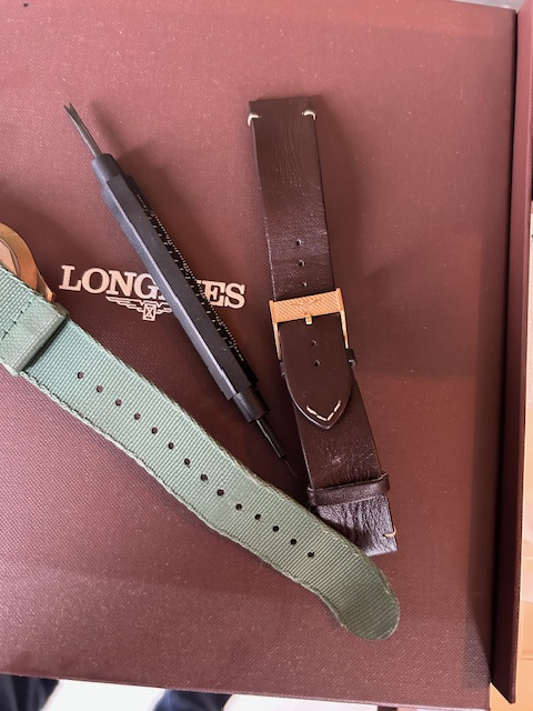Elle est fournie avec bracelet nato vert et bracelet cuir marron et outil d'origine pour le changement de bracelet.