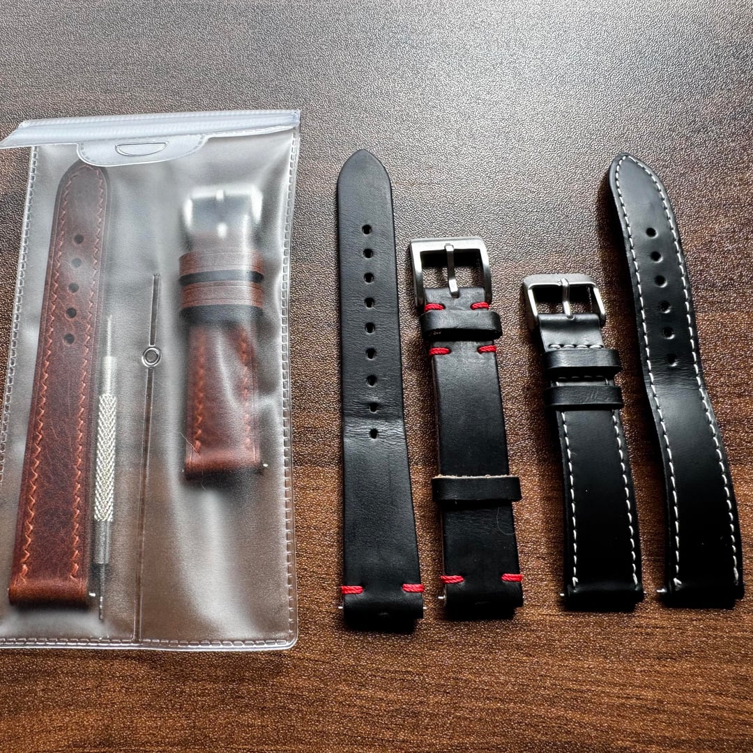 Selling these 3 18mm straps: BNIB: Custom Made Brown Leather 18mm With Curved Ends. BNIB **$40** lightly used: Hemsut 18mm Horween leather black w/ red stitching **$20** VinaCreations 18mm Black Leather w/ white stich **$15** shipped $50 shipped for all 3