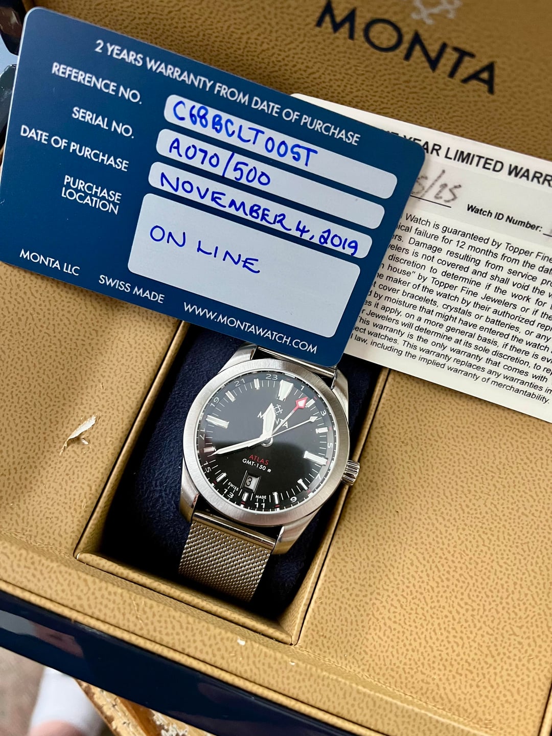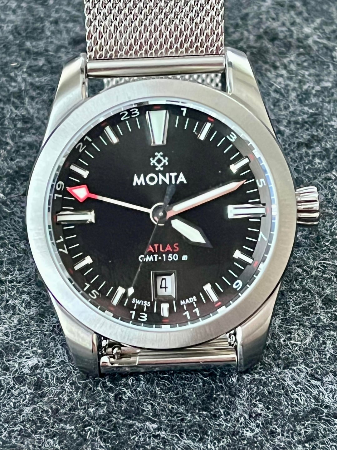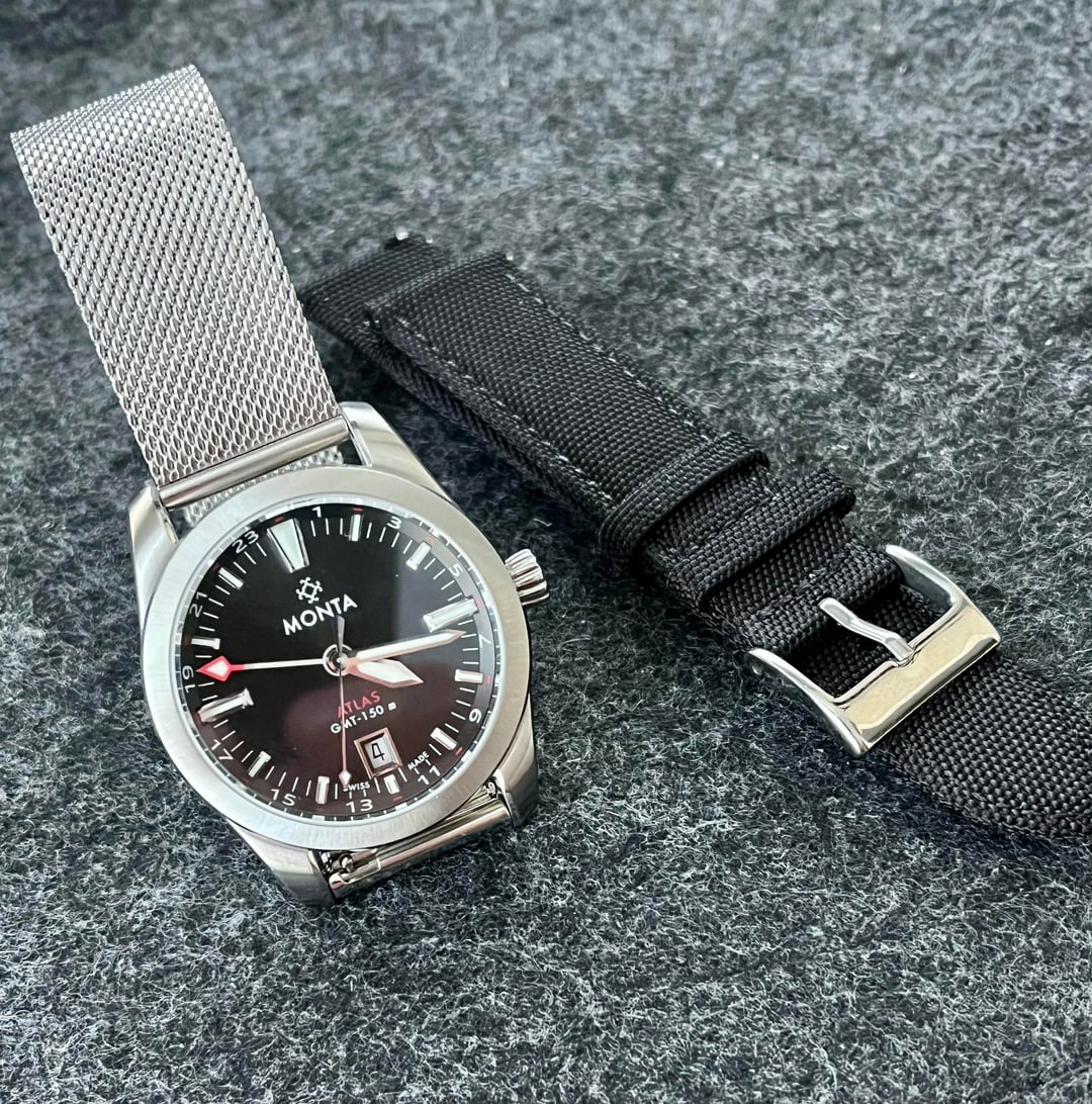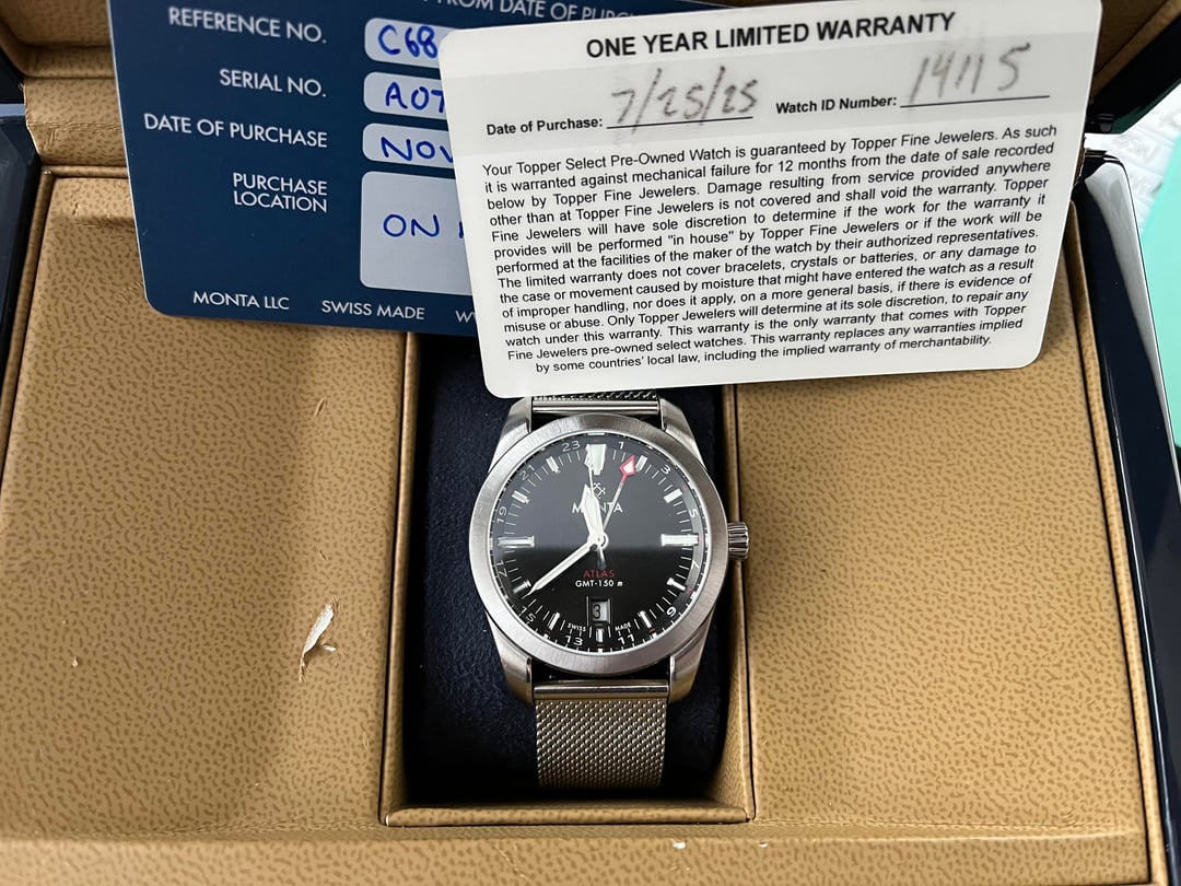 Selling a **Monta Atlas GMT** with a charcoal dial. Very good condition, keeps **excellent time**. **No Monta bracelet included**, making it perfect for NATO or strap enthusiasts. **Reference & MSRP:** * [Monta Atlas Charcoal Dial](https://montawatch.com/products/monta-atlas-charcoal-dial?utm_source=chatgpt.com) * Current MSRP: $2,150 (on bracelet) **Measurements:** * Diameter: 38.5mm * Lug width: 20mm * Thickness: 10.7mm * Lug-to-lug: 47mm **Condition & Warranty:** * Very good overall condition * Under **Topper Jewelers' pre-owned warranty until 7/25/2026** **Included:** * AM Mesh bracelet * Black Cordura strap * Monta box (slight break on one hinge, opens/closes fine) * Booklet & cleaning cloth * Warranty card (expired 2019) * Topper Select warranty card (valid 7/25/2026) **Price:** $699 shipped (CONUS) **Payment:** Zelle or Venmo F&F **Terms:** No trades **Note:** This watch does **not include the Monta bracelet**, making it ideal for strap enthusiasts looking to mix and match.