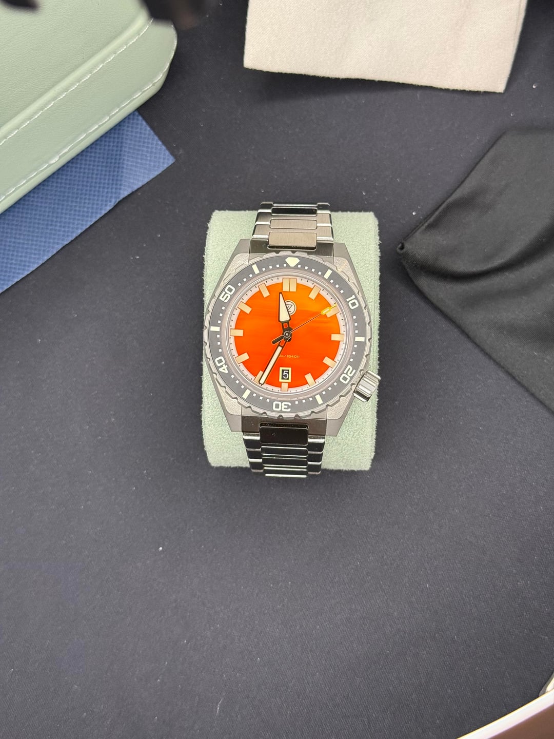 Price is $550 plus shipping ($579 MSRP). Shipping to CONUS via USPS or UPS. NY based. Zelle preferred with PayPal F&F, PayPal G&S+3.5% and Venmo with References as an option. Watch to be shipped within next 1-2 business days after payment. Case Size: 44mm Movement: Miyota 9015 Case Back: Closed Crystal: Sapphire crystal Band: stainless steel with quick adjustment clasp Water Resistant: 500m Lume: Yes, lumicast with chapter ring (crazy lume) Selling a Zelos Thresher 44 Agate #54/100 SOLD OUT. The watch itself is like new condition. It’s a great value diver with tremendous capabilities and a sweet agate orange dial. box, and 8/2025 card included. Watch is sold on an "As-ls" basis.