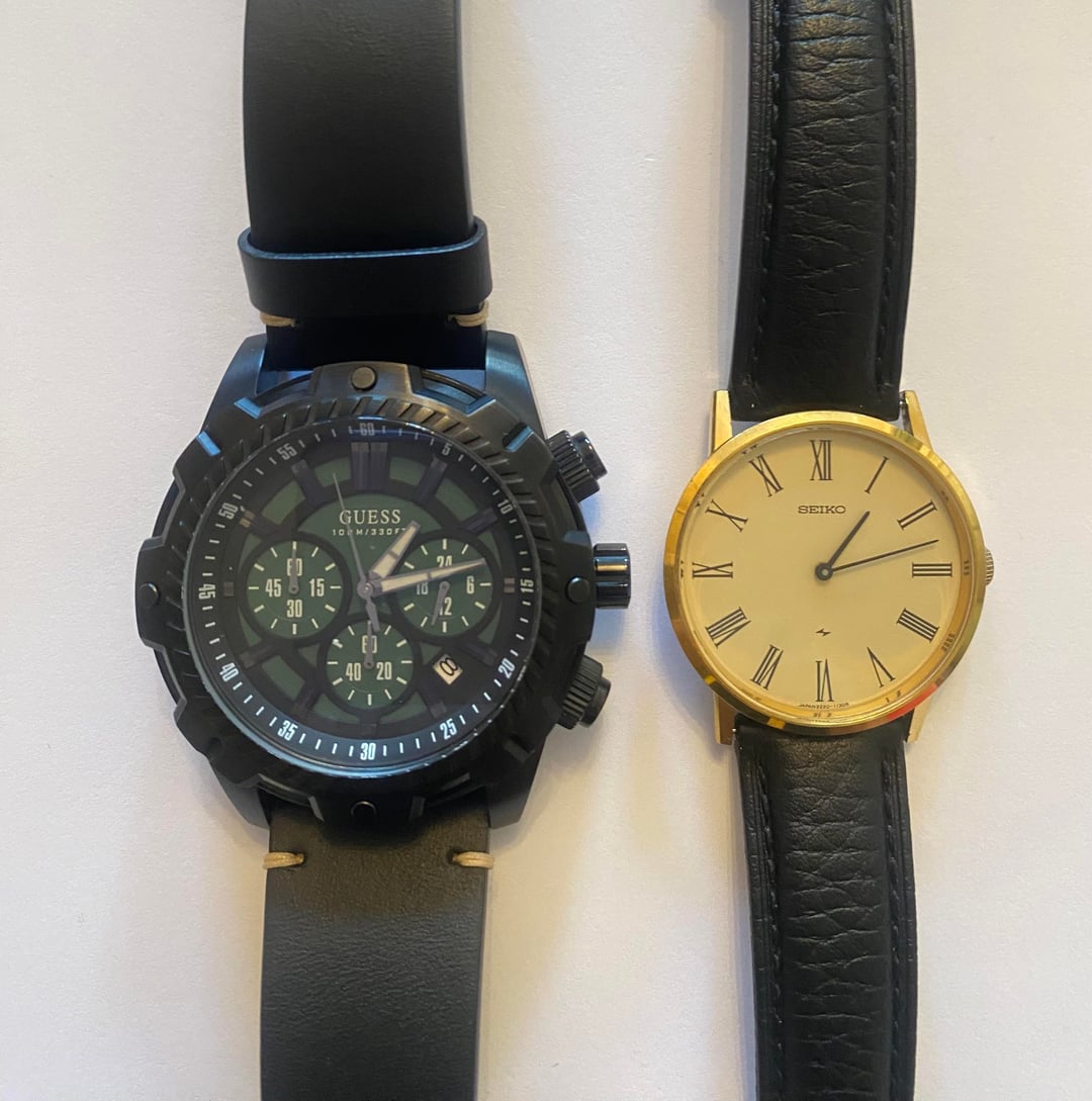 Greetings Watchexchange, **Albums** * (https://imgur.com/a/61MThUg) * (https://imgur.com/a/4rVw9uJ) * 💵 PayPal FF & Zelle (Preferred) * Ships within 24 hours of purchase 🚢 USPS (US Only) International Available at an additional cost based on location. **Seiko Chariot 2220-0430** * Manual Winding 2220 movement @ 28,800 bph Hi Beat. * 7.8mm Thick * Case: 33mm * Lug to Lug: 38mm * Strap: Leather * Manufacturing Date: 1977 * No Box 📦 or papers * Asking $150 🚢 💵 * Condition: Clean body and plating given age with some scratching as shown via the pictures and video. Crystal shows slight scratching as you tilt the watch in the light. Runs well and comes with the original strap and replacement as pictured given the age of the older set. **Guess Chronograph Watch W0038G2** * Condition: worn a couple of times. No discernible wear and tear under the light on the case. Straps are in good condition and adjustable for size with an additional leather quick release straps. Recent battery replacement. Runs well and the Chronograph is fully functional. * Case size: 45 mm * Case Thickness: 13mm * Case material: Stainless Steel * Band width : 21mm * No box or papers * Japanese Quartz movement * Ask: $50 🚢