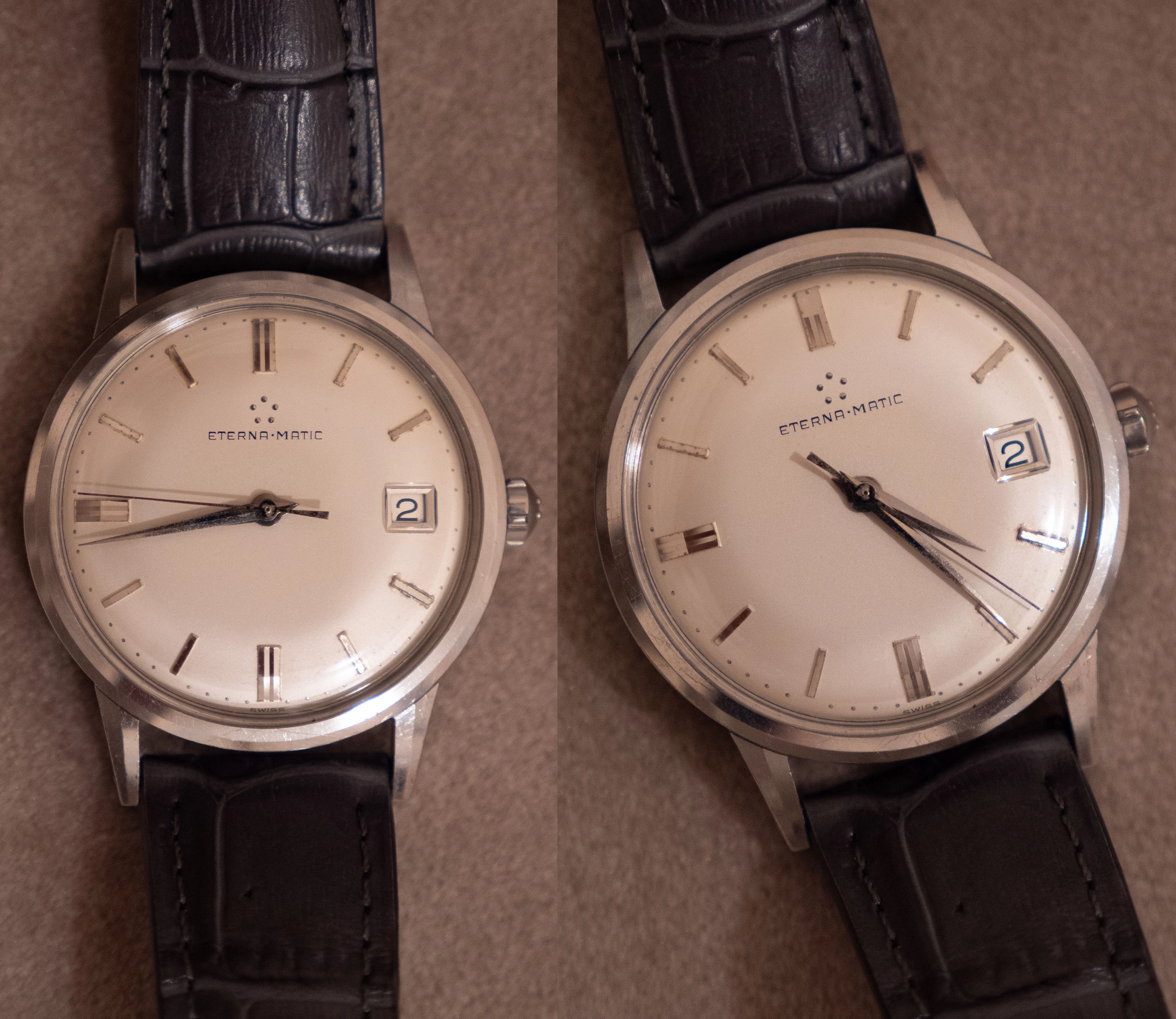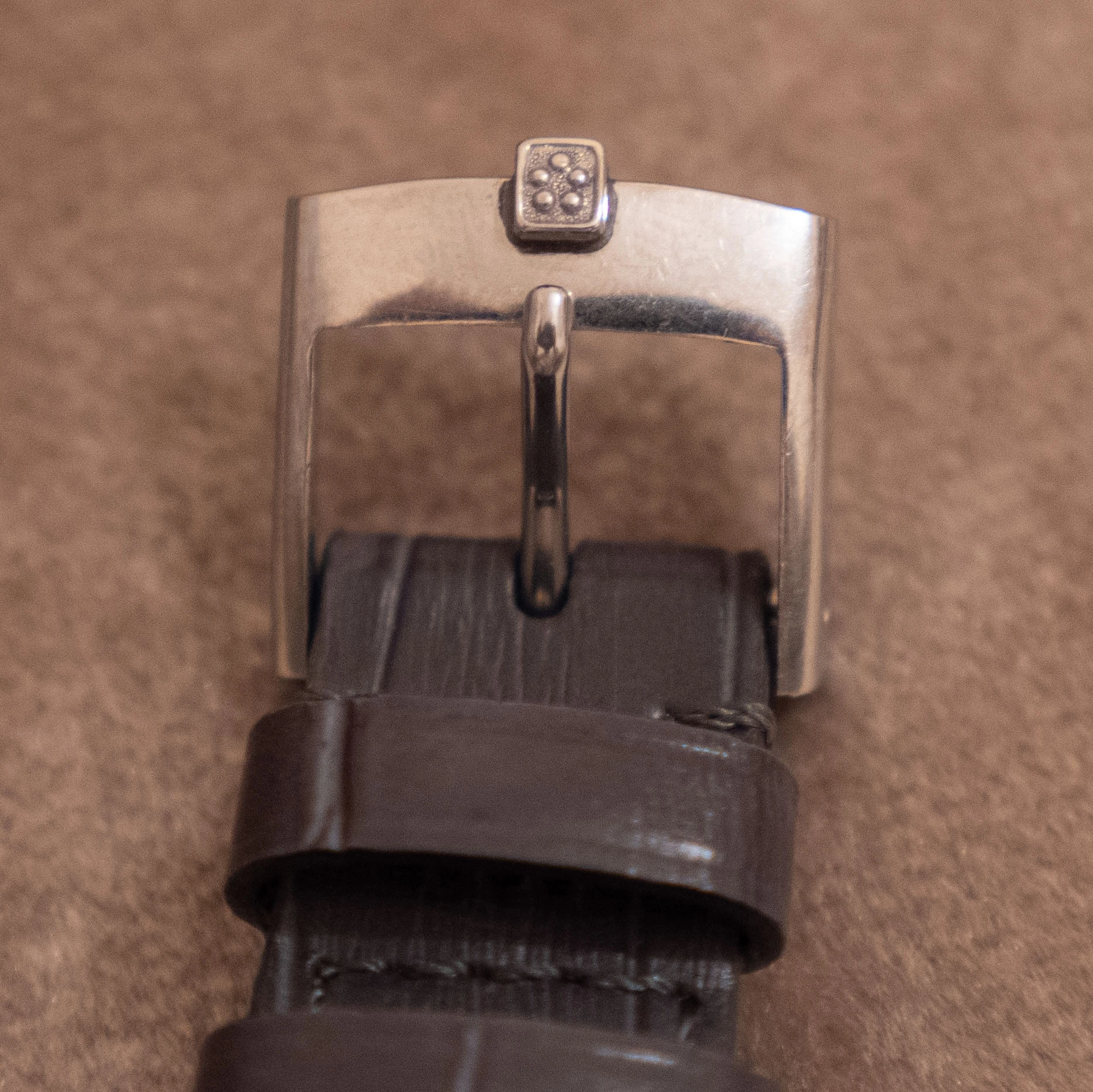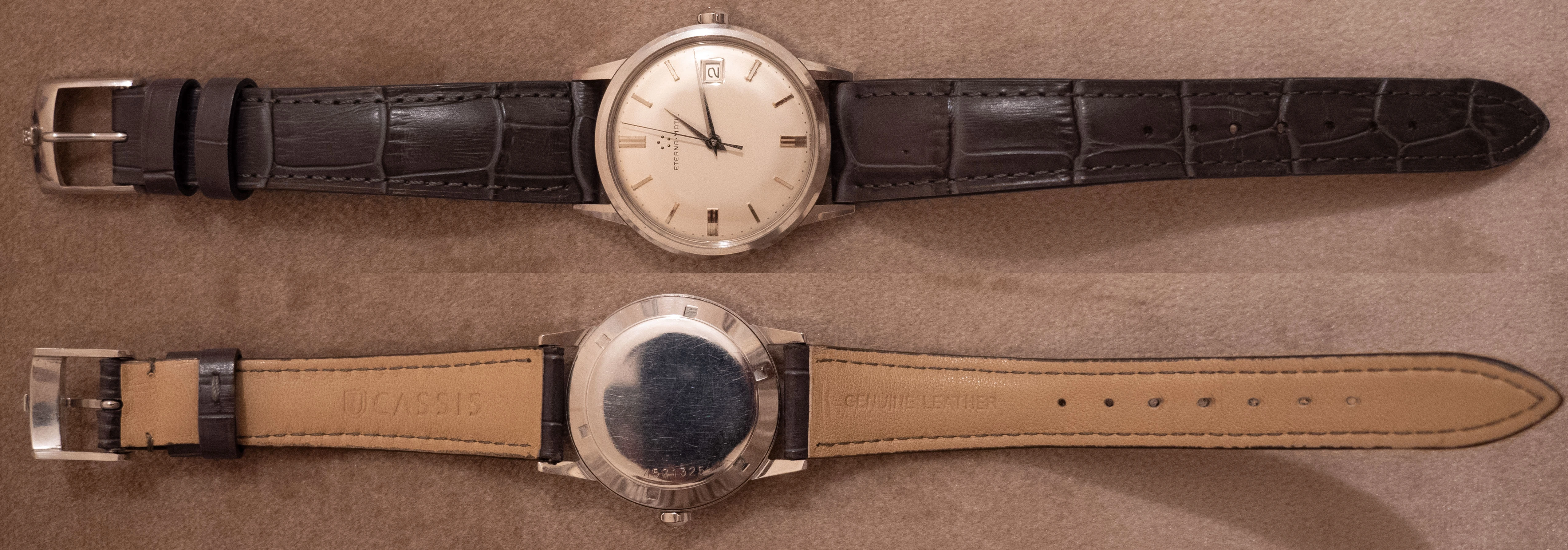 - The watch comes with an aftermarket grey leather strap. An original Eterna buckle and its pin are also in the package.