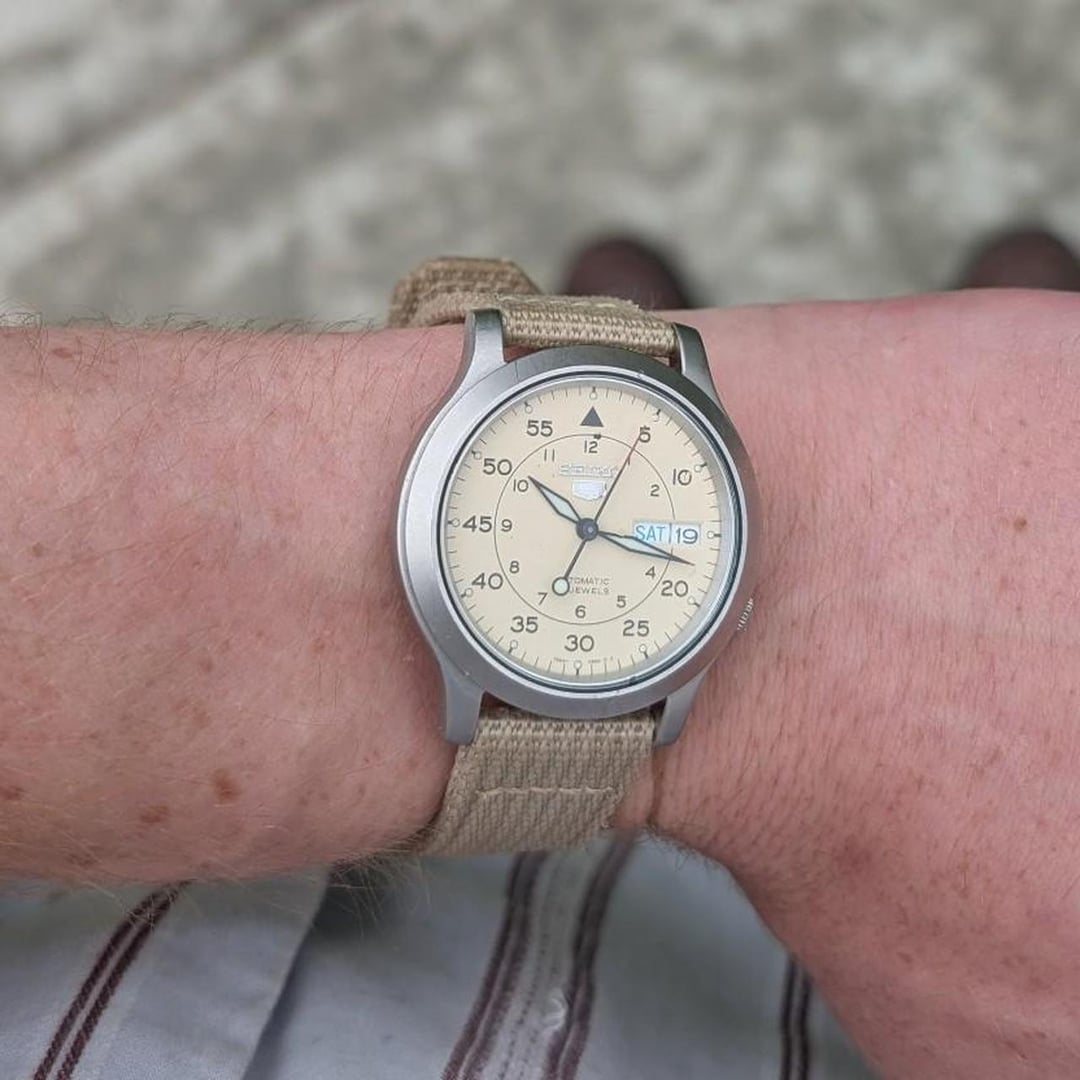 | SEIKO 5 7S26-02J0 Day/Date Beige Dial Automatic Military Watch - New with tags ni-credible (276) |