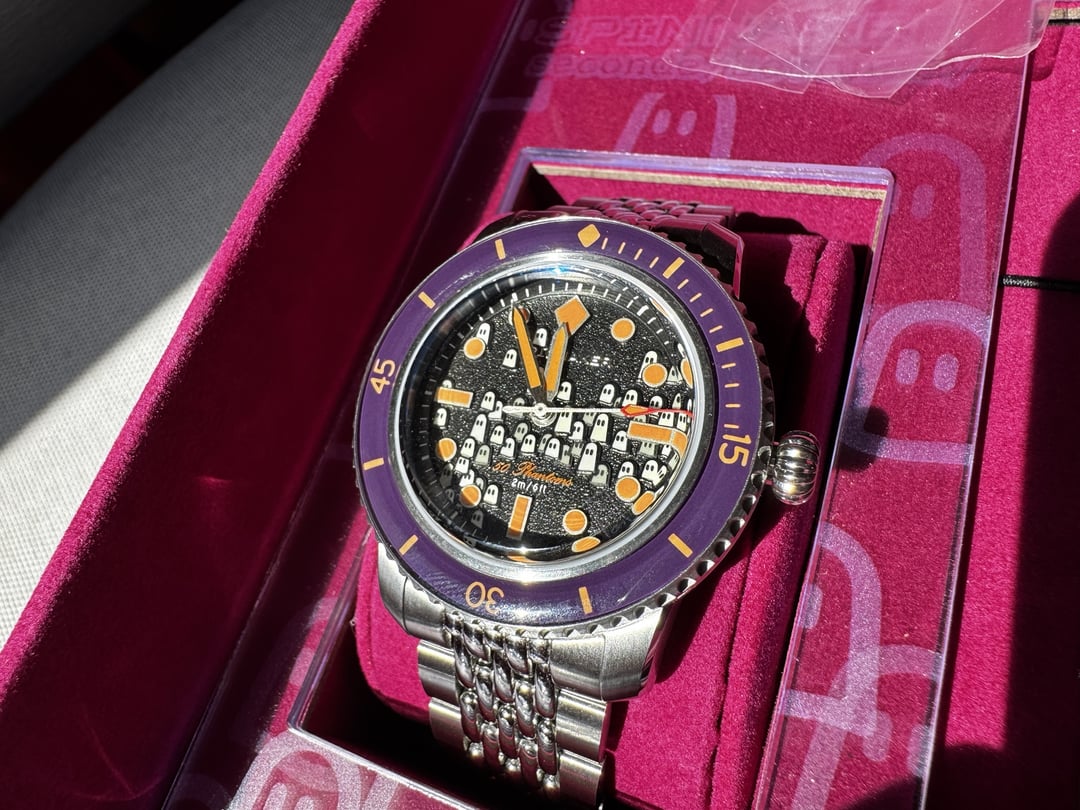 Up for grabs is my Spinnaker × seconde/seconde/ “50 Phantoms” (Ref. SP-5146-01). This is the quirky ghost-dial collab piece with insane lume, purple bezel, and the beads-of-rice bracelet. Limited to 1803 pieces worldwide. It’s fun, it’s different, and it’s been worn carefully but is in excellent condition. Time to thin the herd a bit. Specs: 40mm stainless case Miyota 9039 automatic movement 150m WR, sapphire crystal front and back Purple bezel insert lume monster (literally) What you get: Watch on stainless steel bracelet (all links) Rubber strap Leather strap UV flashlight (factory accessory) Inner and outer boxes, hang tag, papers Condition: Very clean overall. Minor desk rash on clasp/bracelet as expected. Rubber and leather straps are in new condition. Crystal and bezel are flawless. Keeps time within spec. Price: $675 shipped & insured in the US (PayPal F&F preferred, G&S add 3%). Not looking for trades right now. If you really want the baseball cap, that'll be an extra $50. I like it. photo album: [https://imgur.com/a/Bbv8a9n](https://imgur.com/a/Bbv8a9n) timestamps, all watches in timestamp album are available for sale: [https://imgur.com/a/timestamps-watchex-DkWgjgf](https://imgur.com/a/timestamps-watchex-DkWgjgf) Other watches I have for sale: BALL Trainmaster Manufacture 80 Hours / In-House COSC Movement / Blue Dial (40mm) – $1300 Shipped/Insured: [https://www.reddit.com/r/Watchexchange/comments/1nfzz16/wts\_ball\_trainmaster\_manufacture\_80\_hours\_inhouse/](https://www.reddit.com/r/Watchexchange/comments/1nfzz16/wts_ball_trainmaster_manufacture_80_hours_inhouse/) Low-cost watches - Boderry and Megalith: [https://www.reddit.com/r/Watchexchange/comments/1kg9mbo/wts\_lowcost\_watches\_boderry\_and\_megalith/](https://www.reddit.com/r/Watchexchange/comments/1kg9mbo/wts_lowcost_watches_boderry_and_megalith/)