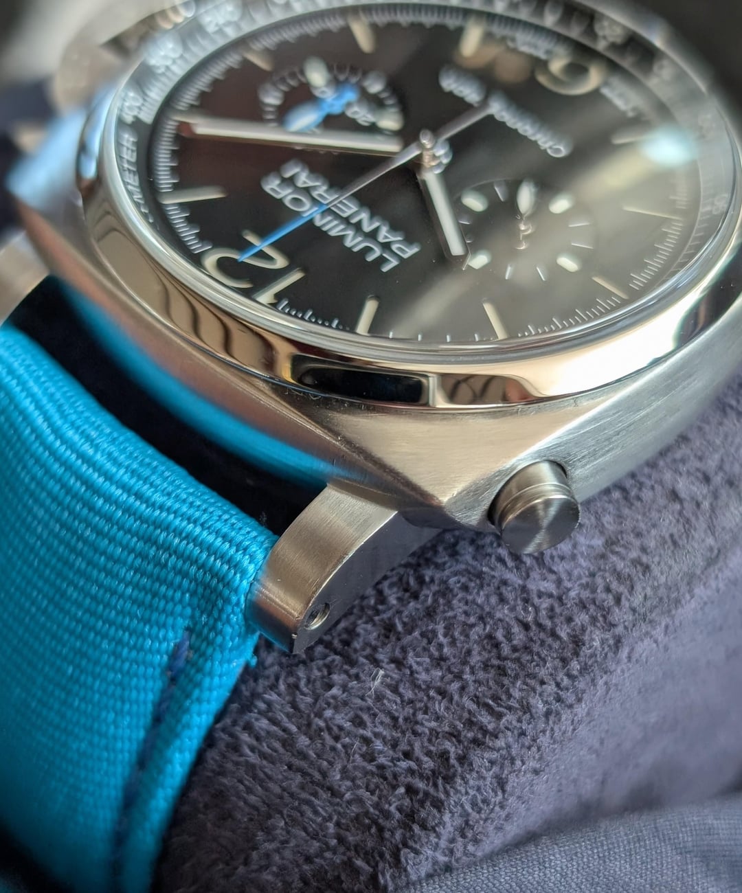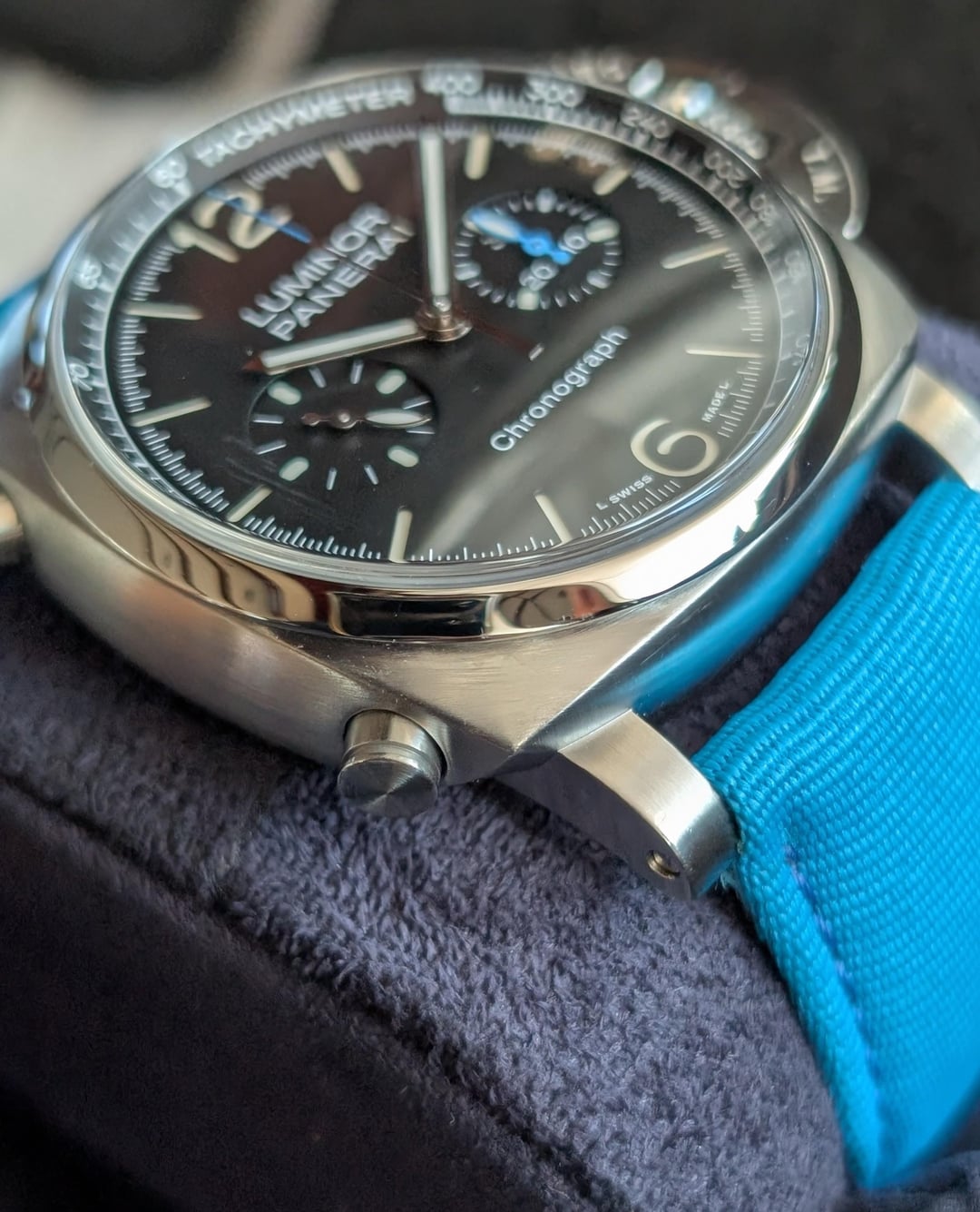 Available is this super fun Panerai Luminor Chronograph! On this OEM blue strap, it looks like a Speedmaster and a Panerai had a love child in Miami. Reference: PAM01109 MSRP: $10,500 + tax Year: 2023 w/warranty to 2031 Delivery contents: double boxed, watch, warranty card, tools, 3 OEM Panerai straps, everything in impeccable condition Available for $7250 including overnight fully insured delivery to your local FedEx. Pickup in Cape Coral FL. Zelle/wire. IG wristsofluxury