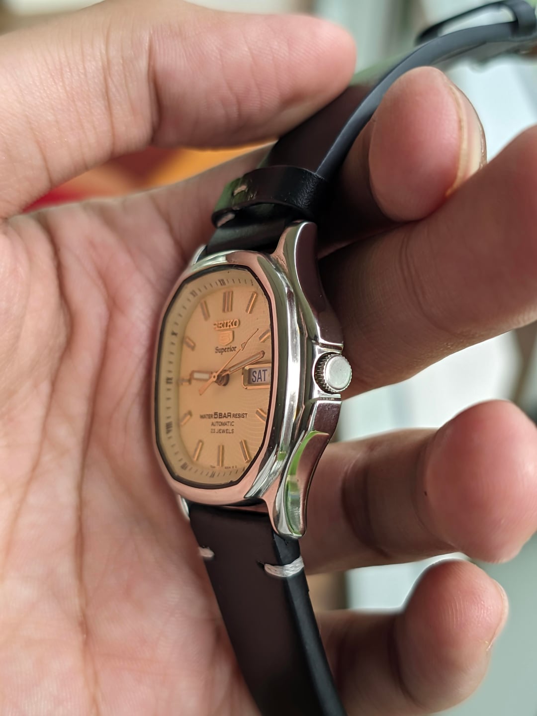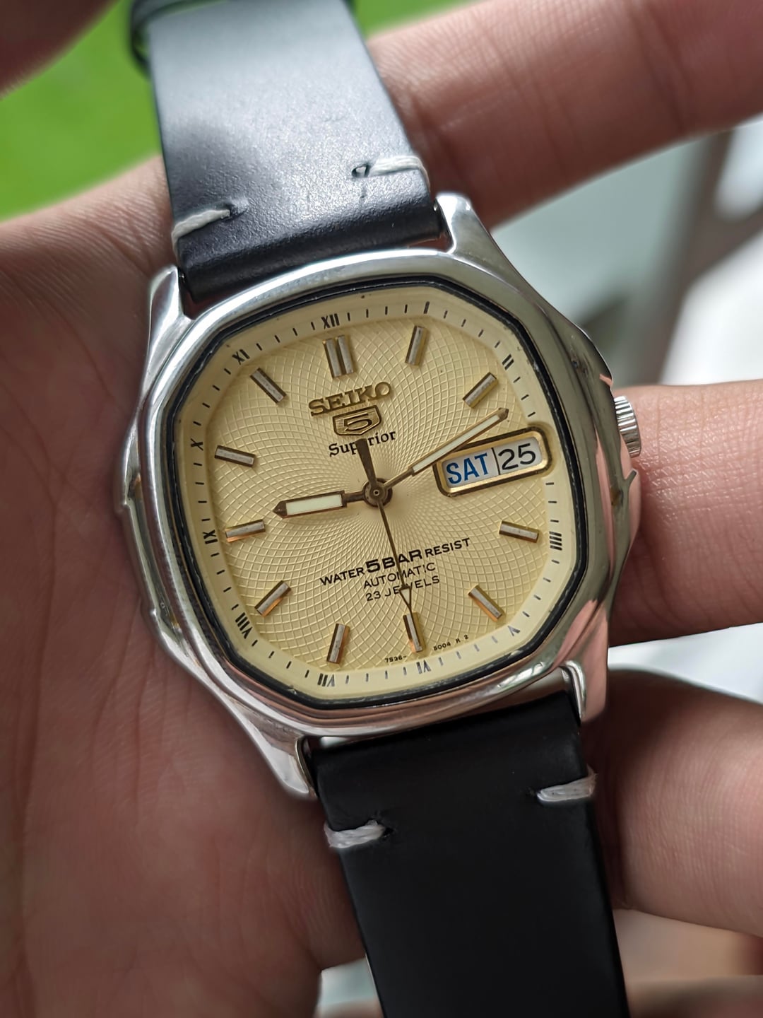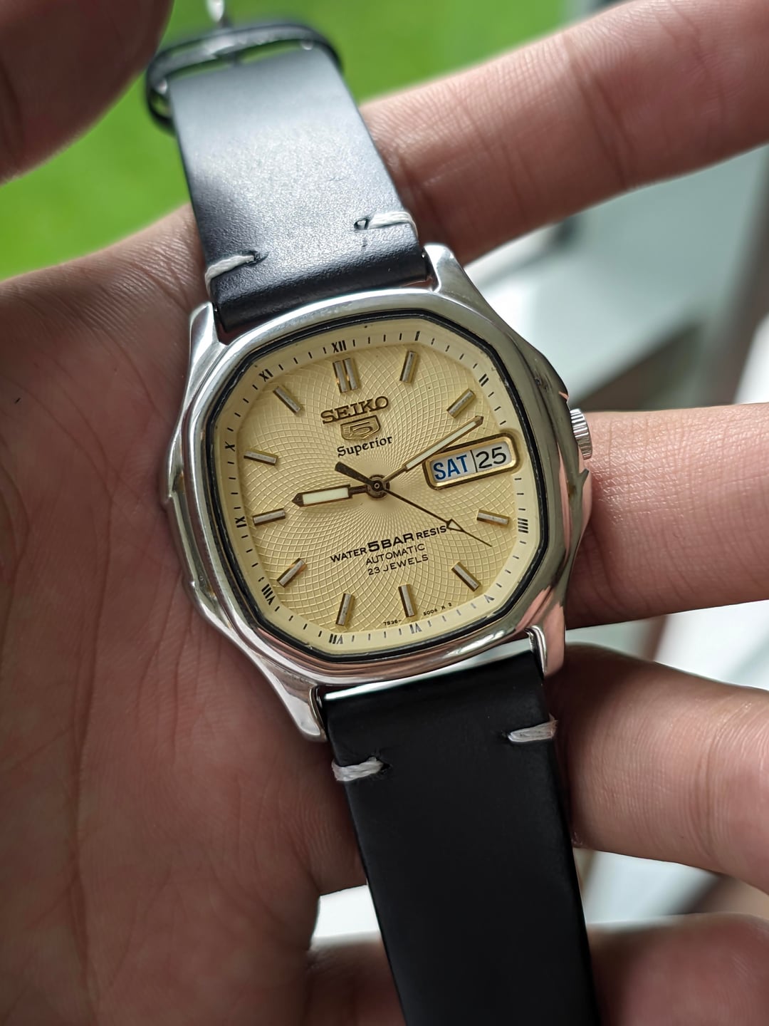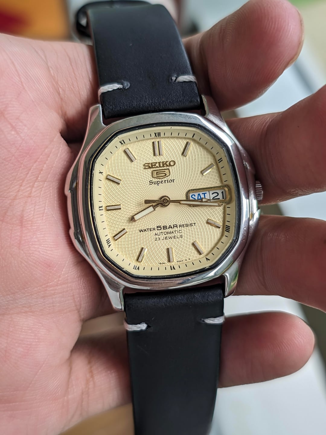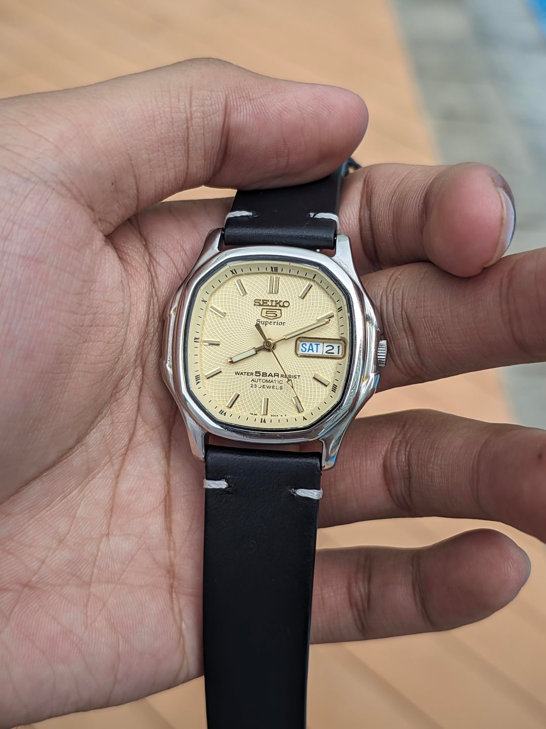 Hello! r/watchexchange, up for sale is a coveted Seiko 5 Superior with an ivory coloured whirlpool dial. This is an automatic watch from the 90s that was mostly made available in the South East Asian & Japanese market as an upgraded version of the Seiko 5. It features a coveted whirlpool dial and a unique TV case shape. Condition: - Watch has just been recently serviced, runs perfectly well. - Case is in broadly okay condition with minimal scratches at the front. There is some damage to the back of the lugs, which is not visible when worn - Case was previously polished to remove a gold finish. In my opinion this is an aesthetic improvement, with it giving the watch a new lease of life after the gold plating faded over time in South East Asia's tropical climate. I would personally rate the polishing job as being exceptionally. - Watch comes with a replacement box and a replacement strap. No papers Timestamp: https://drive.google.com/file/d/1sPLpwa1omP9YSyGLfhkyx3DG3LdXaN8Y/view?usp=drivesdk Pricing, Payment & Shipping Price: $350 Shipped via DHL express Payment Method: I heavily prefer WISE payment because it has substantially better rates but will take PayPal F&F or G&S with 4.4% Paid by buyer. No trades. Willing to answer questions and hear offers