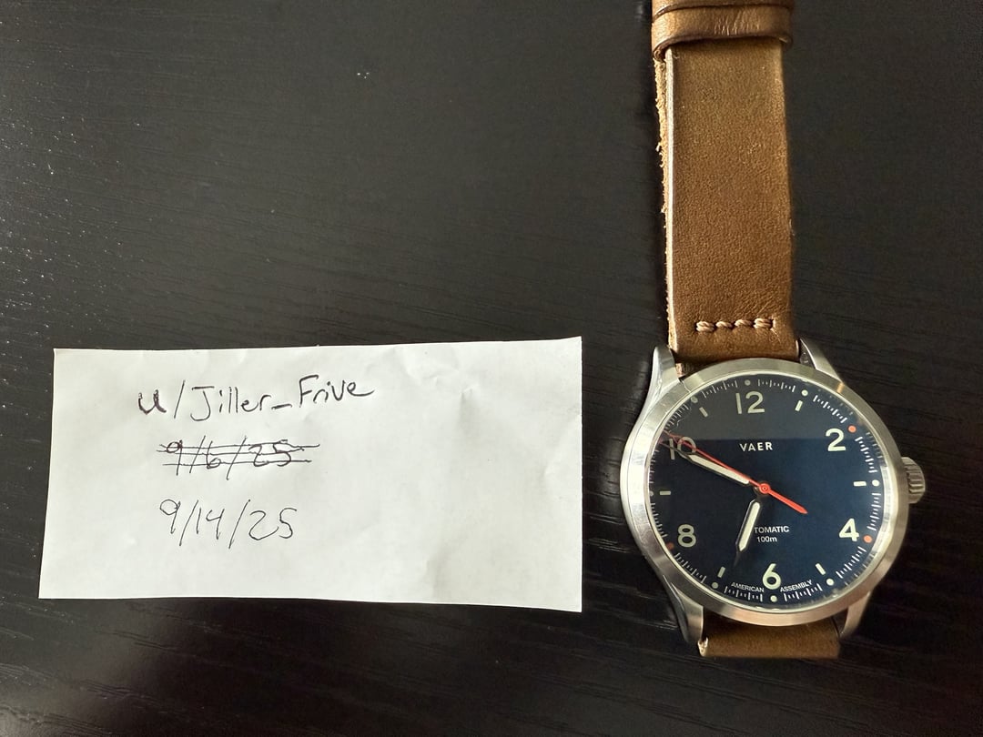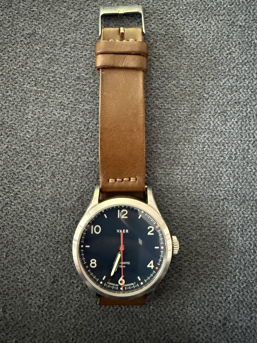 Selling this Vaer A5 Design Navy Automatic 40mm watch originally purchased from another user here. Comes with box and papers, two red NATO straps and leather strap, all of which came with the watch when I purchased it. This watch is powered by a Miyota 9015 movement that has been reliable and accurate while I've had it. It's got a screw down crown and rated water resistant for 100m. It's a great daily driver but selling due to limited wear as I've added to my watch collection. The watch is in good condition with minor scratches consistent with light wear (most prominent at 3:00 near crown). I tried my best to capture in images. Asking for $250 + shipping OBO, most payment methods accepted. Thanks for looking and please reach out with additional questions! Gallery link: [https://imgur.com/a/vaer-a5-design-navy-ZCvVbho](https://imgur.com/a/vaer-a5-design-navy-ZCvVbho) Timestamp link: [https://imgur.com/a/vaer-a5-timestamp-PeVYsOB](https://imgur.com/a/vaer-a5-timestamp-PeVYsOB)