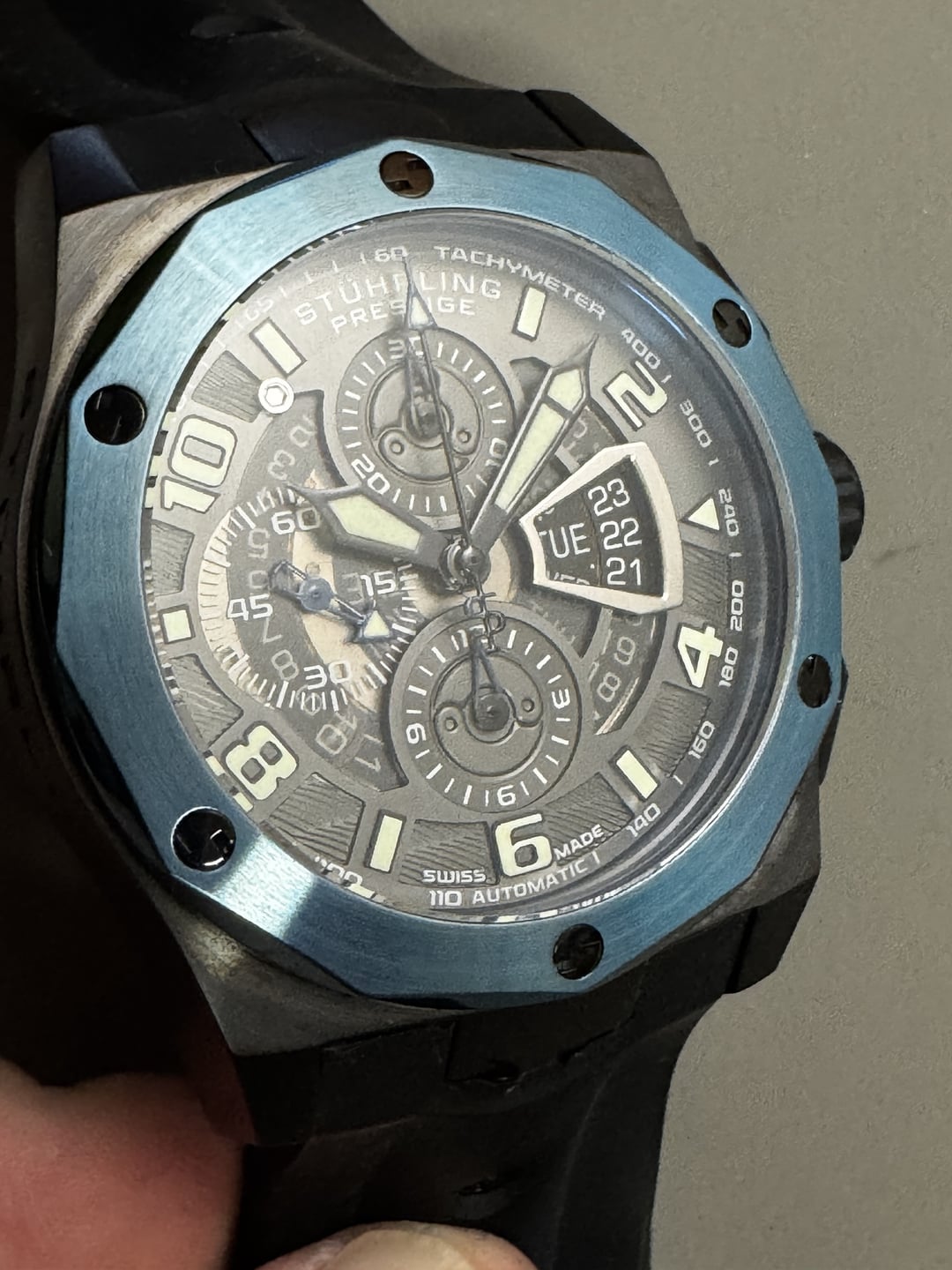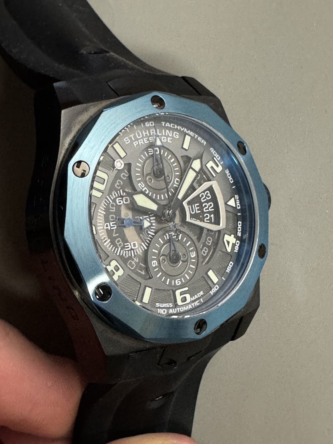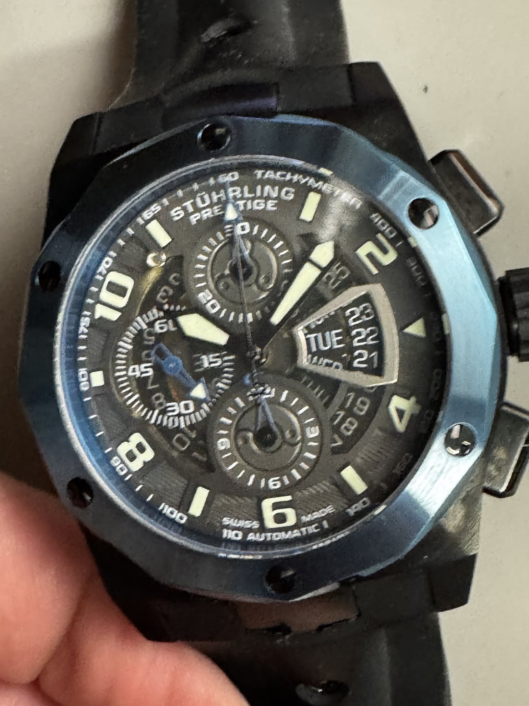 So here’s the thing: Yes, it says Stührling. Yes, the brand that sells $150 skeleton watches on Amazon with “Krysterna crystals.” But this one is the black sheep of the family that actually went to college: the Prestige 311B.33U61, running a genuine Swiss Made Valjoux 7750 under the hood. 47mm case (because subtlety is for other brands) Blue bezel, black case, sporty rubber strap Swiss Made on the dial, 7750 inside – confirmed on timegrapher at +6s/d, solid amplitude and god's own beat error Full kit: box, papers, cards, even the fancy Stührling polishing cloth you’ll never use Condition: running beautifully; case has some scratches on the midcase (adds character, or so I tell myself) Why you want this: It’s the horological equivalent of finding out the class clown secretly got into med school. Stührling’s reputation might make you chuckle, but this thing punches way above its logo. You get a workhorse 7750, full kit, and bragging rights that your Stührling can go toe-to-toe with watches triple the price. Price: $450 shipped CONUS (PayPal / Venmo F&F, Zelle / CashApp). Open to reasonable offers – I’m not trying to retire on this one. timestamps, all watches in timestamp album are available for sale: [https://imgur.com/a/timestamps-watchex-DkWgjgf](https://imgur.com/a/timestamps-watchex-DkWgjgf) My other watches for sale: BALL Trainmaster Manufacture 80 Hours / In-House COSC Movement / Blue Dial (40mm) – $1300 Shipped/Insured: [https://www.reddit.com/r/Watchexchange/comments/1nfzz16/wts\_ball\_trainmaster\_manufacture\_80\_hours\_inhouse/](https://www.reddit.com/r/Watchexchange/comments/1nfzz16/wts_ball_trainmaster_manufacture_80_hours_inhouse/) Low-cost watches - Boderry and Megalith: [https://www.reddit.com/r/Watchexchange/comments/1kg9mbo/wts\_lowcost\_watches\_boderry\_and\_megalith/](https://www.reddit.com/r/Watchexchange/comments/1kg9mbo/wts_lowcost_watches_boderry_and_megalith/)