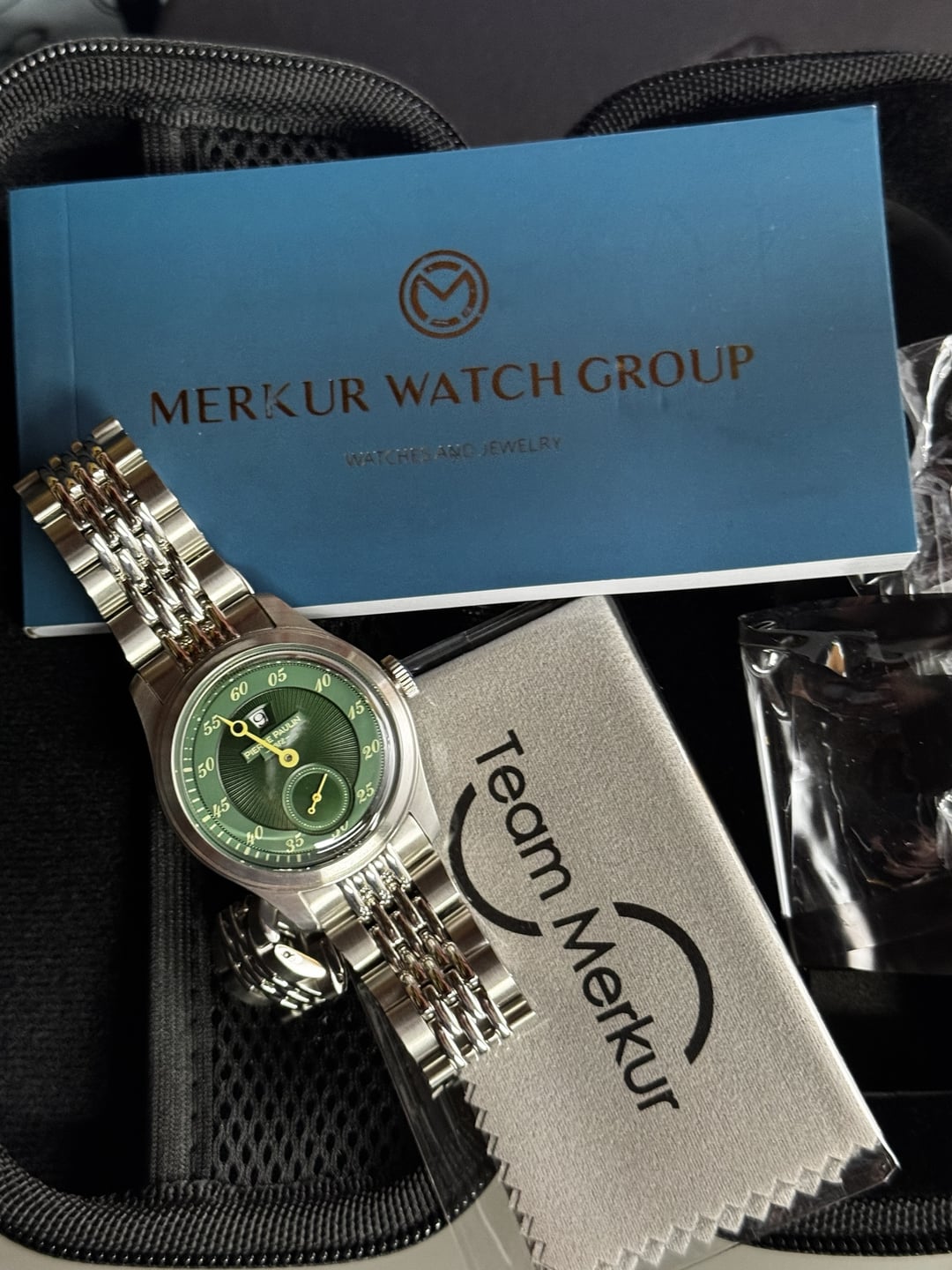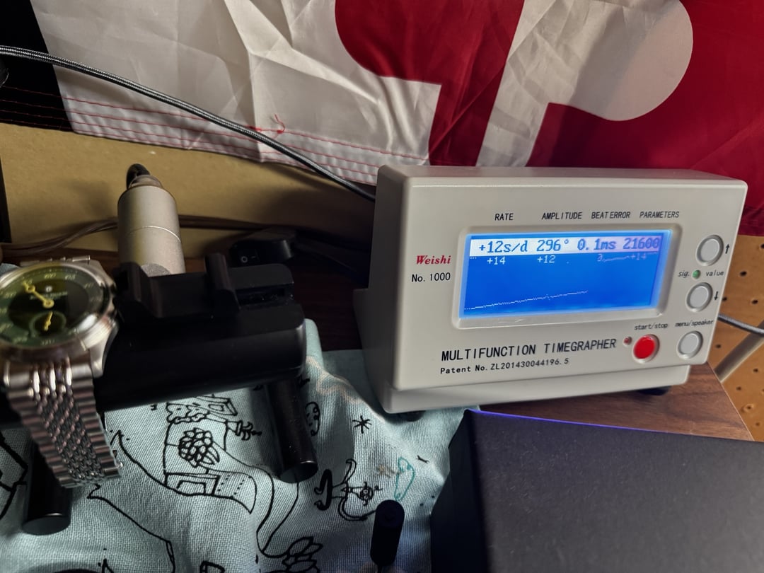 Alright watchfam, here’s one for the folks who want complications without needing to sell a kidney. This is the Pierre Paulin jump hour — because apparently “Pierre Paulin” sounds more Swiss than “Merkur Factory,” and branding is half the game. What you get: Jump Hour: That little window at 12 o’clock flips the hour card like a Vegas slot machine. (Okay fine, more like a polite calendar wheel, but still cooler than another three-hander.) Green guilloché dial: The kind of shade that makes you want to order absinthe and talk about philosophy. Small seconds at 6 — so you know it hasn’t died on you. Bracelet: Surprisingly nice multi-row steel thing that looks way pricier than it should. I've never thought they looked like beads or rice, but here we are calling it that for no good reason. Movement: Merkur/Seagull auto, doing solid numbers: +12s/day, 296° amplitude, 0.1ms beat error (see timegrapher pic for receipts). That’s better than some Swiss pieces I’ve seen after “full service.” Condition: Light desk rash on clasp, otherwise sharp. Comes with Merkur box, cloth, papers — the full “Team Merkur” experience. Why this rocks: It’s basically a budget take on jump hours that aren’t $10k+. Will it make strangers think you’re rocking an indie haute horology piece? No. Will watch nerds give you a knowing nod while they whisper “Seagull inside”? Absolutely. Price: $110 shipped CONUS. PayPal / venmo F&F, Zelle, CashApp photo album: https://imgur.com/a/5i2s2xg timestamps, all watches in timestamp album are available for sale: https://imgur.com/a/timestamps-watchex-DkWgjgf My other watches for sale: BALL Trainmaster Manufacture 80 Hours / In-House COSC Movement / Blue Dial (40mm) – $1300 Shipped/Insured: https://www.reddit.com/r/Watchexchange/comments/1nfzz16/wts_ball_trainmaster_manufacture_80_hours_inhouse/ Low-cost watches - Boderry and Megalith: https://www.reddit.com/r/Watchexchange/comments/1kg9mbo/wts_lowcost_watches_boderry_and_megalith/ Stührling Prestige 311B “Yes, Really a Valjoux 7750” – Full Kit – $450 (CONUS): https://www.reddit.com/r/Watchexchange/comments/1no3m01/wts_st%C3%BChrling_prestige_311b_yes_really_a_valjoux/ Fossil Arkitekt FS-4109 “Vinyl Rotor DJ Edition” – Automatic – Runs Straighter Than a Swiss Banker – $100 OBO (CONUS): https://www.reddit.com/r/Watchexchange/comments/1no3wj5/wts_fossil_arkitekt_fs4109_vinyl_rotor_dj_edition/