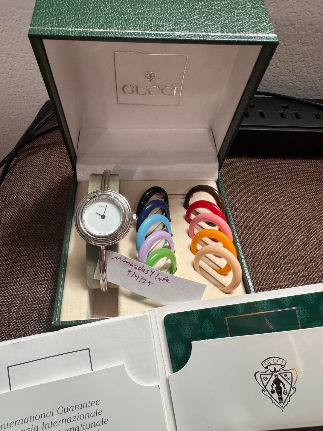 ![[WTS/WTT] [repost] 1996 Gucci 11/12.2 (1100L) Rare Silver Tone Interchangeable Bezel Bangle Watch Full Kit 5](https://cdn-cf.watchpatrol.net/600x600/img/full/34b363658a276829bedaa497ca30931e621d5d47.jpg)