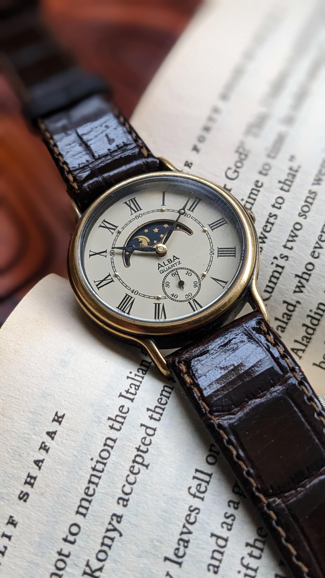 Today I’m sharing a Seiko alba Vintage Quartz moonphase golden Watch with reference Ref.v806-0060 produced in 1990's became popular the last couple years . Alba heavily inspired some line-ups to European Model Watches as European Influence crawled into Japan and became a hype, and this vintage alba seiko watch is a great example! This elegant dress watch is fully made in Japan and still runs flawlessly. Seiko Alba V806-0060 Moon Phase Roman Dial Vintage watch 🗓️ Production: 1990's 💎 Movement: alba seiko Japanese Quartz – excellent timekeeping 💪 Stainless steel back 📐 Lug to Lug: approx. 36mm approx , 32mm with crown , 16mm strap size 🧯 Strap: aftermarket ⚙️ Condition: Good overall – clean and fully functional 🎯 Made in Japan 🇯🇵 This is a classy and timeless piece that works great as a daily dress watch or a refined addition to any vintage collection. 💵 Price: $145$ Timestamp: [https://imgur.com/a/EIHzPMM](https://imgur.com/a/EIHzPMM) 📩 Comment here before sending a PM Thanks for looking hope this beauty finds a good new wrist!
