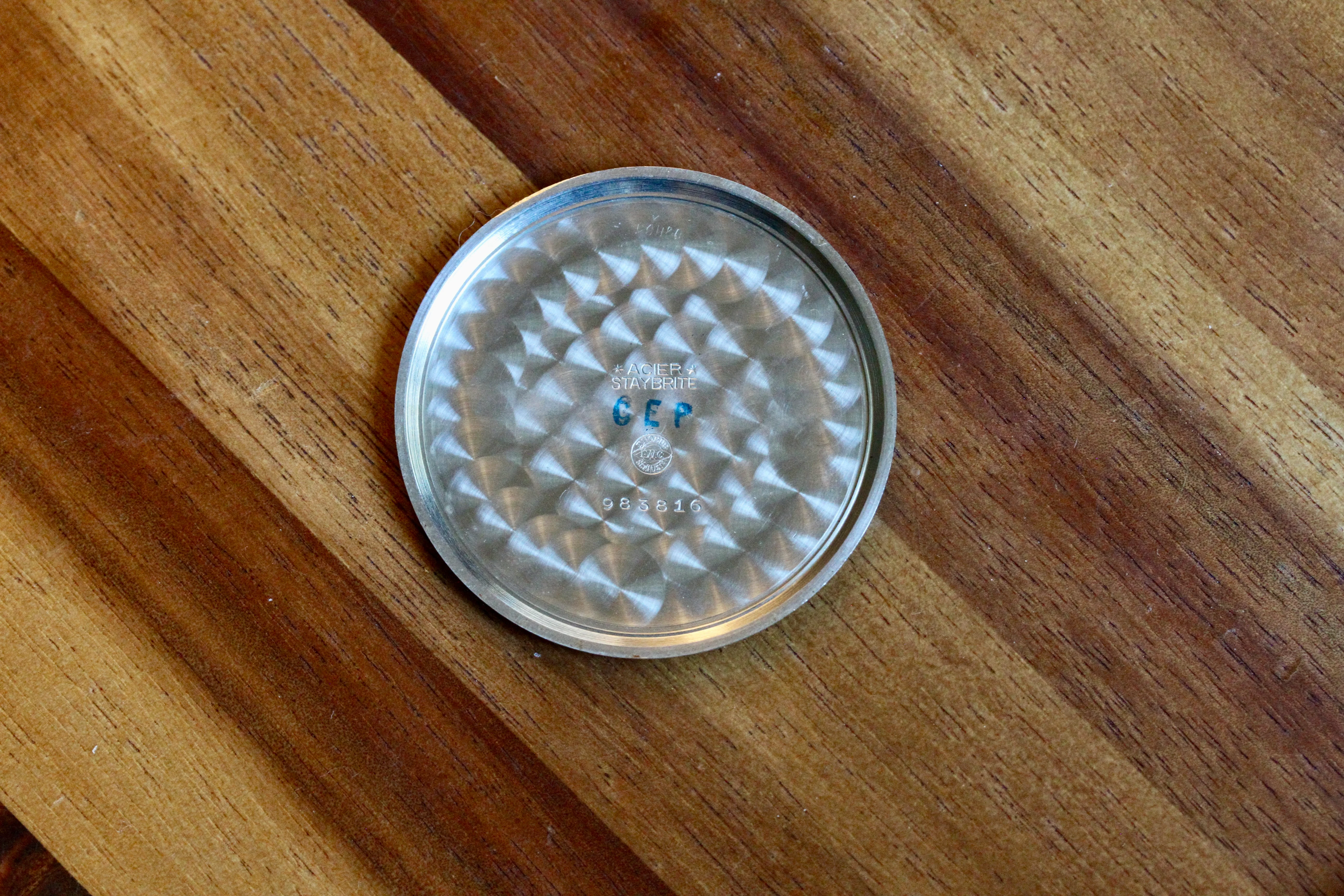 The two-tone dial is in good condition, alongside the blued baton-style hands.