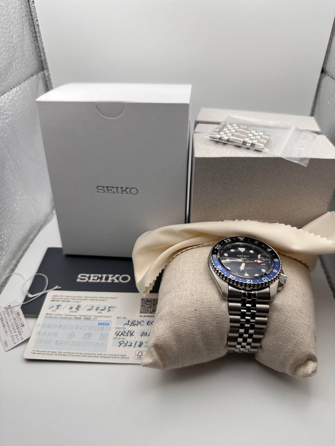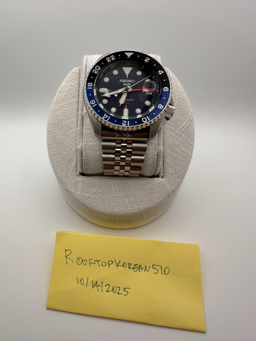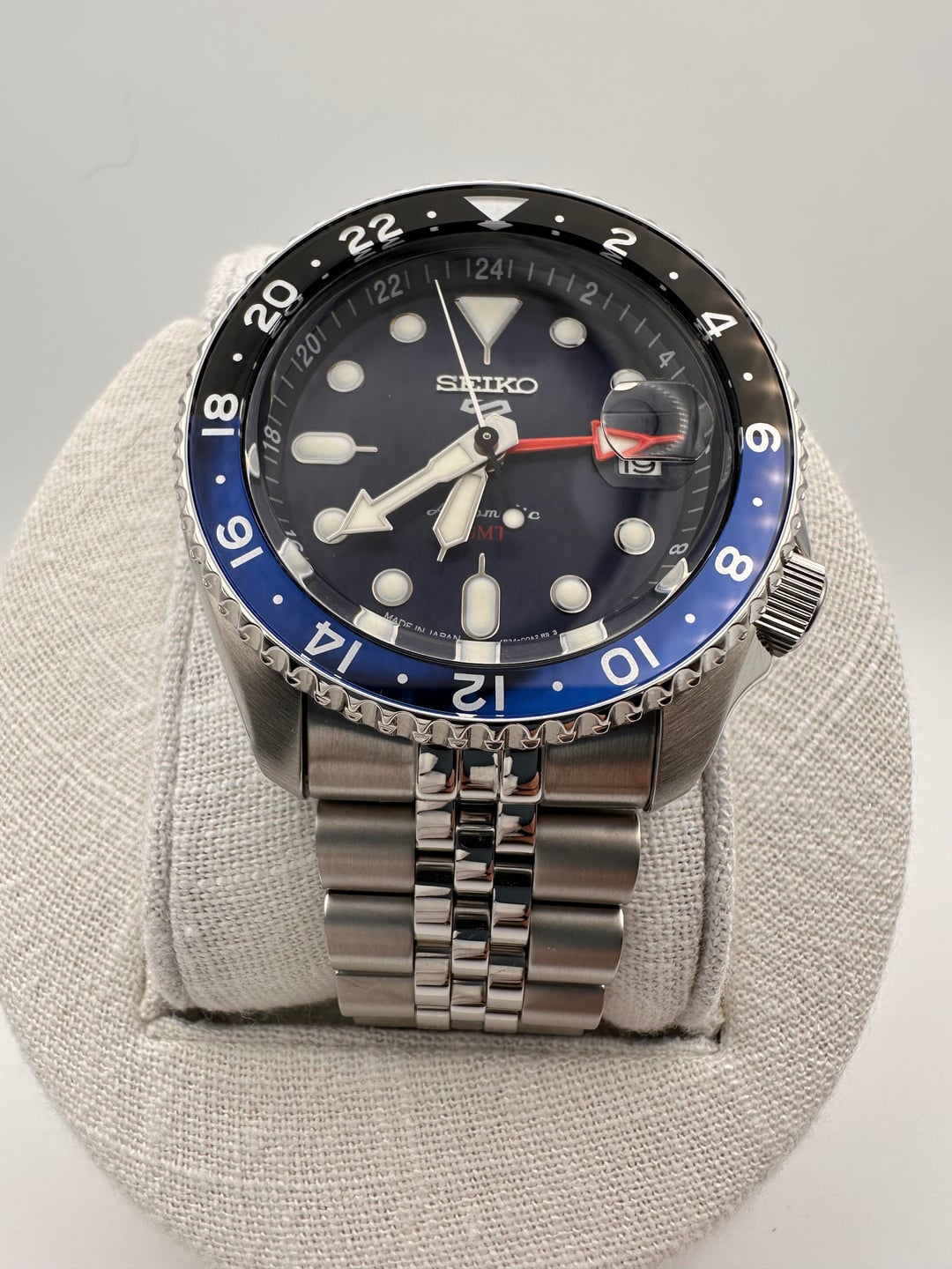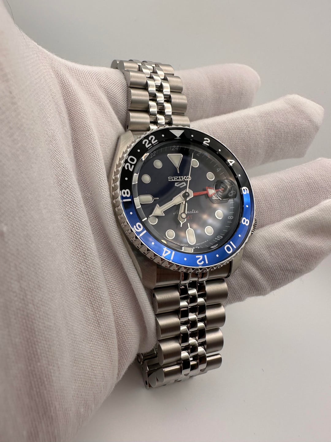 Seiko 5 GMT SKX Blue SBSC003 / SSK003. Full set in mint condition. JDM purchase August 2025. Sized and wore a handful of times. Watch comes complete with everything pictured. No trades, shipping to CONUS only. There is a small speck on the dial near the 10 o clock hour mark, I can’t tell if its a piece of dust on the dial under the crystal, or if its a mark on the dial itself. Wore it a few times until I noticed it. Warranty is stamped and still 100% valid so I’m sure Seiko can take care of it. Let me know if you have any questions, please leave a comment here before sending a DM. **$210 shipped** Payment via PayPal FF/G&S (+fee), Venmo 100+ transactions on other subs, 100% eBay feedback available upon request.