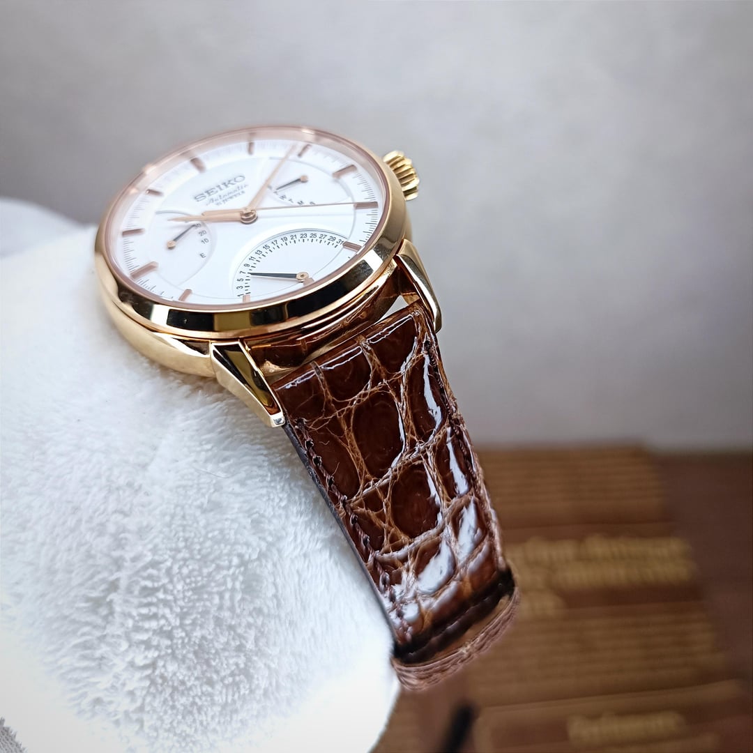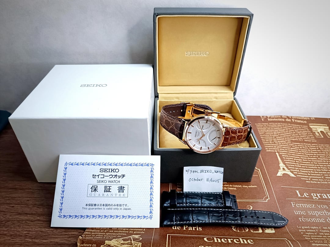 Hello r/watchexchange, I’m offering for sale the Seiko Presage SARD006 Rose Gold Retrograde Day-Date, a Japan Domestic Market (JDM) model that has been discontinued and is now very hard to find. Condition: Pre-owned, in excellent condition. The rose gold plating on the case and clasp is very beautiful and rare. The strap is still in very good condition, with a minor aging mark at the clasp fold, but overall it remains very wearable for a long time. Comes with a bonus black handmade leather strap (unused, premium quality). Specifications: Case size: 40.5mm Lug width: 20mm Movement: Seiko 6R24B, 31 jewels, 28,800 vph. Runs strong and keeps accurate time at approximately -5 to +5 seconds/day. Dial, hands, and indices: Excellent condition. Features the distinctive dual retrograde layout with striking hands. Case: Rose gold-plated, extremely beautiful and rare. Crystal: Sapphire – clear and scratch-free. Wrist size fit: 15–20cm Accessories included: Everything shown in the pictures. 📸 Images/Timestamp: Included in the post Pricing, Payment & Shipping: Price: $925 (shipping not included). No trades. Payment: PayPal F&F or G&S (+4.6% fee). Shipping: FedEx Express (4–6 days), $50–$80 depending on destination. Thank you for your interest!