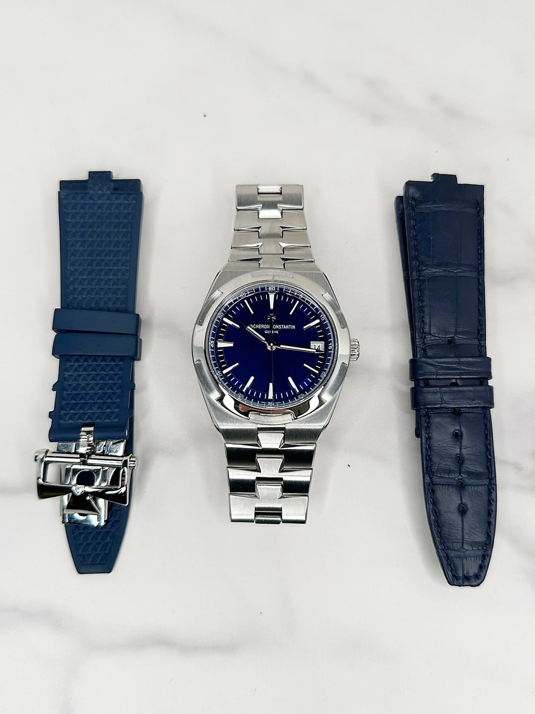Photos & Video: [https://imgur.com/a/OkwTCla](https://imgur.com/a/OkwTCla) Timestamp: [https://imgur.com/7URabZa](https://imgur.com/7URabZa) Available for sale is what I consider to be one of the best "one watch" solutions out there from the Holy Trinity - the Vacheron Constantin 4500V. This reference is a versatile, tool-free watch that can switch from sport to casual to formal in seconds thanks to VC's quick-change strap feature. The original rubber and alligator straps are included in excellent condition. The 41mm case wears very comfortably for its size and is quite thin with Vacheron's in-house 5100 movement powering a simple date complication and sports an impressive 60-hour power reserve. The blue dial is very difficult to capture in photos but is absolutely beautiful! This watch is in very good condition for its age (circa 2016 based on passport) with minor handling marks and extremely light surface scratches on the bezel that are hard to detect with the naked eye but visible with a macro lens and ring light here: [https://imgur.com/FqSQqBZ](https://imgur.com/FqSQqBZ). Otherwise there are no major marks, scratches, or dings on the crystal or case. Full set includes the inner and outer VC boxes plus travel case, instruction manual, guarantee certificate, certificate of origin, and tag. Please note, the material of the inner boxes, like all VC boxes from this era, are "shedding", but the watch itself has been protected from this material in my care. It will fit up to an 8-inch wrist as all links are included and installed. Priced competitively at $24,995 via wire, shipped via FedEx priority overnight to a FedEx Print & Ship Center near you (a must for insurance purposes) upon payment clearing. References are available in "Who's Who" on TRF, here on WatchExchange, and multiple Facebook groups.