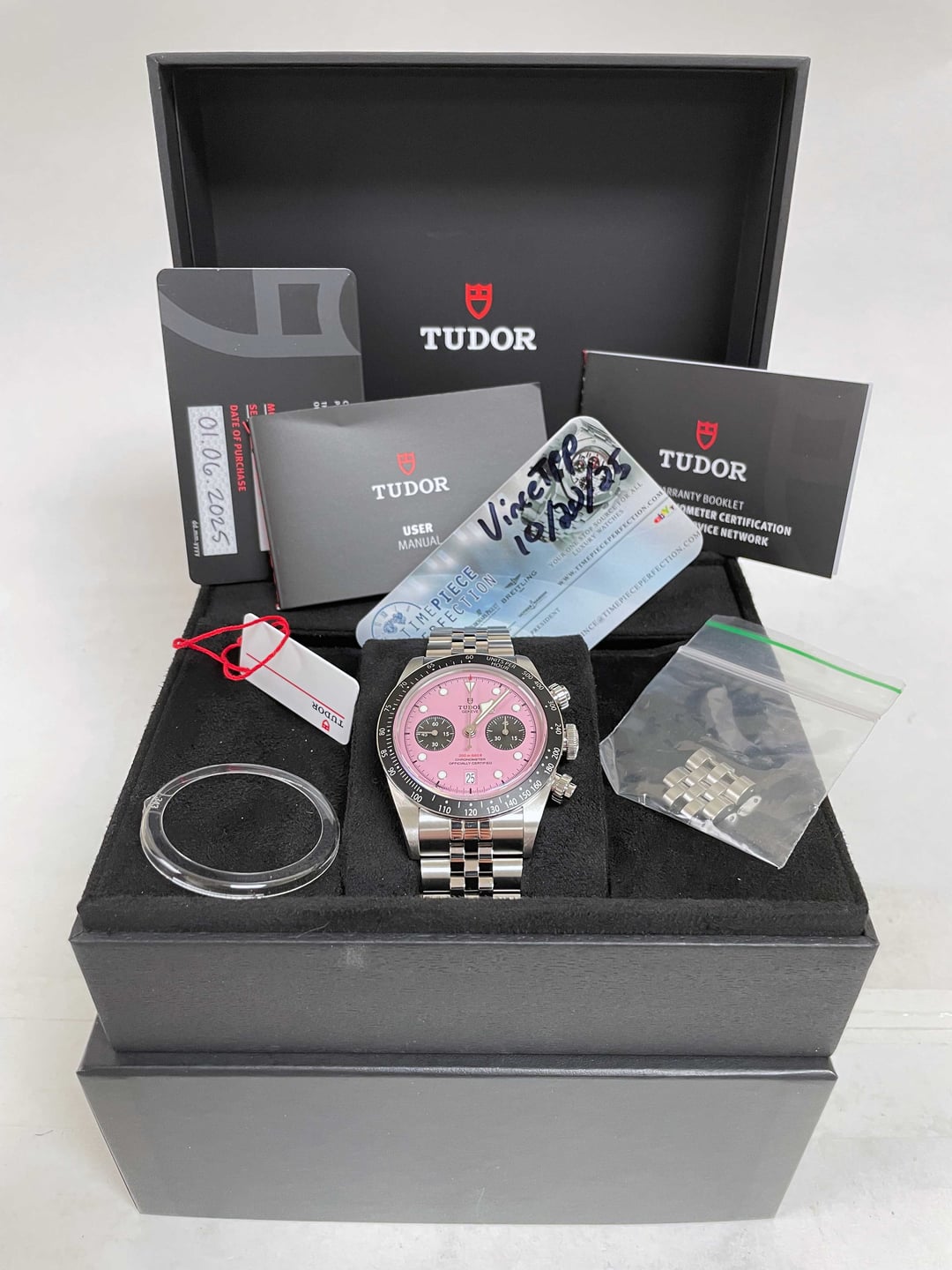 [timestamp](https://imgur.com/a/GIqHqyO) For sale is a mint condition Tudor Black Bay Chrono with Pink dial. It comes in wonderful shape as shown and will be delivered as a fully complete set with all box, books, links, tags, and 6/2025 dated Tudor warranty card. Asking $8450 Trades welcomed and preferred WW insured shipping Vince B Brick and mortar watch store w/ countless references since 2006 Payments in the form of bank wire or credit cards + fee’s Tax if shipped to PA/NJ/FL without resale cert