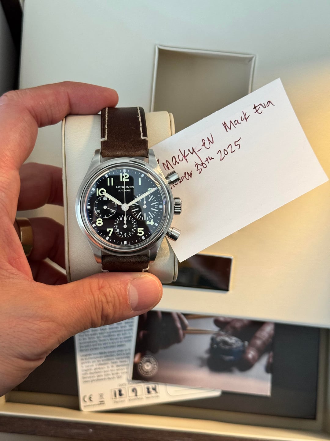 FS is a Longines Big Eye. Probably the best value in terms of an automatic chronograph from a big names Swiss brand. Column wheel makes the clicks nice and tactile. While 14.5m, wears more like a 13 with the heightened domed crystal and the caseback sinking nicely into the wrist. **Condition:** * **Case, bezel, and crystal:** Excellent - few signs of usage * **Accuracy:** \+5-8/day from my experience **Full Kit:** * Full presentaion box * Manuals and Longines book * Purchased Fall of 2024 * OEM leather strap **Specifications:** * **Model:** LONGINES AVIGATION BIGEYE, L2.816.4.53.2 * **Case size:** 41mm * **Thickness:** 14.5m * **Lug-to-lug:** 48.70 mm * **Case material:** Stainless steel * **Crystal:** Scratch-resistant sapphire crystal, with several layers of anti-reflective coating on the underside * **Movement:** L688 Self-winding mechanical movement beating at 28'800 vibrations per hour, with a power reserve up to 66 hours * **Water resistance:** Water-resistant to 3 bar * **Bracelet:** OEM leather **Price & Terms:** * **Price:** $1599 shipped CONUS only. Shipping from LA California. * **Payment:** Zelle preferred