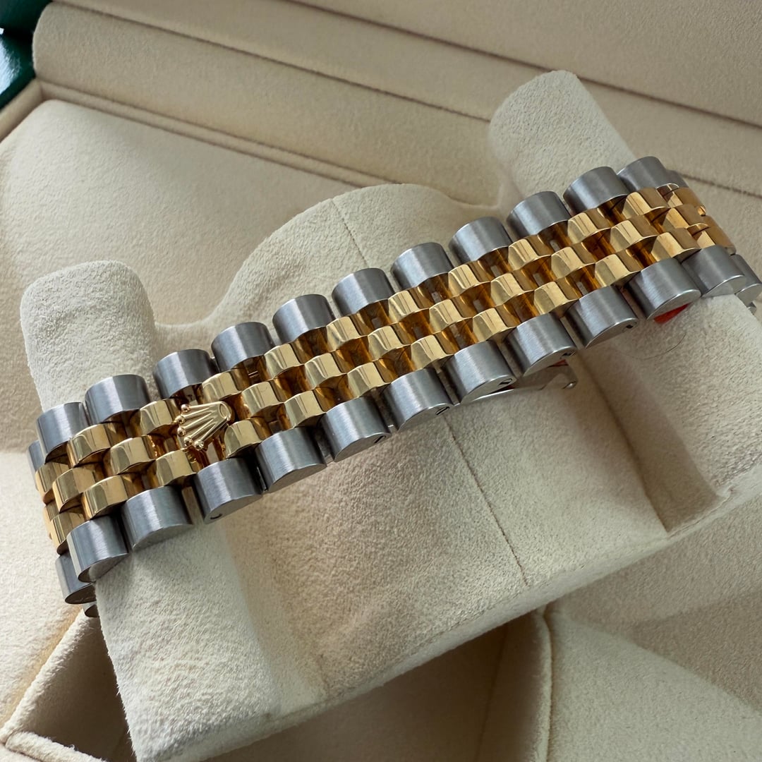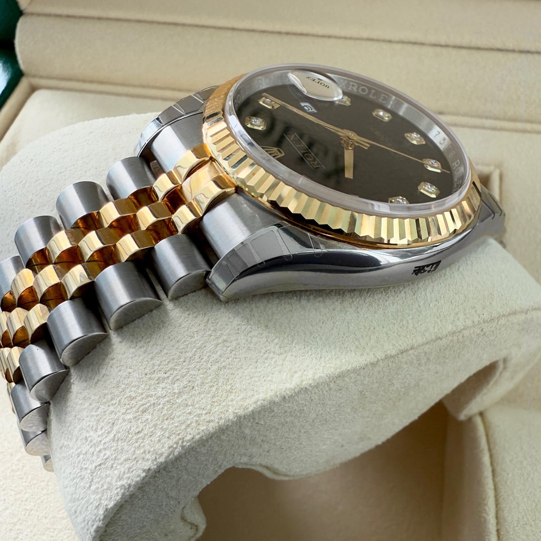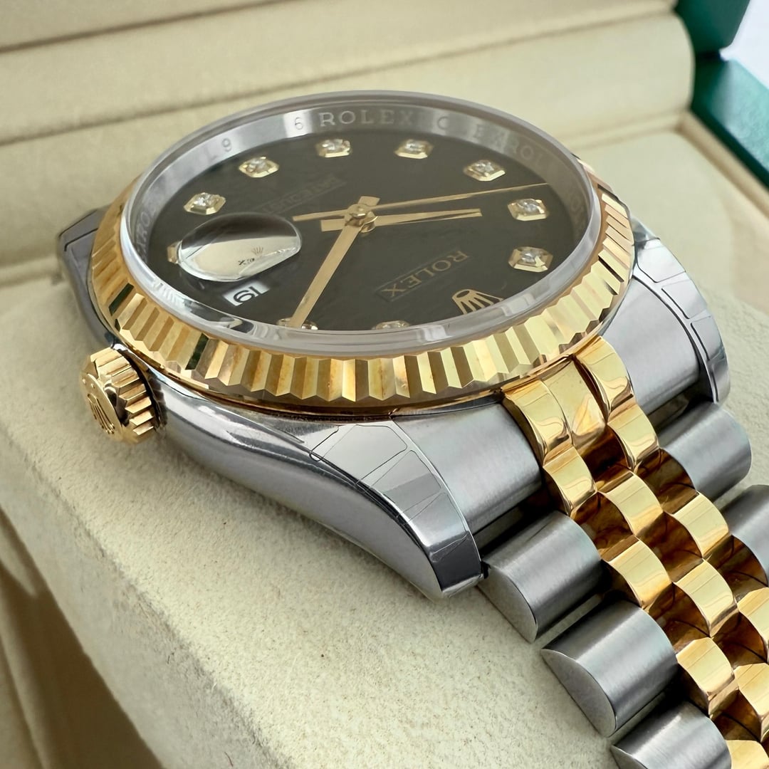 Immerse yourself in the timeless elegance of this stunning Rolex Datejust reference 116233. With its captivating black jubilee diamond dial, this watch is a perfect blend of style and sophistication. Its 36mm case is crafted from a combination of Oystersteel and 18 ct yellow gold, showcasing Rolex’s commitment to using only the highest quality materials. The prominent feature of this Rolex wristwatch is its mesmerizing black jubilee diamond dial, which radiates a subtle yet luxurious allure. The jubilee anniversary dial creates a fascinating interplay of the work 'Rolex' repeating on the dial, adding depth and dimension to the watch’s aesthetic. This dial is also referred to as the 'computer dial' The dial is adorned with factory set diamond hour markers and also features a date window at 3 o’clock position, magnified by Rolex’s signature Cyclops lens, ensuring easy reading at a glance. The watch is powered by Rolex’s automatic, self-winding movement, offering impeccable precision and reliability. Its Oyster bracelet, made from a mix of Oystersteel and 18 ct yellow gold, provides both durability and comfort. Please note that this watch has been meticulously kept as it remains unworn with factory stickers. * **Case:** 36mm stainless steel case which remains unworn with stickers on all four lugs along with case side sticker which has the barcode. * **Bezel**: Original 18K Yellow Gold fluted bezel which remains unpolished and razor sharp unworn condition * **Dial/Hands:** Original Rolex black jubilee diamond dial is stunning brand new condition. Hands are in brand new condition. * **Caseback:** Original stainless steel case which has the original caseback sticker * **Movement:** Original Rolex automatic movement which is currently running +6 seconds per day. * **Bracelet/Strap:** Factory Rolex Jubilee Stainless steel bracelet with solid 18K Yellow Gold middle links. This bracelet is unworn and comes with stickers on the inner bracelet along with the clasp. It comes with full links, remains unsized and will fit an 8 inch wrist * **Crystal:** Original sapphire crystal in stunning condition with no distractions * **Accessories:** The watch comes with everything in the photos including box, outer box, 2015 warranty papers from Saudi Arabia, seal and booklets. Available for sale USD$11250