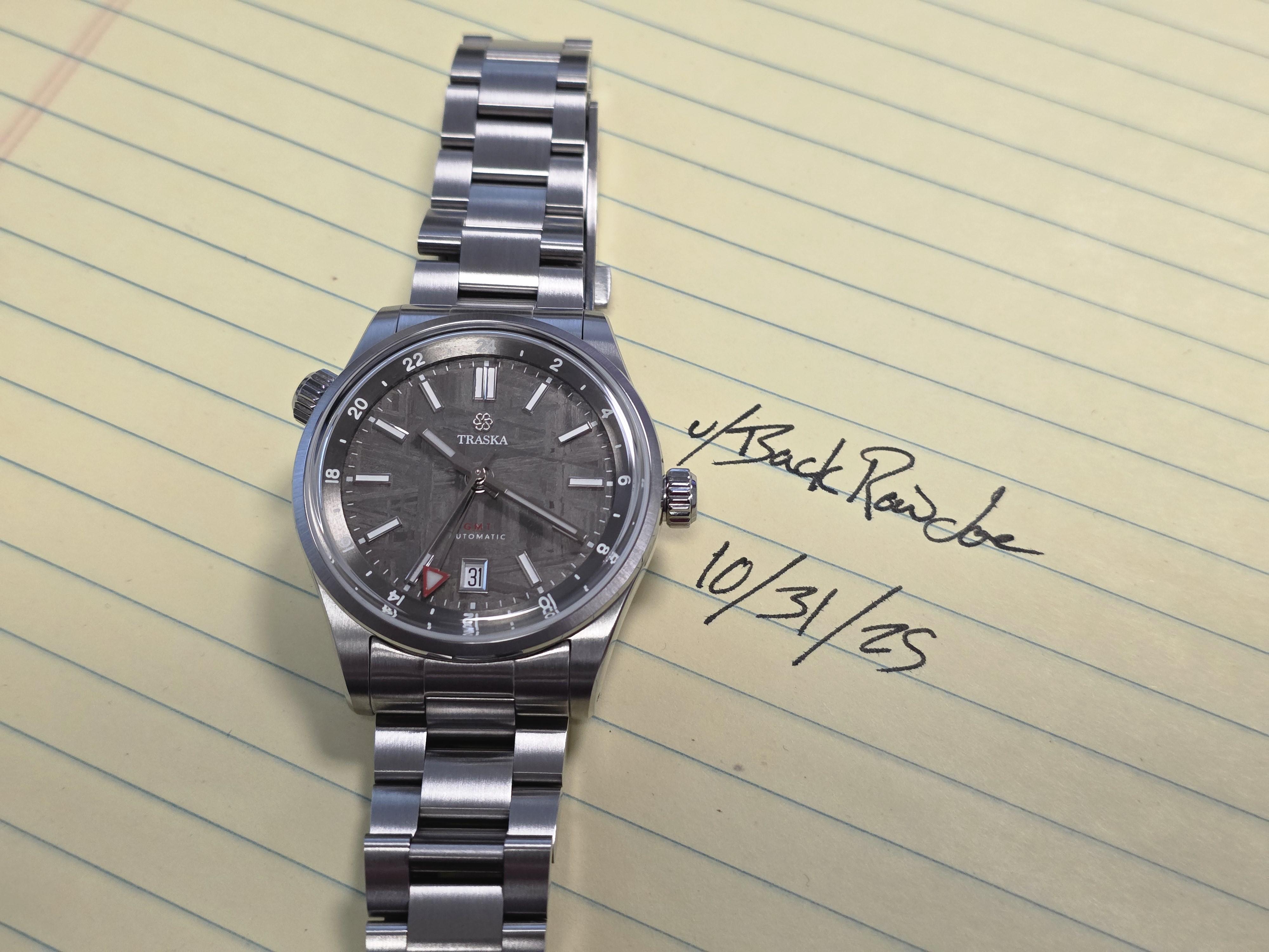 [ALBUM](https://imgur.com/a/l51oJCw) Up for sale is my Traska GMT. I think it's pretty cool. It's got a Miyota traveler's GMT, micro-adjust bracelet, hardened steel, and a darn space rock as a dial. What more could you want? Looking to sell since it wears a bit too much like my Sinn 556 for me to keep both. Asking $999 plus shipping and transaction fees.
