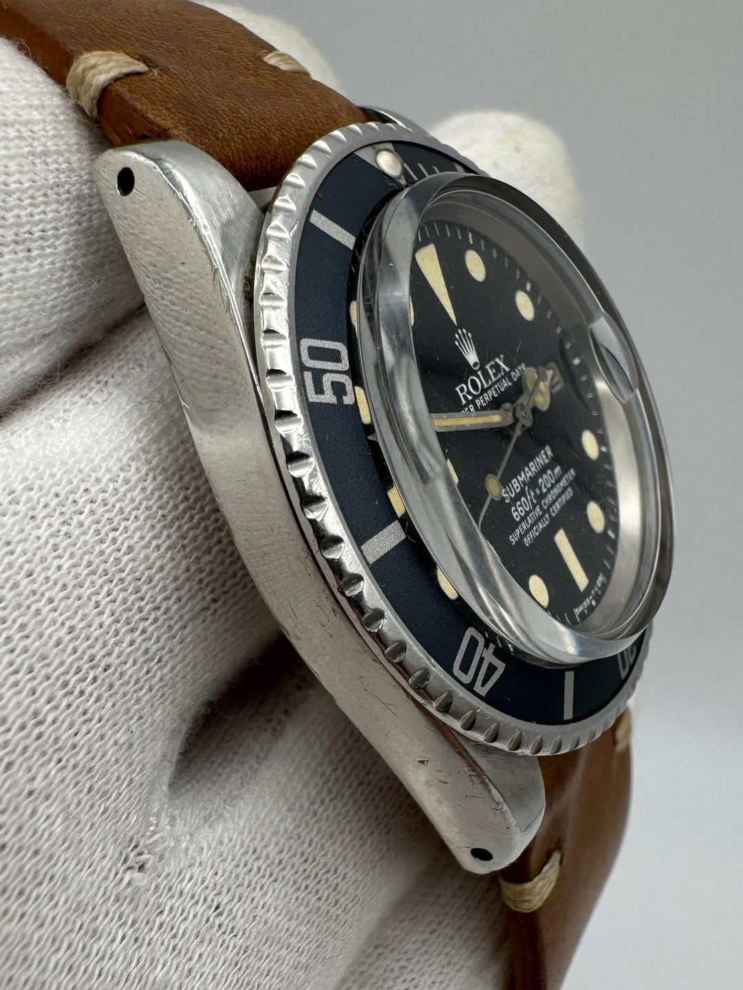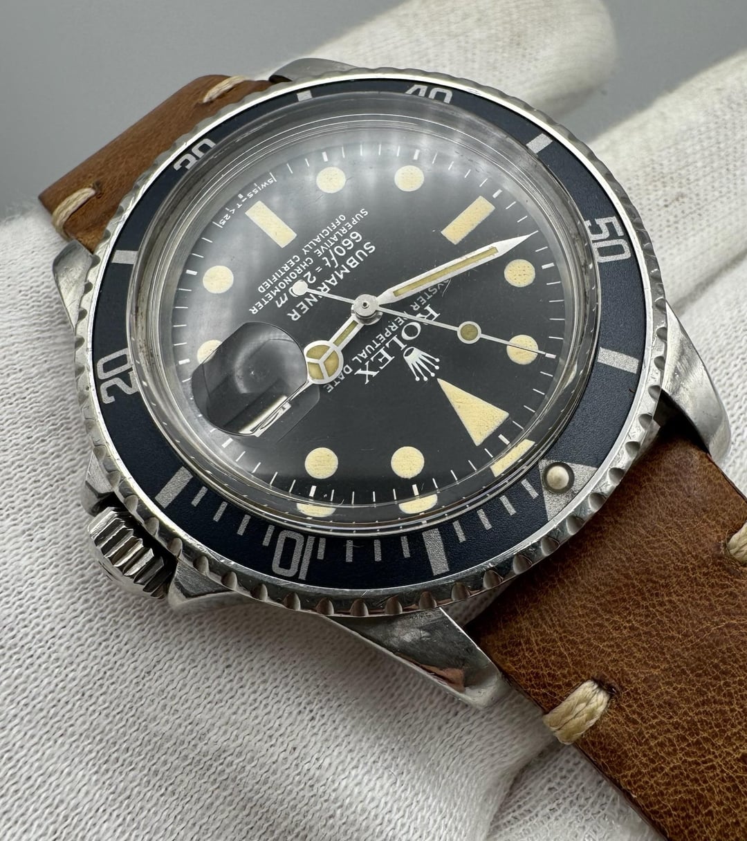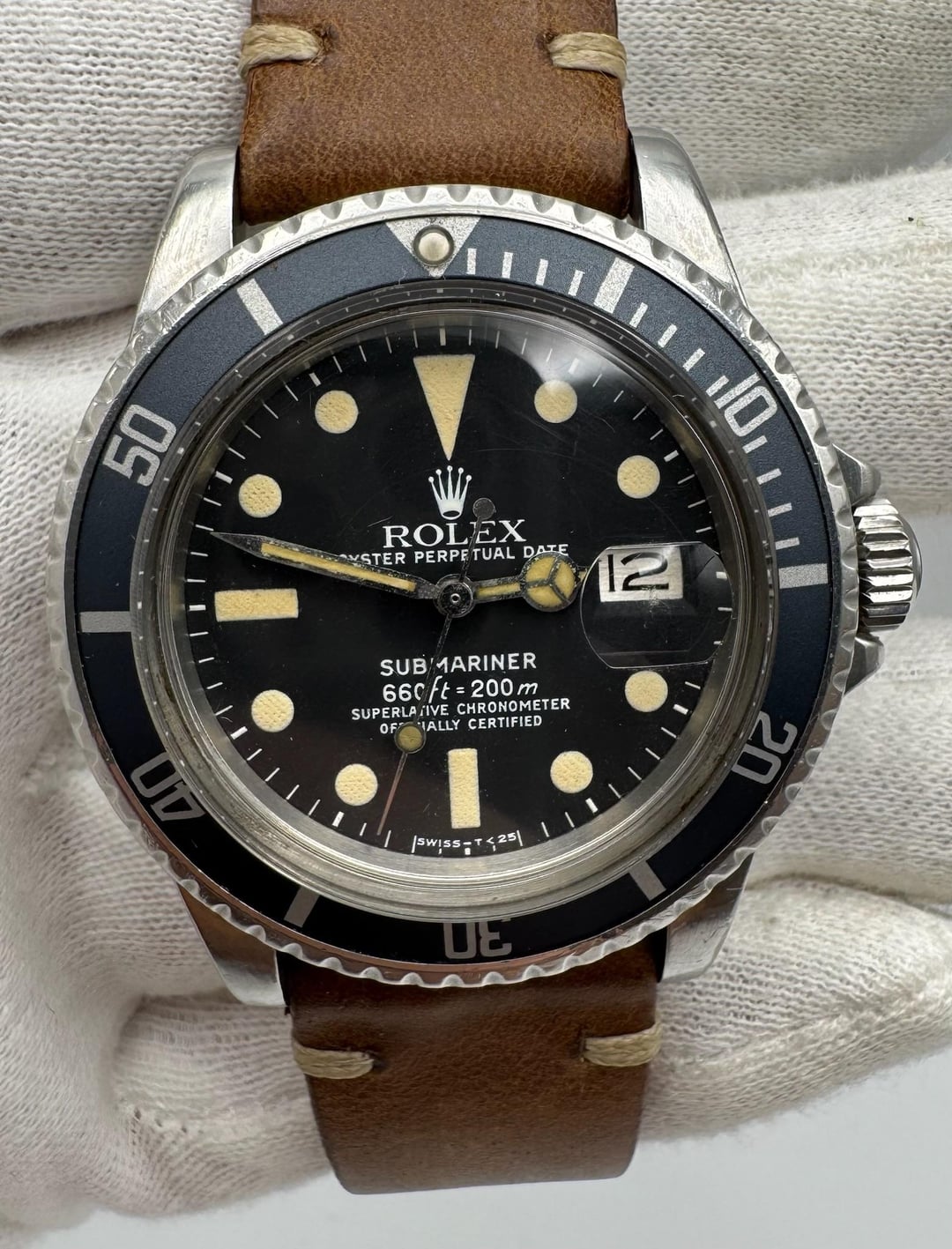 Rolex Submariner Date 1680, presented in all original condition with strong vintage character. The stainless steel case shows natural signs of wear and surface scratches but retains thick lugs with well-preserved proportions, suggesting it may or may not have been polished in the past. The standout original MK1 dial is exceptionally well-preserved, featuring an attractive yellow patina across the indices with perfectly matching aged hands. The insert displays a unique blue hue under certain angles, complementing the overall look of the watch. The crystal remains very clean with only minimal marks. All case numbers are sharp and fully visible, with a serial in the 5 million range dating back to 1977. The movement was professionally serviced in September 2025, runs accurately, and has been pressure tested to 3ATM (30m). The watch is paired with a new 20/16mm handmade vintage brown ammo leather strap, fitted with a Rolex steel pin buckle. A highly appealing vintage Submariner Date 1680, combining originality, character, and excellent overall presentation. **Reference:** 1680 **Size:** 40mm **Year:** 1977 📜 Includes: Custom [travel pouch](https://bogossia.com/products/travel-carrying-case) ($50+ value) 💵 Price: $8,435 + FREE overnight shipping with FedEx fully insured. [Timestamp](https://imgur.com/a/mgkp2qA) 🔥 Follow us on [Instagram](https://www.instagram.com/bogossiajewelers) 📍 Location: New York 🔒 Authenticity: 100% guaranteed, buy with confidence. We have 150+ reviews on Chrono24 with 180+ transactions, and Excellent rating score on Trustpilot. Visit our [profile](https://www.reddit.com/u/BoghossianJewelry/s/vm81HAdB7o) for links and references. 📦 Domestic Shipping: Ships with FedEx overnight, within 24 business hours of payment, from New York, NY to CONUS. The shipment is fully insured against damage, loss or theft. 🌍 International Shipping: Incurs an additional $100. 💳 Payment: PayPal/CC (+4%), Web, or Face-to-face deal in NY. 🔐 [Seller References](https://bogossia.com/authenticity) 🔗 [Other Listings](https://www.reddit.com/u/BoghossianJewelry/s/vm81HAdB7o) 📸 [IG: @bogossiajewelers](https://www.instagram.com/bogossiajewelers)