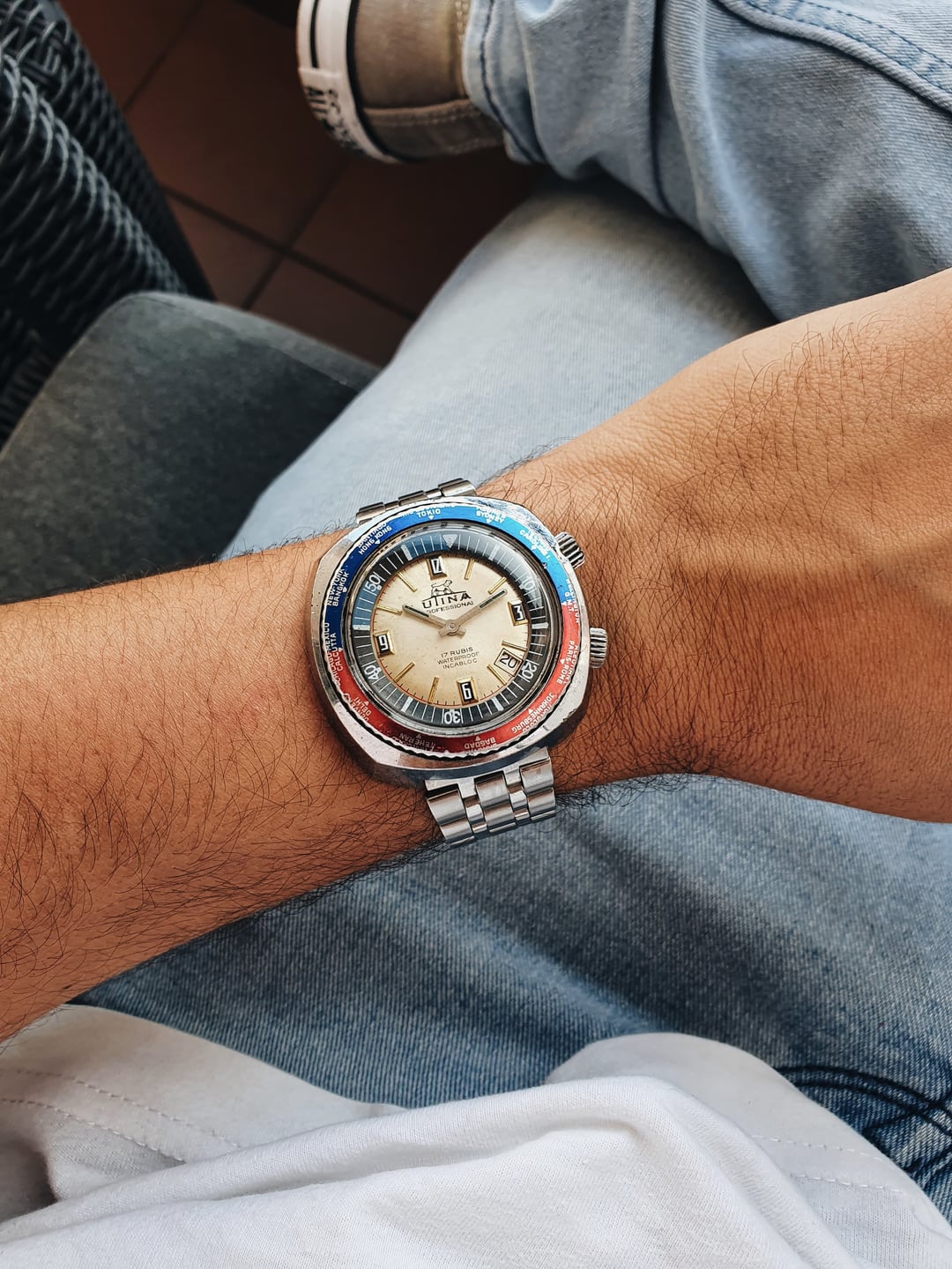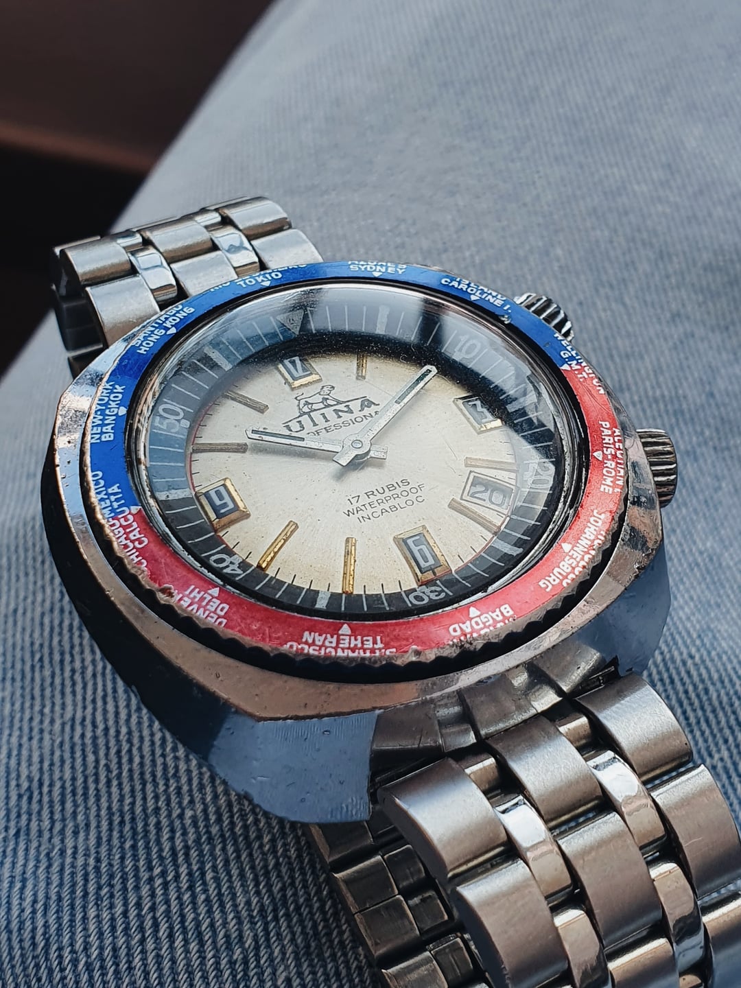 Pure 70s funkiness in this Utina Professional. The watch includes a fixed world timer bezel, and internal diving bezel, date, and a gold dial with Arabic numerals. Plus, it has a case size of 43 mm – perfect for those who enjoy vintage, chunky pieces. **Condition:** I’d say it’s a 5/10. The case has usage marks and it’s losing some of its plating around the edges. The dial has some aging. See detailed photos for full condition and clarity. **Case Size:** 43.3 x 41.7 chrome-plated case with a thickness of 14mm and a lug width of 20mm. **Crystal:** Acrylic **Movement:** It seems to have a FE 233-69 movement, with 17 jewels. I don’t know its service history, but everything is working as it should. **Price:** Asking $110. Please add $20 for worldwide shipping. Payment methods include Wise, ACH transfer, Revolut, Bitcoin (On-Chain or Lightning), or PayPal G&S for buyers with solid references. Add +7.5% for currency conversion fees on the latter. Portugal has suspended all shipments to the US, but I can still ship to other countries. Established seller with over 220 transactions – buy with confidence! Make sure to follow me on Instagram (@daily.worn) to check out the newest additions. Happy to answer serious inquiries. No trades, no lowballs. [Pictures](https://imgur.com/a/LHpPIxz) [Timestamp](https://imgur.com/a/Vmulp8C)