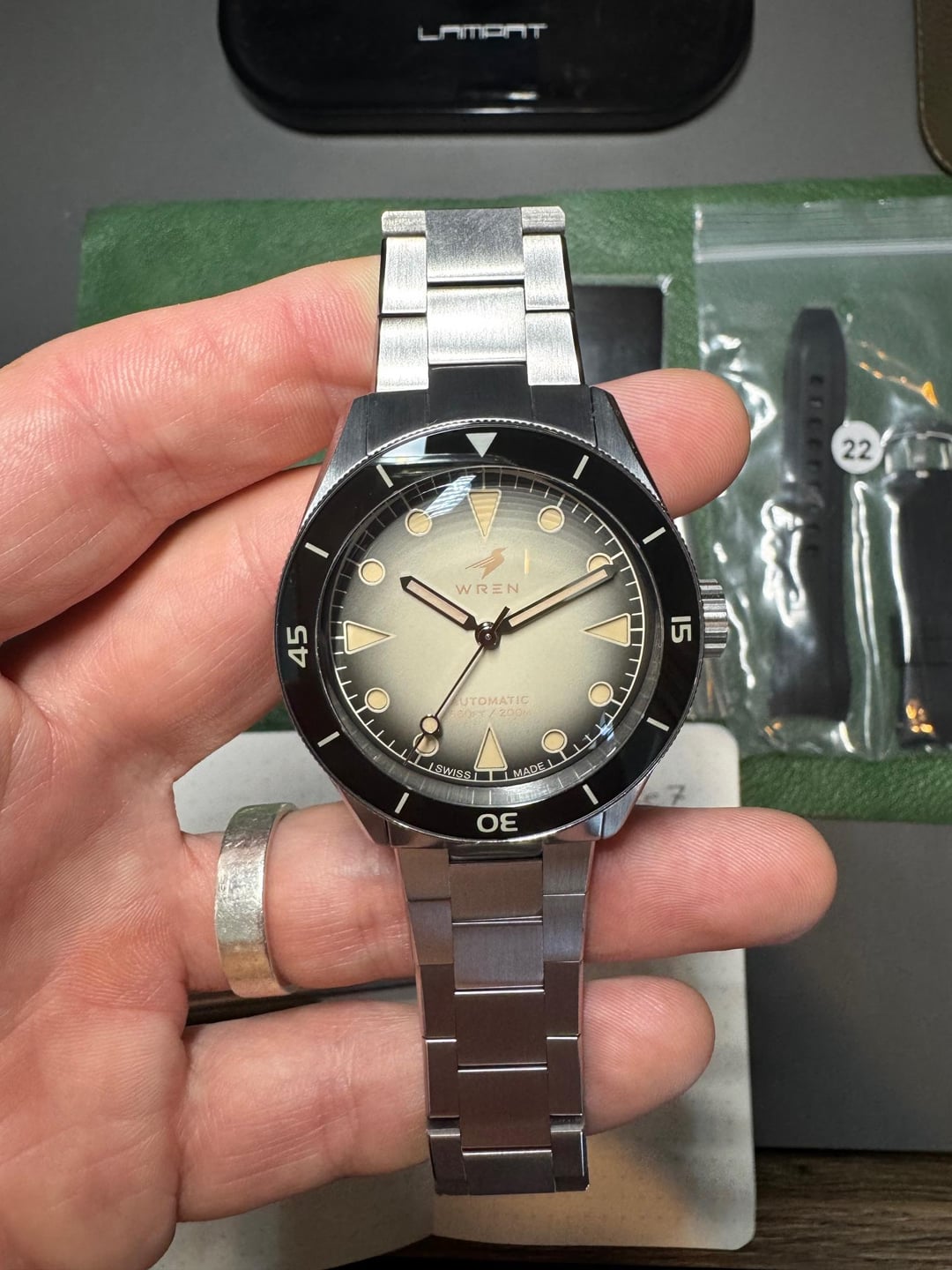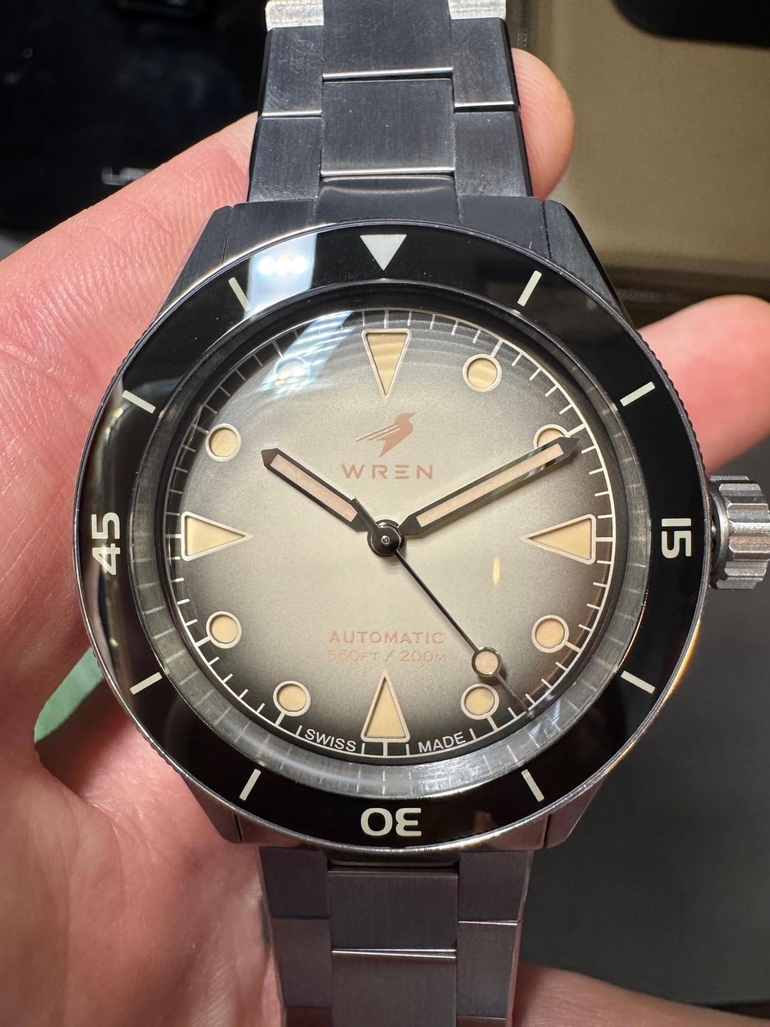 Hi Guys, looking to sell this Wren Diver One in Sand. its in perfect shape, no scratches i can see, willing to take any more pictures on request. its a fantastic watch with great lume and a great size. comes with box, warranty until july 2027, all links and an extra FKM rubber strap. PM with any questions. * **Swiss Made** * **Diameter:** 41mm * **Lug-to-lug:** 47mm * **Thickness**: 13.3mm including box crystal * **Case and Bracelet:** PVD coated retaining steel color for scratch resistant * **Movement:** Sellita SW200 Automatic Movement with 38 hours of power reserve * **Water Resistance:** 200m * **Crystal:** Sapphire Box Crystal * **Caseback:** Hydraulic Press caseback engraving of a Wren * **Bezel:** Sapphire unidirectional rotating bezel * **Lume**: Swiss Super-LumiNova BGW9 Blue/Green Lume on hour markers, hands and bezel pip. * **Bracelet:** Flat link bracelet * **Limited Edition:** 100 pieces