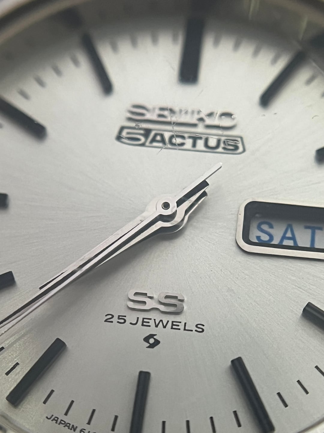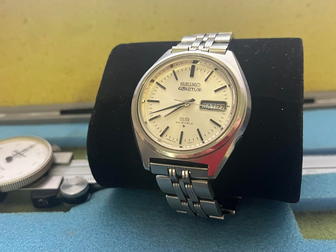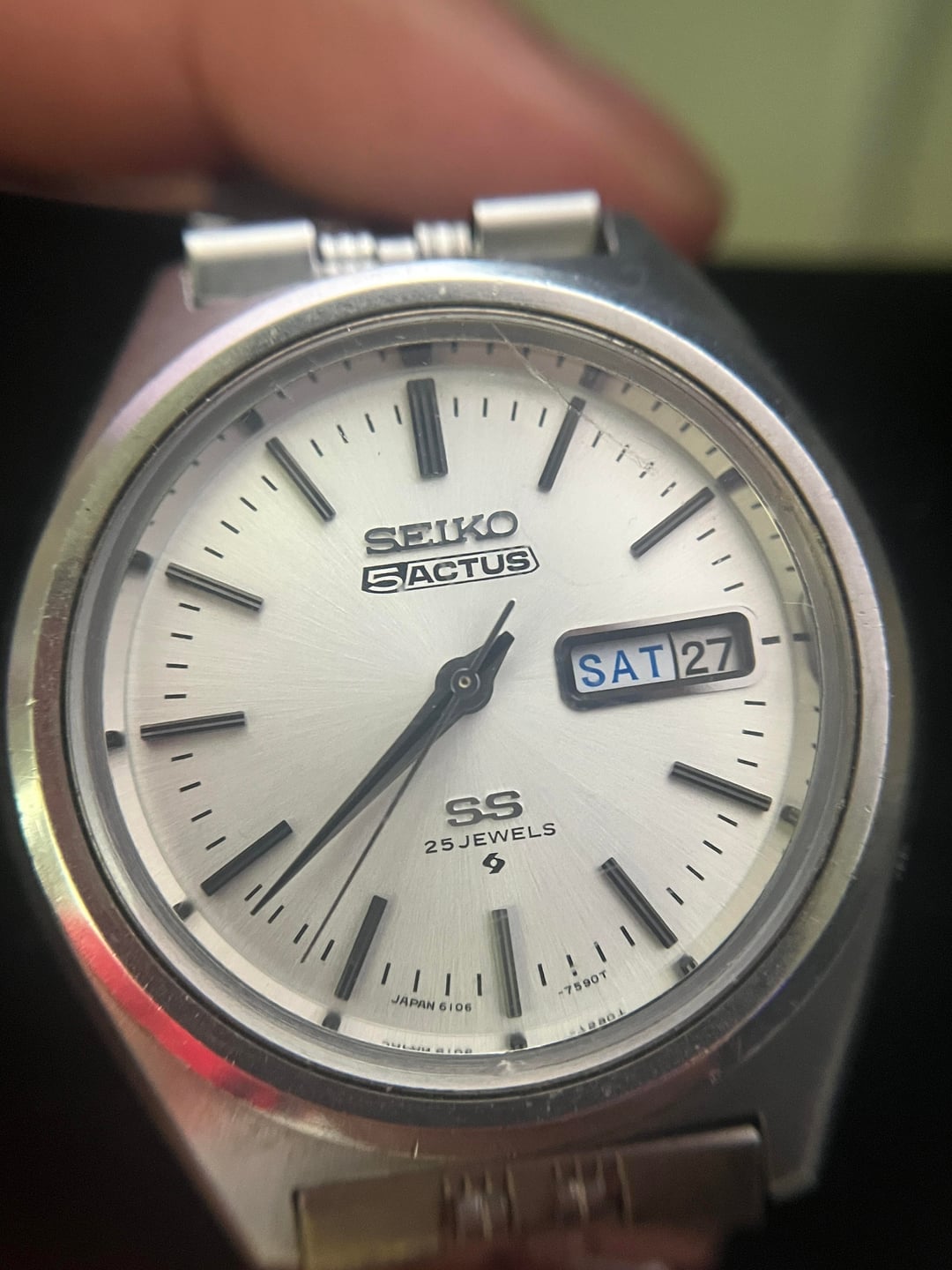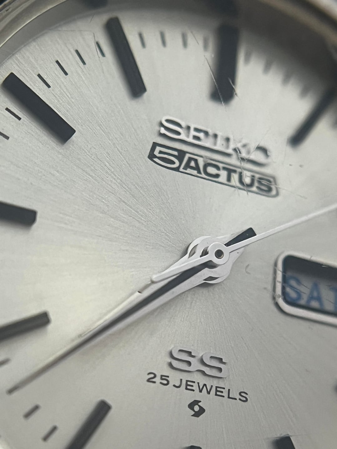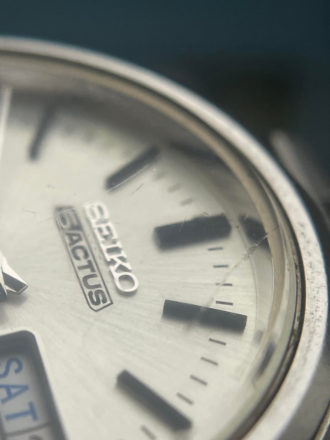 Imgur link w/ more pics/timestamp below. [https://imgur.com/a/seiko-5-actus-xNkPjdK](https://imgur.com/a/seiko-5-actus-xNkPjdK) Dial is in fantastic condition. Watch has scratches on the crystal. Fully original including the bracelet. Watch is 38.5mm x 41mm Enough of links for a 6.7 wrist All functions work great, including quickset for the day and hacking. Looking for 130 USD Shipping included for CONUS.