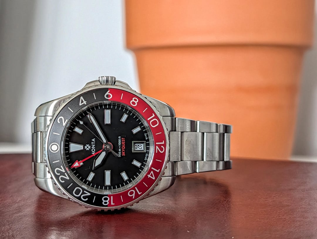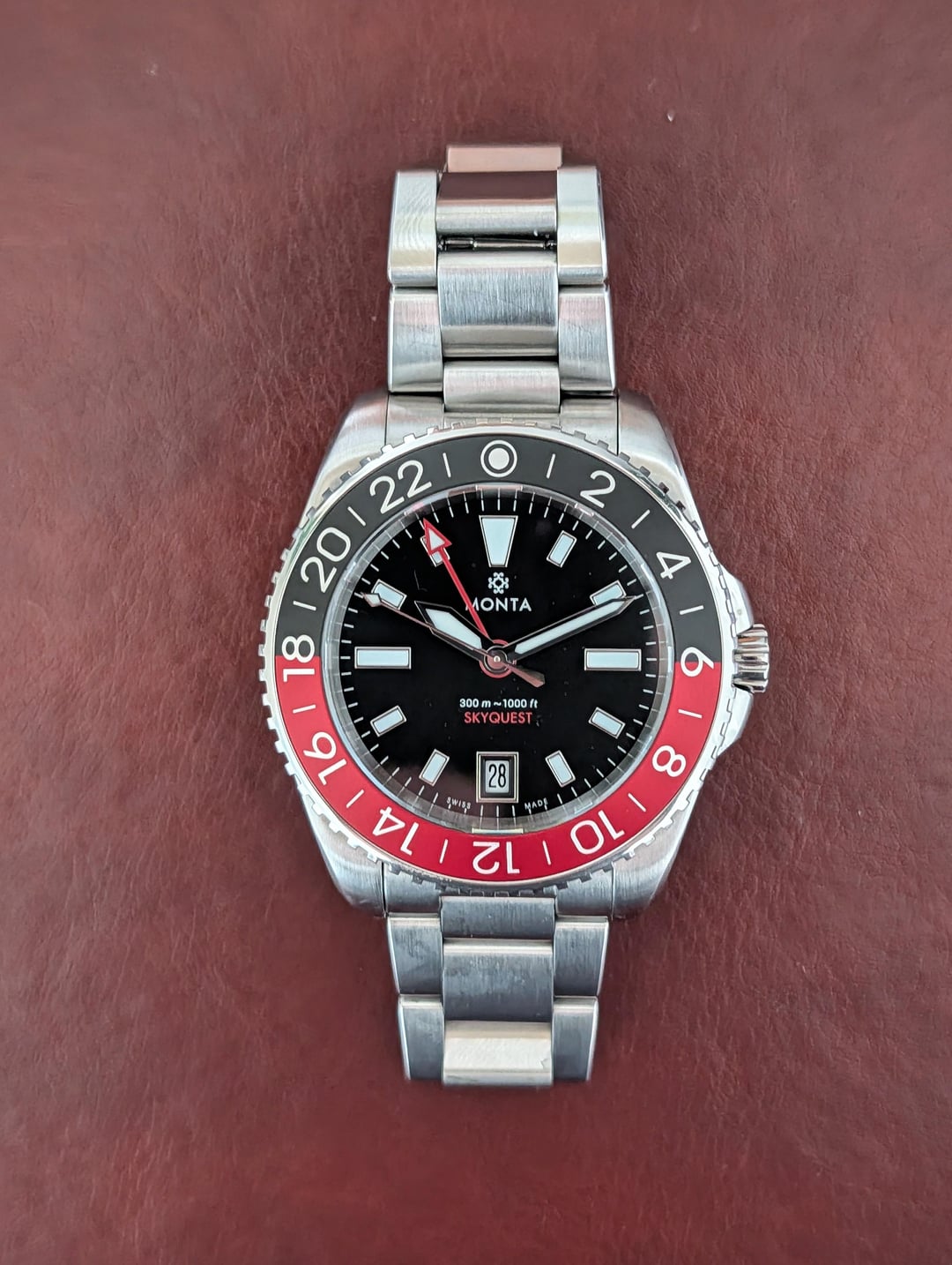 Selling my Monta Skyquest in coke colourway. The watch is in great condition and is keeping very good time. Case Diameter: 40.7 mm Case Thickness: 11.8 mm Lug-to-Lug Distance: 47.4 mm Lug Width: 20 mm Movement: Monta Caliber M-23 (based on a Sellita SW330-2 automatic GMT movement) Crystal: Flat Sapphire with 7 layers of anti-reflective coating on the underside. Lume: BGW9 Swiss SuperLumiNova. Caseback: Display (Sapphire). Time Stamp: https://postimg.cc/DWz3rrt7 Asking €1450 + shipping
