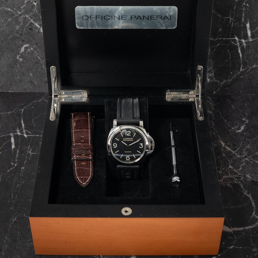 This Panerai Luminor Base 8 Days is a magnificent timepiece. Powered by an impressive 8-day power reserve through its manual-wind, in-house Caliber P.5000 movement, it features an exhibition caseback that beautifully displays the intricacy and craftsmanship Panerai is known for. Model: Luminor Base 8 Days PAM00560 (PAM560)Case Size: 44mm Stainless SteelMovement: Panerai Caliber P.5000 Manual Wind, 8-Day Power ReserveDial: Black with Luminous MarkersCrystal: SapphireCaseback: ExhibitionWater Resistance: 300 meters Included:📦 Original box, warranty booklet & instructions, extra strap, and strap-changing tool. Condition:Great overall condition, runs strong. Shows minor signs of wear such as light scratches, consistent with careful use. Why Us:The Oasis Gallery has an extensive history in luxury watch trading, with references available across the entire United States. Shipping & Availability:Ships FedEx Insured within 24 hours of payment confirmation.Located in New York City, local pickup available.