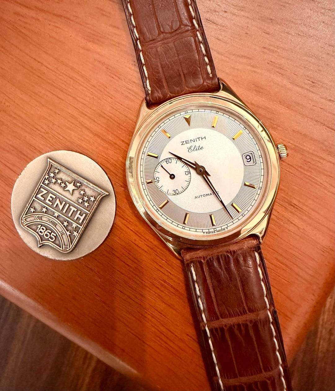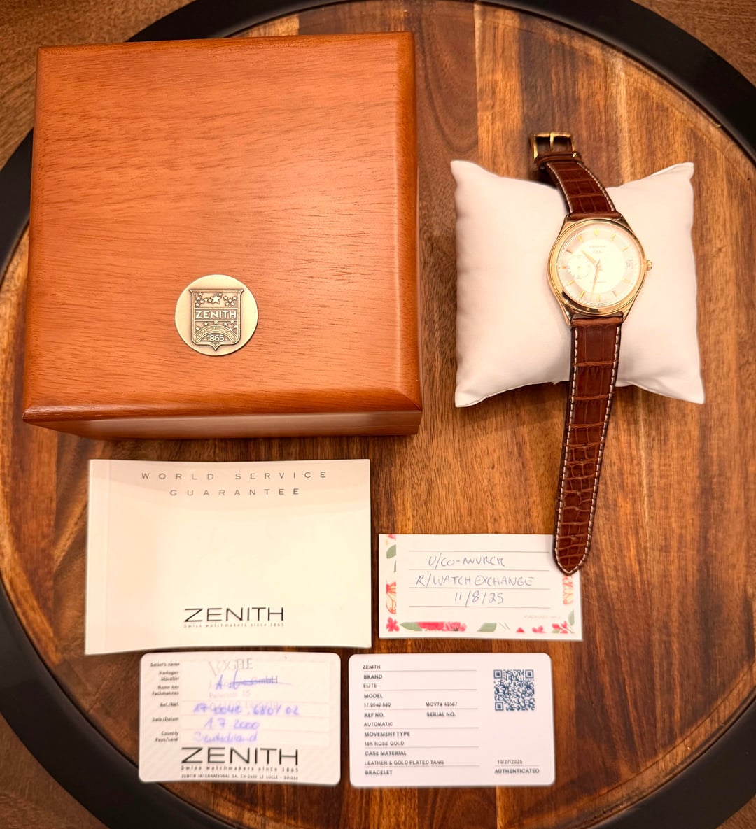 Hello r/Watchexchange! Up for sale is my beautiful neo-vintage 36mm Zenith Rose Gold Class Elite Small Seconds from the late 90s with an Exhibition caseback. Details: Model #: 17.0040.680 Case: 36mm, Solid 18k Rose Gold Dial: Textured White / Silver Opalite Condition: Great w/ Minimal Wear Strap: Original Brown Leather Strap + Original Zenith Pin Buckle Movement: Automatic Elite 680 Caliber - 30m Water Resistant, 55hr Power Reserve Functionality: Working Properly - Recent Service Kit: Original Box + Papers / Warranty & Authenticity Guarantee Certificate Pricing & Shipping Asking $3,475 • Shipped for Free in 🇺🇸 • PayPal F&F or G&S + 3.5% A recent example of this model sold on Hodinkee for $4,875 First few post on this new Reddit account, but I have plenty of feedback on eBay as a Trusted Seller! Please don’t hesitate to reach out if you have any questions or need additional photos