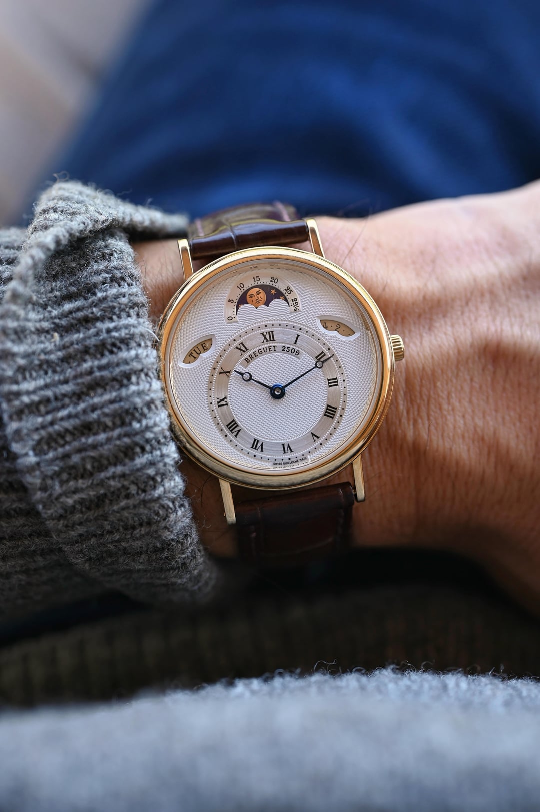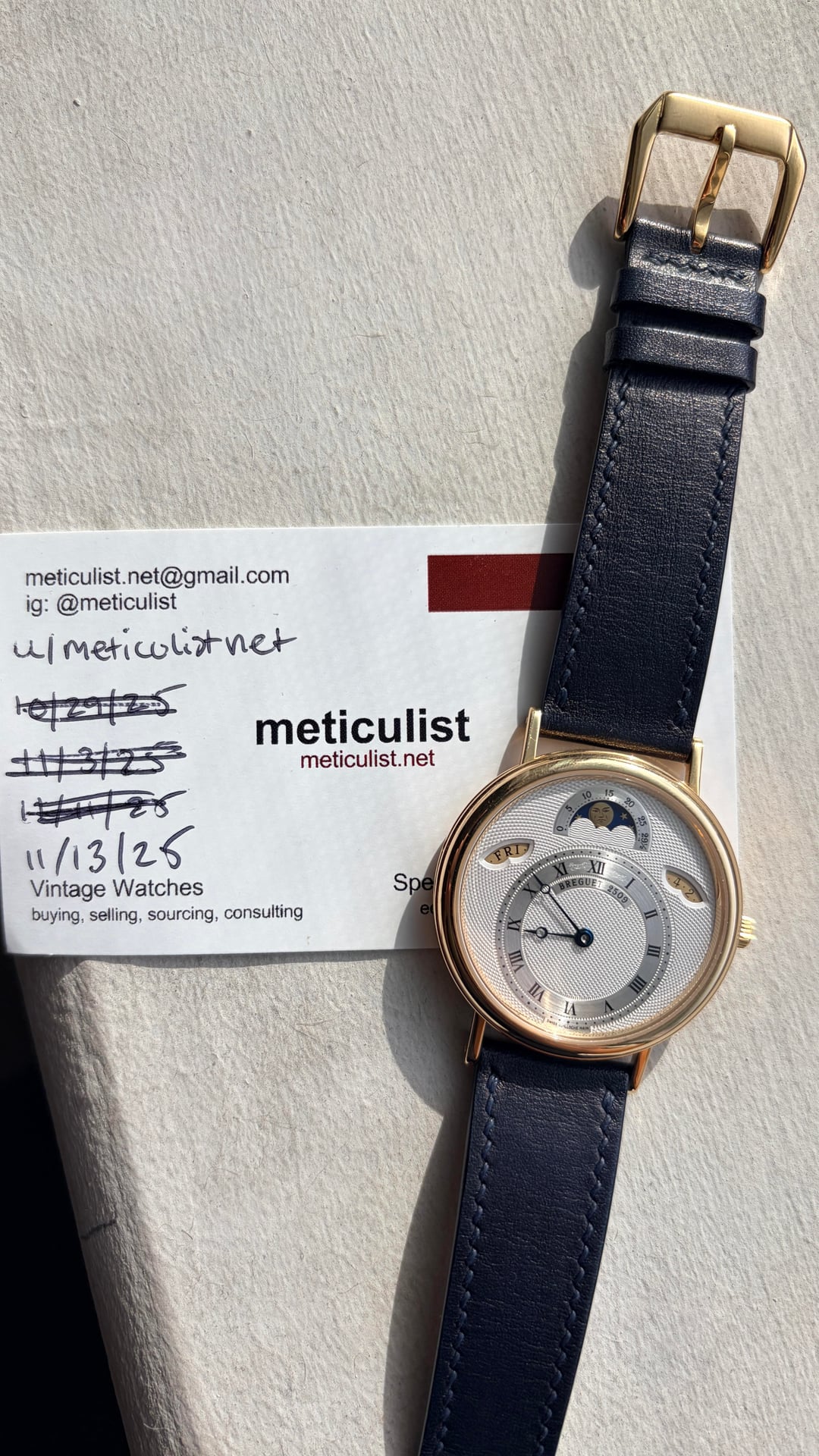 The Breguet Classique Day Date Moonphase Reference 3330BA was the first watch I sold as an official “dealer”, and I’ve missed that watch ever since. The watch is a masterclass in design inside and out with the distinct, hand crafted Classique case in an excellent 35.9 mm size, and one of my all-time favorite displays of the day, date, moonphase, and of course, time. The dial is a masterclass in layout, proportions, symmetry, textures, and negative space, cleanly and legibly displaying the complication in an achingly beautiful fashion. **Case:** The 35.9 x 43 x 7 mm solid yellow gold case is in very good condition throughout. I’m not certain if it has been polished or not, though if it has, it was done sympathetically and lightly, with a high degree of quality. All of the geometry is prominent and even, and the hallmarks and crisp and legible. Light surface scratches are present as photographed, though it is free of any major imperfections. **Dial:** The hand finished white guilloche dial is free of any defects, blemishes, or dirt, and beautifully showcases the dial guilloche pattern, along with the track on the inside and outside of the hour and minutes tracks, and the subtle ripples of the “clouds” below the moonphase aperture. I particularly love the buttery color of the day and date windows adding that vintage warmth and character. **Movement:** The caliber 502 is a Frederic Piguet caliber 71 base automatic movement is winding, setting, running, and functioning correctly and well at approximately +15 s/d, averaged across 6 positions. **Strap:** The watch is presented on its original, signed brown alligator strap with matching yellow gold deployant. The deployant is in excellent condition showing clear and crisp hallmarks. **Includes:** Original outer box, inner wooden presentation box, boutique booklet, and certificate of origin booklet noting a January 2011 date of sale. The wooden presentation box has a crack across the center of the lid that does not affect the integrity of the box. **Price:** $17,000 USD including fully insured shipping from Phoenix, AZ to a FedEx office location or commercial address within the continental US, international shipping available at cost based on location. Payment by ACH or Wire, trades are only considered at wholesale value with your price presented. I have all positive references here, [Chrono24](https://www.chrono24.com/dealer/meticulist/index.htm), forums, and [Instagram](http://instagram.com/meticulist). All available inventory can be found at [meticulist.net](http://meticulist.net) Thanks mods for the space.