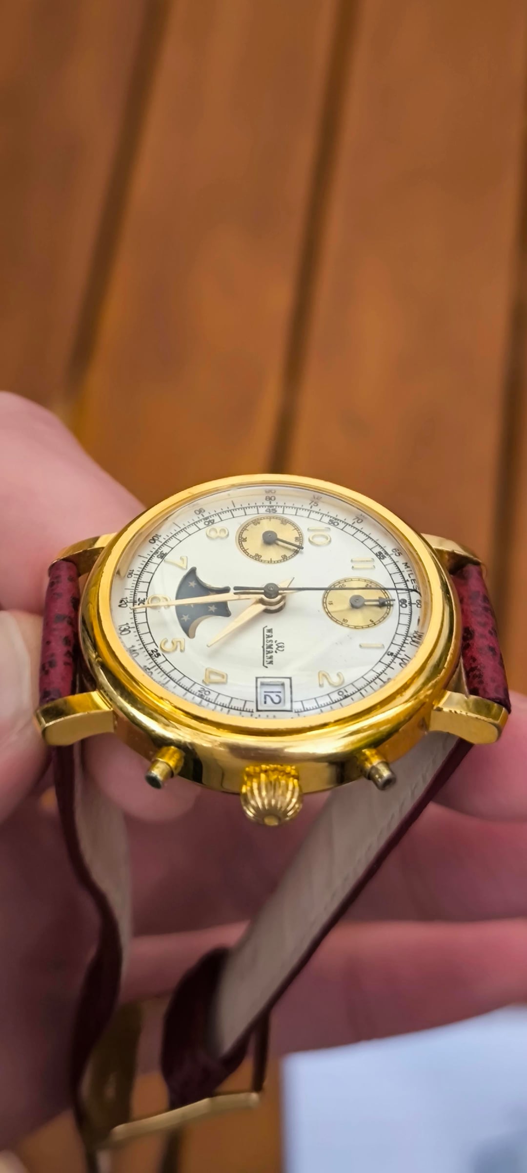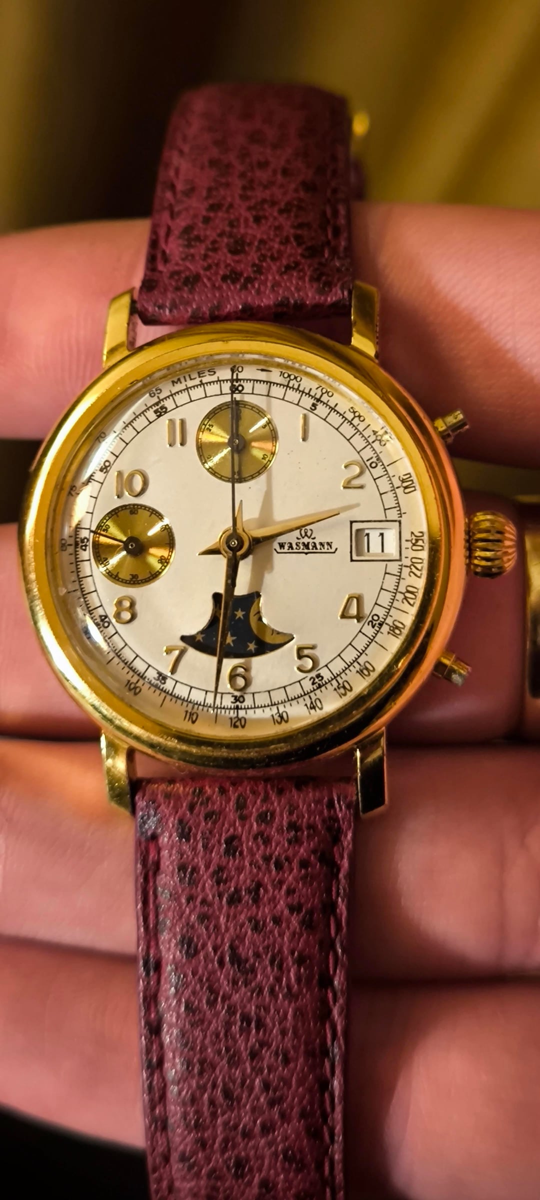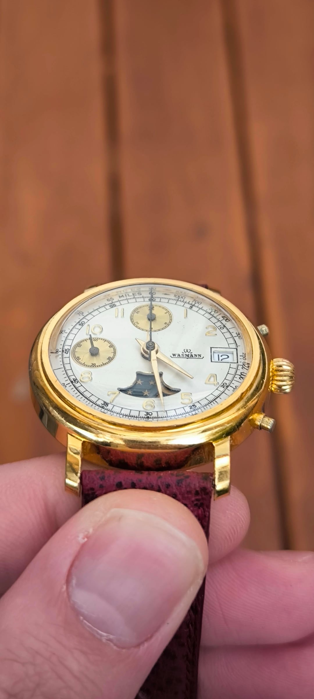 For sale: Wasmann manual wind moonphase Chronograph (Swiss Valjoux 7768) Condition: The watch remains in very good condition and only had some slight user markings but no deep scratches or dents. Also the gold remains crisp and I dont see any discoloration of the gold. I forgot to add them but my previous post had movement photos link : https://www.reddit.com/r/Watchexchange/s/RbFRra8Aqt Details: 38mm case excluding crown, manual wind, chronograph and Moonphase complication. Swiss Valjoux 7768 movement. The dial has beautiful gold tones in the subdials and raised numbers on the dial. Includes: Watch + aftermarket strap. Price:$389 shipping & insurance included. Payment: PayPal F&F or G&S for anyone with at least 1 transaction/reference on watchexchange (+4,3% fee for the buyer). Shipping: Worldwide with tracking, signature for delivery and insurance (FedEx to the US). Ask me for a quote any time. Location: The Netherlands, Europe.