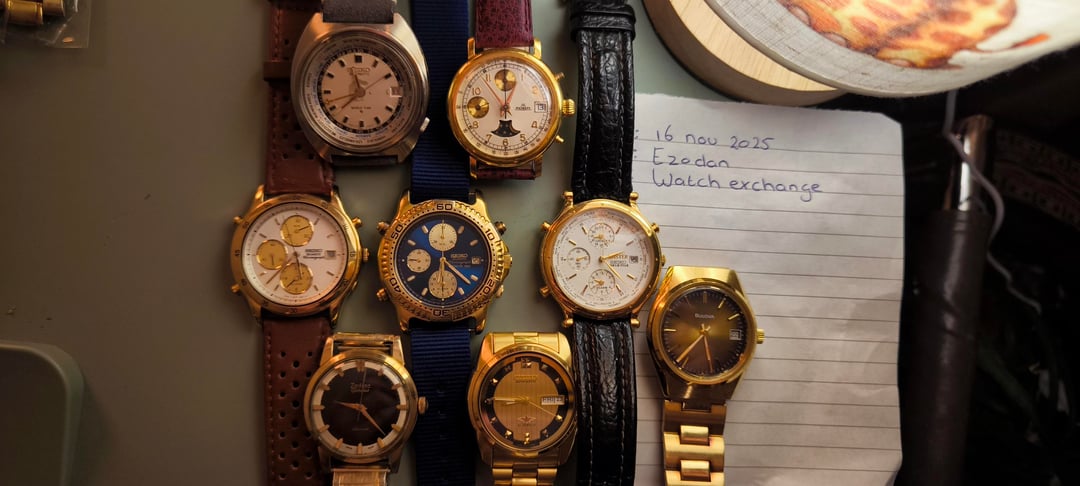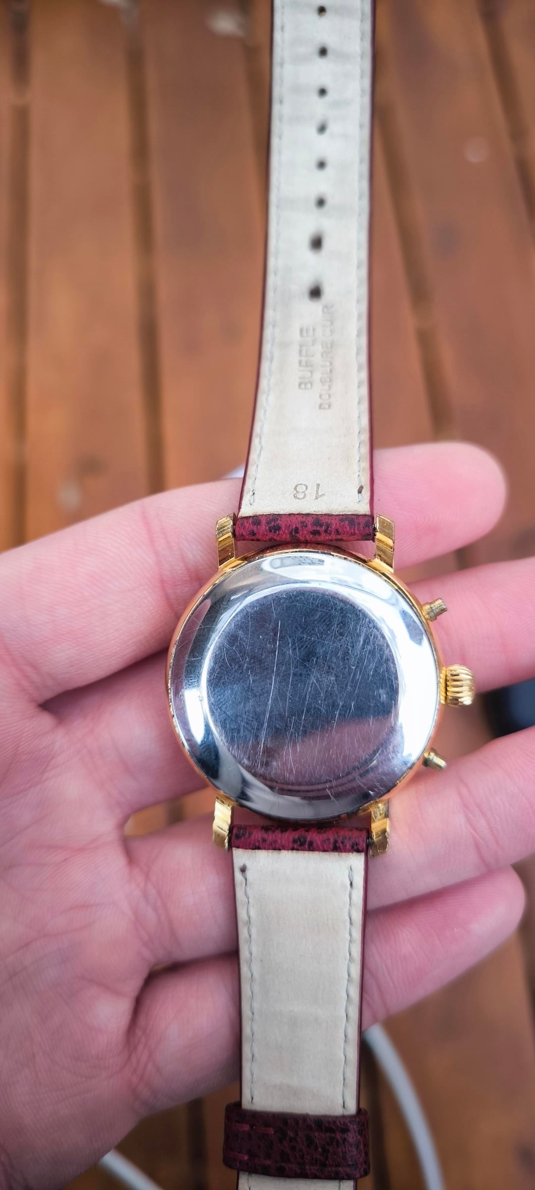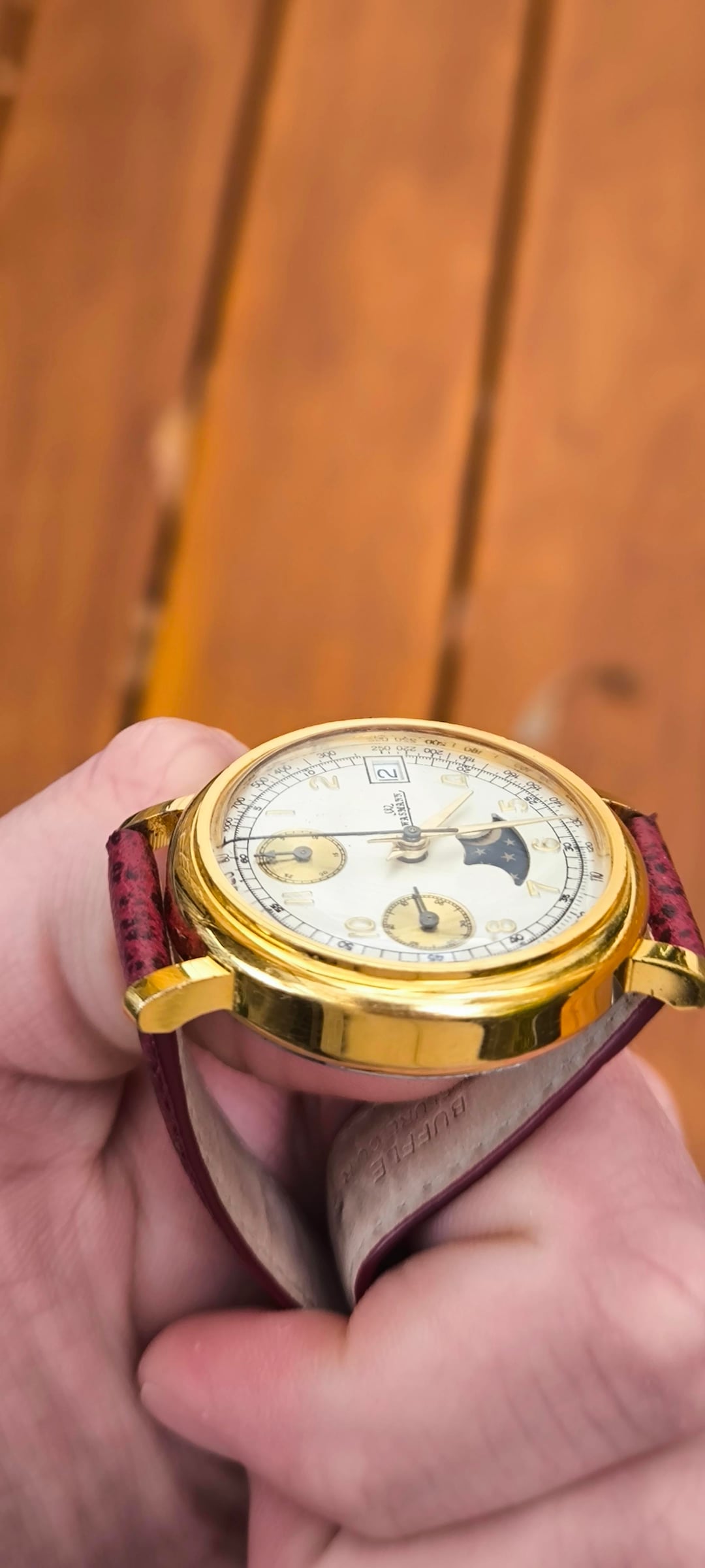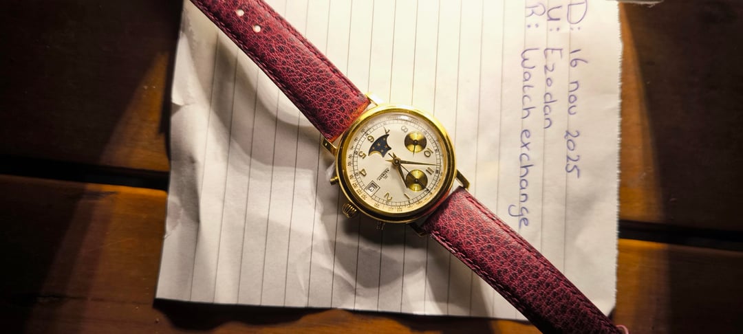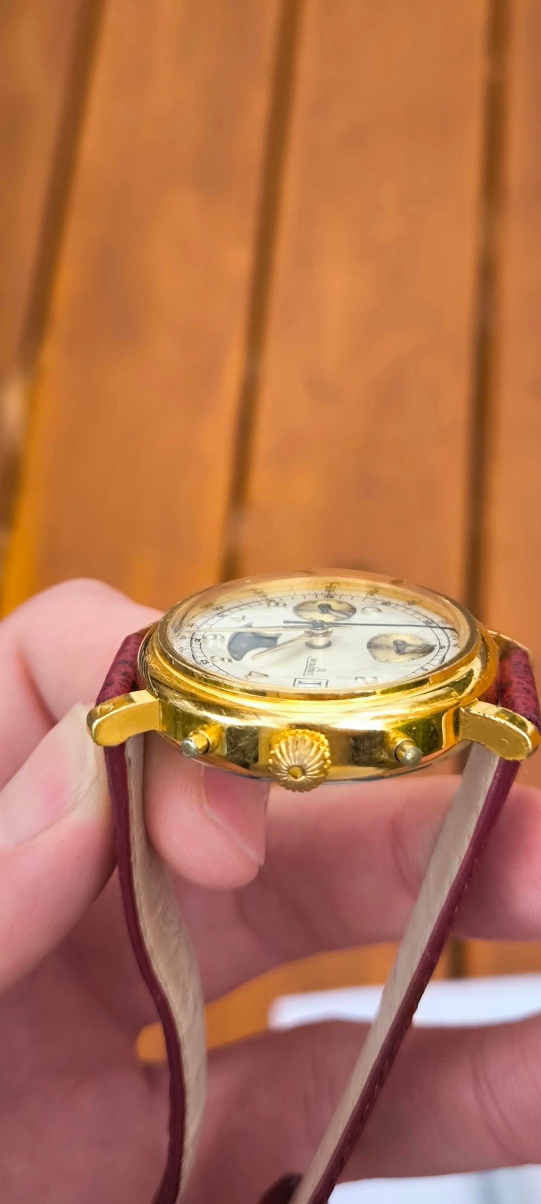 For sale: Wasmann manual wind moonphase Chronograph (Swiss Valjoux 7768) Condition: The watch remains in very good condition and only had some slight user markings but no deep scratches or dents. Also the gold remains crisp and I dont see any discoloration of the gold. I forgot to add them but my previous post had movement photos link : https://www.reddit.com/r/Watchexchange/s/RbFRra8Aqt Details: 38mm case excluding crown, manual wind, chronograph and Moonphase complication. Swiss Valjoux 7768 movement. The dial has beautiful gold tones in the subdials and raised numbers on the dial. Includes: Watch + aftermarket strap. Price:$389 shipping & insurance included. Payment: PayPal F&F or G&S for anyone with at least 1 transaction/reference on watchexchange (+4,3% fee for the buyer). Shipping: Worldwide with tracking, signature for delivery and insurance (FedEx to the US). Ask me for a quote any time. Location: The Netherlands, Europe.