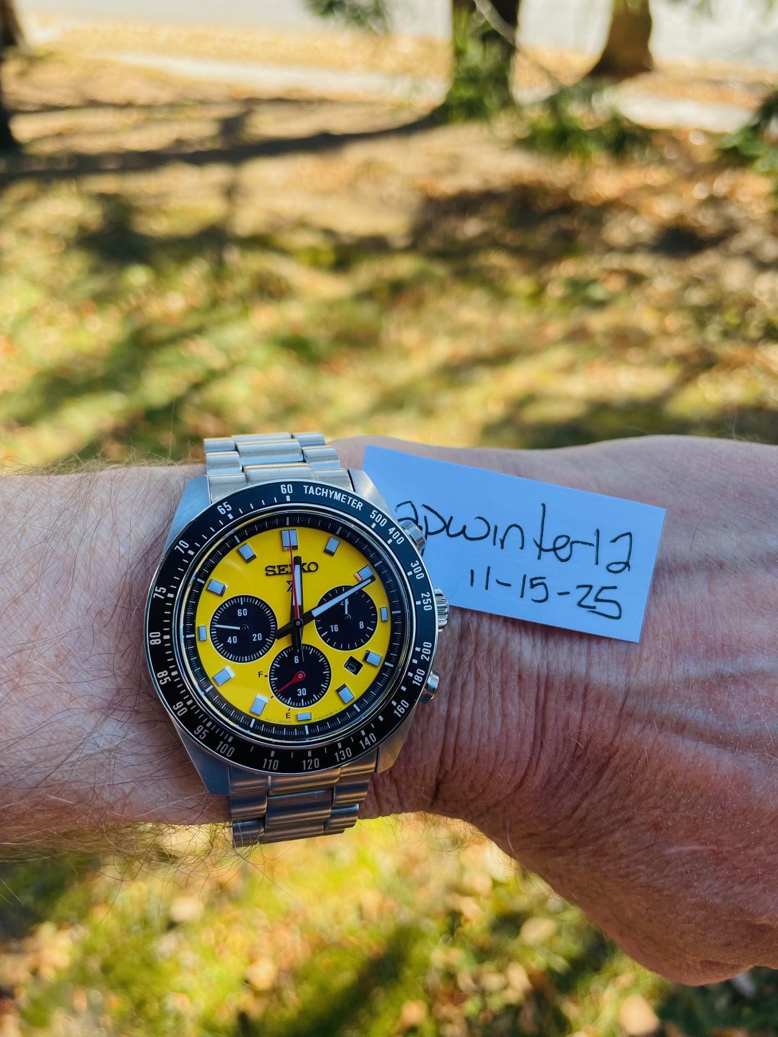 **Seiko Prospex Speedtimer Solar Chronograph SSC929 – Yellow Dial** **No TRADES PLEASE. Shipped CONUS** * Solar-powered V192 movement with 6-month reserve * 41.4mm stainless case, curved sapphire crystal, and 100m WR * Vibrant yellow dial with black subdials and sporty feel * Chronograph, 24-hour subdial, and split timing features **Condition & Sale:** Excellent overall condition, worn sparingly. Fully charged and functioning flawlessly. Comes with box and tags. * **Price:** **$375 (Excellent Condition)** [Official page](https://seikousa.com/products/ssc929) [Photos and Wrist Roll Video](https://imgur.com/a/odLu9Tk) The Seiko SSC929 is a Speedtimer solar chronograph (V192 solar caliber) with a 41.4mm stainless case, curved sapphire crystal, 60-minute chronograph with split timing, 24-hour subdial and a long 6-month reserve when fully charged; the US Special Edition yellow-dial variant is sporty and tech-forward while staying very wearable for daily use. Tons of great WUS feedback and many transactions here. Great watch just not seeing wrist time and I need to scale back!