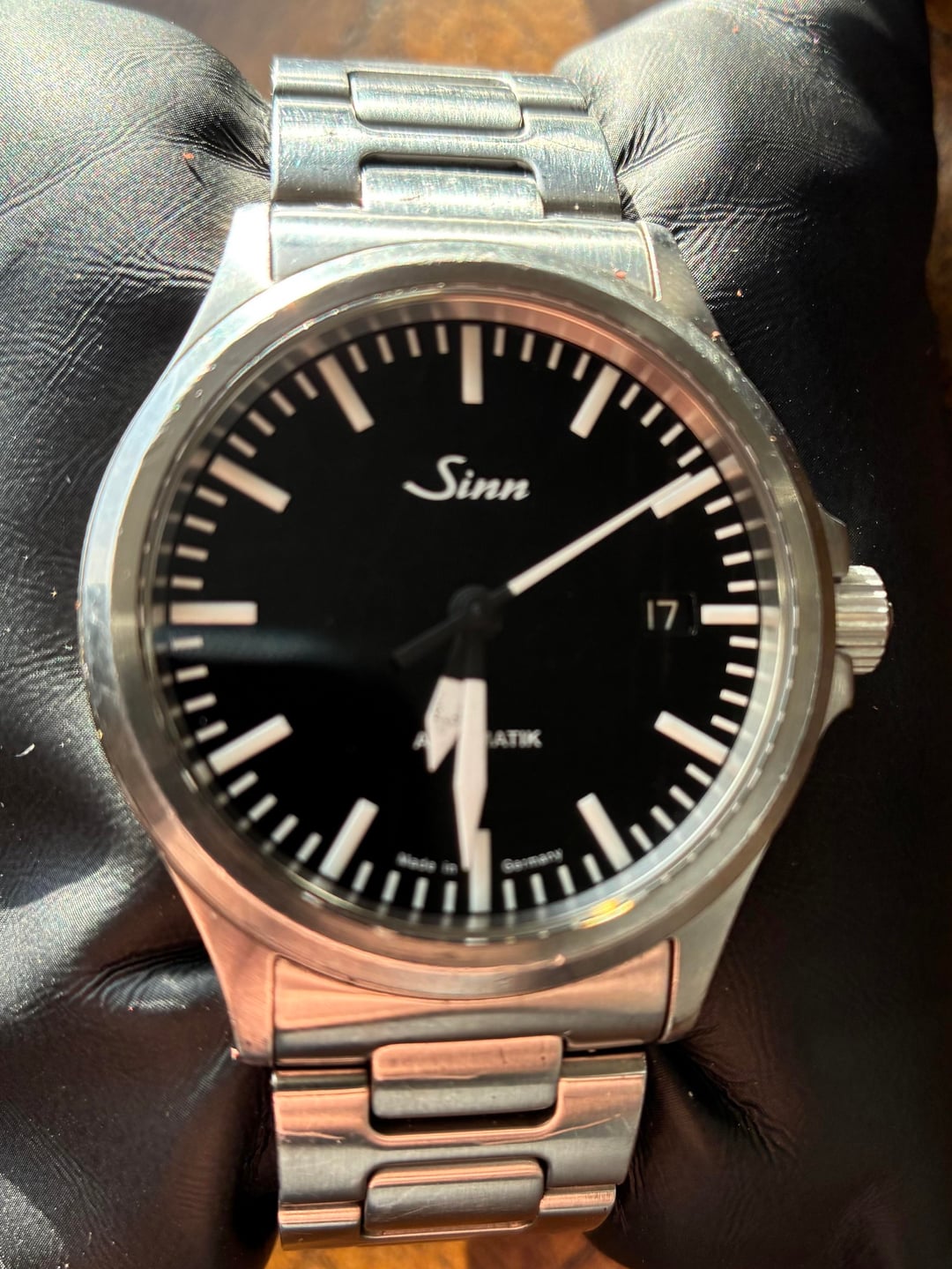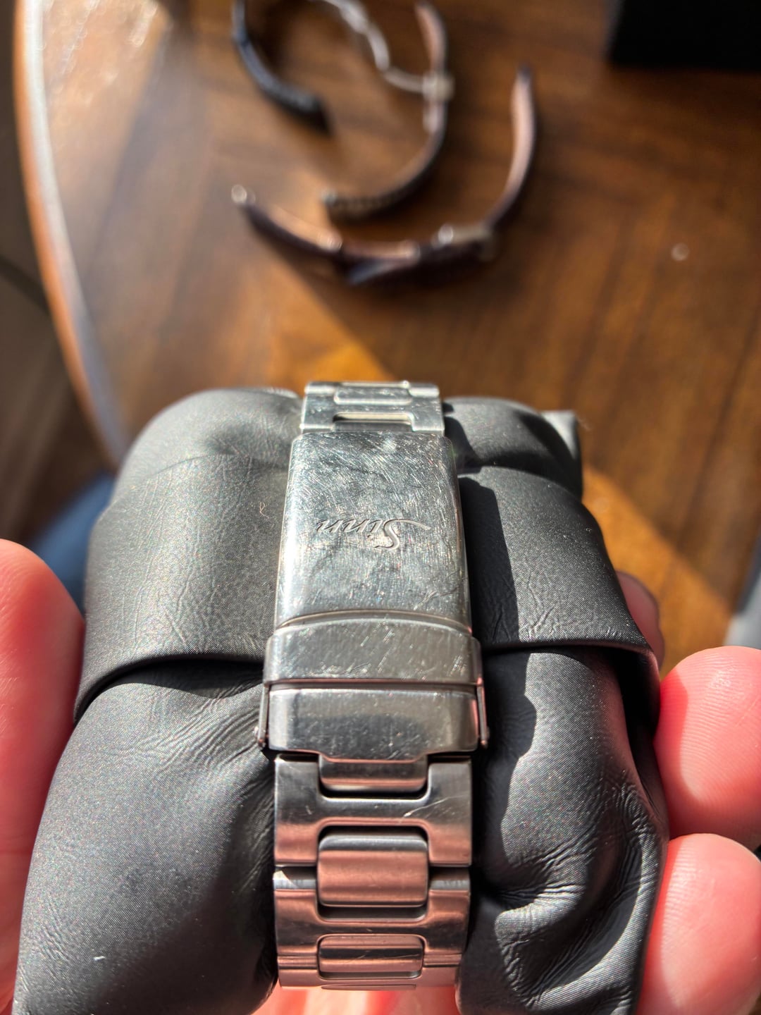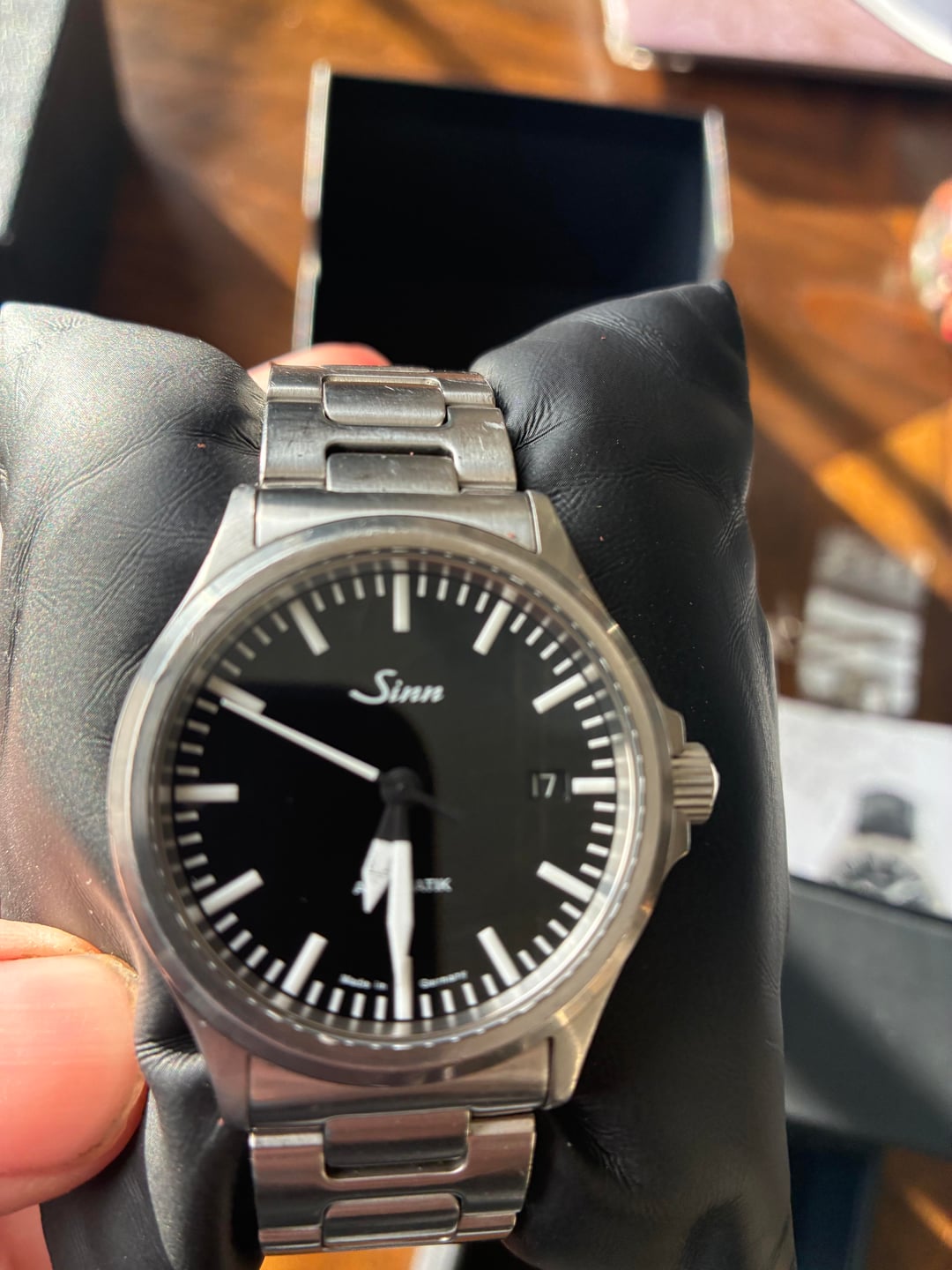 Selling a Sinn 556i Full Kit with H-link bracelet and two extra Sinn leather bands with a deployment clasp. $700 + Shipping. PayPal. If you want a Sinn watch for less, this watch is for you. Yes it has scuffs and scratches, which I’ve tried to capture in the photos, but it still looks great on the wrist. Additionally, the hour hand has light black scuffing on the Lume. It looks like paint transfer from the minute hand due to a possible drop from the previous owner. The lume still works well. Time is approximately +-8 to 10 seconds a day in my experience. Please let me know if you have any questions or concerns.