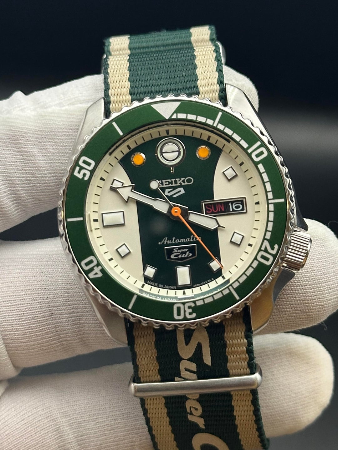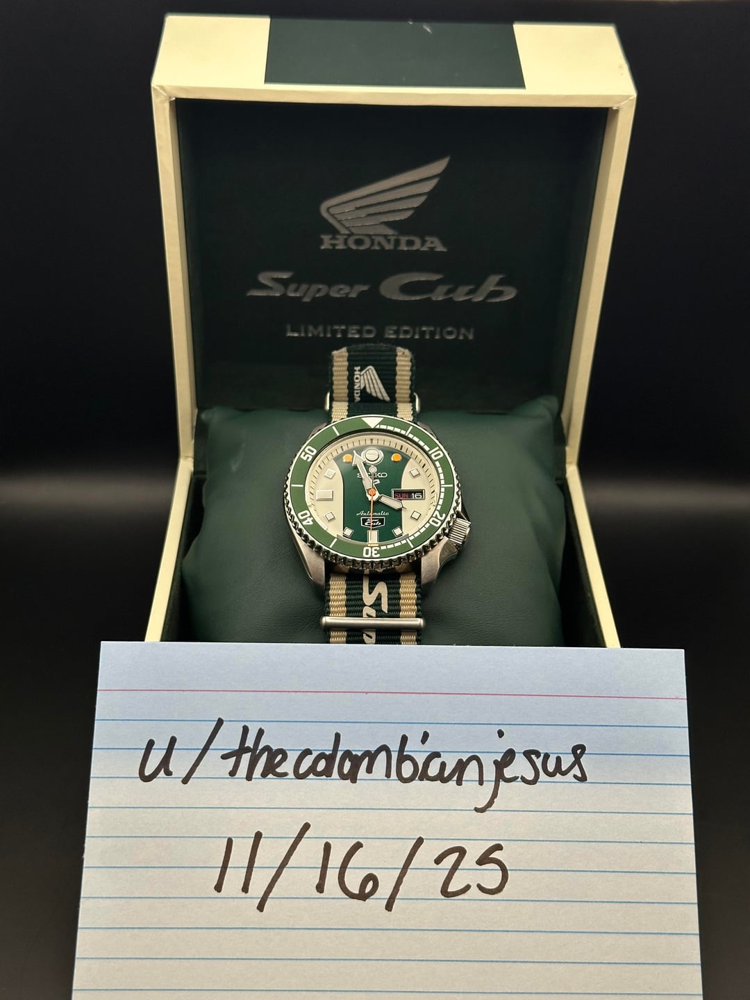 Up for sale is a Seiko 5 Sports Super Cub SRPJ49, a limited edition collaboration between Seiko and Honda celebrating the iconic Super Cub motorbike. If you’re familiar with the Super Cub, you already know it’s one of the most legendary and widespread vehicles ever produced. Seiko captured it perfectly in this release, pulling in styling cues from the original bike through the color scheme, dial layout, and the custom caseback artwork. It feels like a fun, nostalgic piece while still being totally wearable as a casual daily watch. This model was limited to 6000 pieces, and the one I am selling is individually numbered 1014. This watch is in mint condition and comes as a complete set with original box and stamped warranty card. It has been lightly handled and shows no signs of wear. A great pick up for Seiko collectors and for anyone who loves unique collaboration pieces that rarely come up for sale. **Condition:** * Overall: Mint condition * Case: Clean, no visible marks * Crystal: Perfect * Strap: Original NATO strap in excellent condition **What's Included:** * Seiko Super Cub Limited Edition box * Original Seiko Super Cub NATO strap * Seiko warranty card (stamped and dated January 2023) **Specifications:** * Model: Seiko 5 Sports Super Cub * Reference: SRPJ49 * Case size: 42.5mm * Thickness: 13.4mm * Lug to lug: 46mm * Lug width: 22mm * Dial: Super Cub themed dial with custom indices * Caseback: Closed caseback with Honda Super Cub logo and numbered 1014/6000 engraved * Crystal: Hardlex * Movement: Seiko 4R36 automatic * Water resistance: 100m * Strap: Original Super Cub NATO strap **Pricing:** * **Asking $450 shipped** via USPS Priority Mail, fully insured within the CONUS * Payment via Zelle, Venmo, PayPal F&F, or PayPal G&S with transaction history (buyer covers 3.5% fee) * Ships from Orlando, FL (so no extra tariffs or duties) [Timestamp](https://www.reddit.com/media?url=https%3A%2F%2Fpreview.redd.it%2Fwts-seiko-5-super-cub-limited-edition-srpj49-full-kit-mint-v0-snv2zieflp1g1.jpg%3Fwidth%3D1080%26crop%3Dsmart%26auto%3Dwebp%26s%3Dbd2ddb8342f4bfeab7c090222b8be3e9b9698ccf) [WatchCharts Feedback](https://watchcharts.com/repcheck/reddit/thecolombianjesus/feedback) Feel free to reach out if you have any questions or want additional photos!