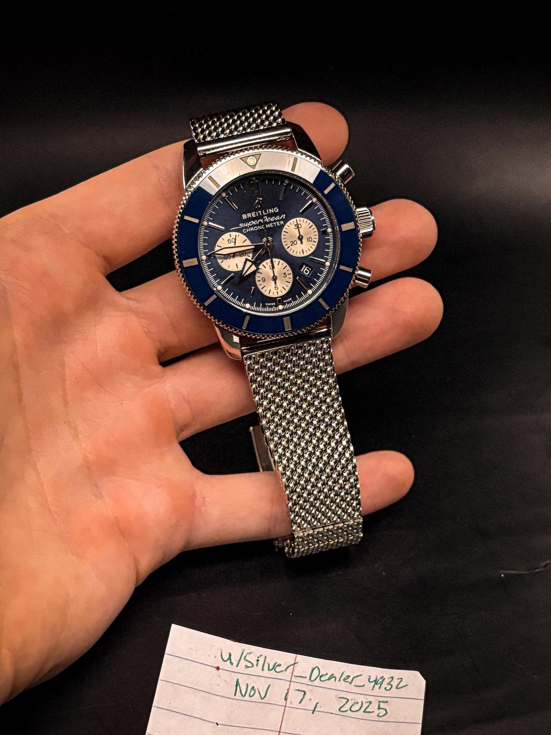 Condition – Case shows normal light surface wear consistent with careful use — small hairlines and light marks on polished surfaces, but no dents, dings, or deep scratches. Bezel is clean and vibrant with strong color, sharp markers, and only minor handling wear visible under angled lighting. Crystal has hairline scratches (see photos). They are not deep, but they are present and fully disclosed. Dial is excellent — rich sunburst blue with crisp printing, clean subdials, and evenly aged lume plots. Hands are clean with no corrosion or discoloration. Chronograph pushers and crown operate smoothly, with the chronograph starting/stopping/resetting properly. Mesh bracelet is in very good condition with light surface wear and no broken links. Clasp shows typical hairlines from normal desk use, with Breitling engraving sharp and clean. Movement is running strong at +6 s/d, 331° amplitude, and 0.1 ms beat error, indicating a healthy Breitling Caliber B01 (photo included). ⸻ Box & Papers Watch-only (no box or papers). Mesh bracelet and clasp included as shown. ⸻ Price – $2,999 Shipped Zelle and Bank Wire preferred; Venmo/Apple Pay +15.. *sales tax applicable to buyers in GA or IL ⸻ Shipping Ships within 24 hours of cleared payment via FedEx 2-Day, insured for full value. US only. ⸻ Timestamp Included in photos. ⸻ Overview The Breitling Superocean Heritage II Chronograph (Ref. AB0162) brings together the classic 1950s Superocean design with Breitling’s in-house Caliber B01, known for its reliability, accuracy, and 70-hour power reserve. The blue sunburst dial and matching blue bezel make this one of the most attractive configurations of the Heritage line, especially paired with the stainless-steel mesh bracelet. This example runs extremely well, shows honest light wear, and offers a strong value for an in-house Breitling chronograph — priced competitively due to disclosed crystal hairlines.