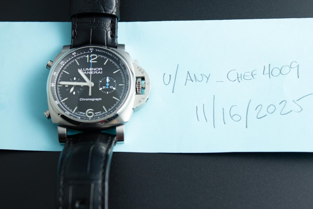 WTS: $7K The Panerai Luminor Chrono PAM01109 brings classic Luminor DNA together with a robust automatic chronograph. This example is in excellent condition with only very light handling marks, clean crystal, strong timekeeping, and manufacturer’s warranty coverage. It’s a complete Full Set and includes various extra straps for instant versatility. Highlights \- Model/Ref: Panerai Luminor Chrono PAM01109 \- Size/Case: 44mm AISI 316L brushed steel, polished bezel, crown guard \- Movement: Automatic Panerai P.9200, \~42h power reserve \- Dial: Black with luminous numerals/markers; chrono minutes at 3, small seconds at 9 \- Functions: Hours, minutes, small seconds, chronograph, tachymeter on rehaut \- Water Resistance: Rated 10 bar (\~100 m) when new \- Condition: Excellent; no notable micro-scratches, only light handling; crystal clean \- Set: Full Set – inner/outer boxes, warranty card, tags, bezel protector, original receipt \- Extras: Assorted additional straps included (see photos) \- Shipping: FedEx 2-Day, fully insured, signature required Condition Details \- Case/Bezel: Excellent with minimal signs of gentle wear; no notable dings or deep scratches \- Crystal: Clean and clear \- Dial/Hands: Original, luminous plots strong \- Strap/Clasp: Included straps in lightly worn to excellent condition as pictured \- Performance: Timing performance seems great in normal use \- Warranty: Under manufacturer’s warranty What’s Included \- Panerai PAM01109 watch head \- Mounted strap (see photos) \- Various extra straps (rubber/calf/alligator mix; see photos for colors/types) \- Inner and outer Panerai boxes \- Panerai warranty card \- Tags and original receipt \- Bezel protector Shipping & Returns \- Shipping: FedEx 2-Day, fully insured, signature required \- Handling time: Ships within 1 business day \- Returns: 14-day returns if unworn and complete; buyer pays return shipping \- Authenticity: 100% authentic Panerai; Questions welcome. Reasonable offers encouraged. Buy with confidence: complete set, manufacturer’s warranty, fast insured shipping.