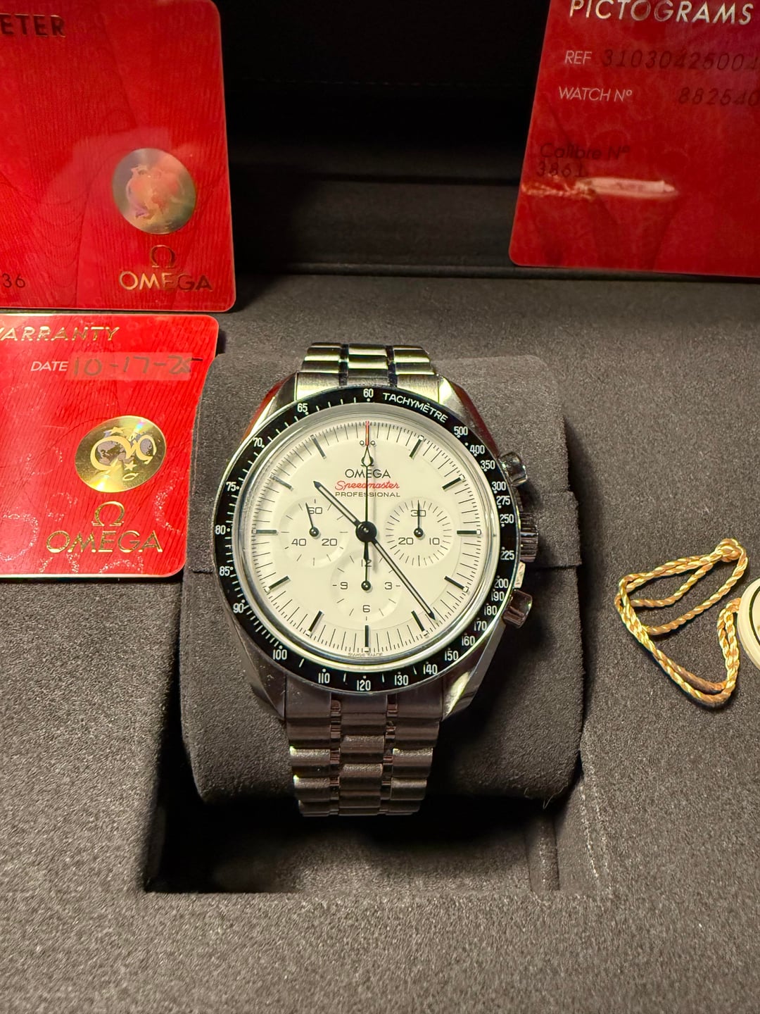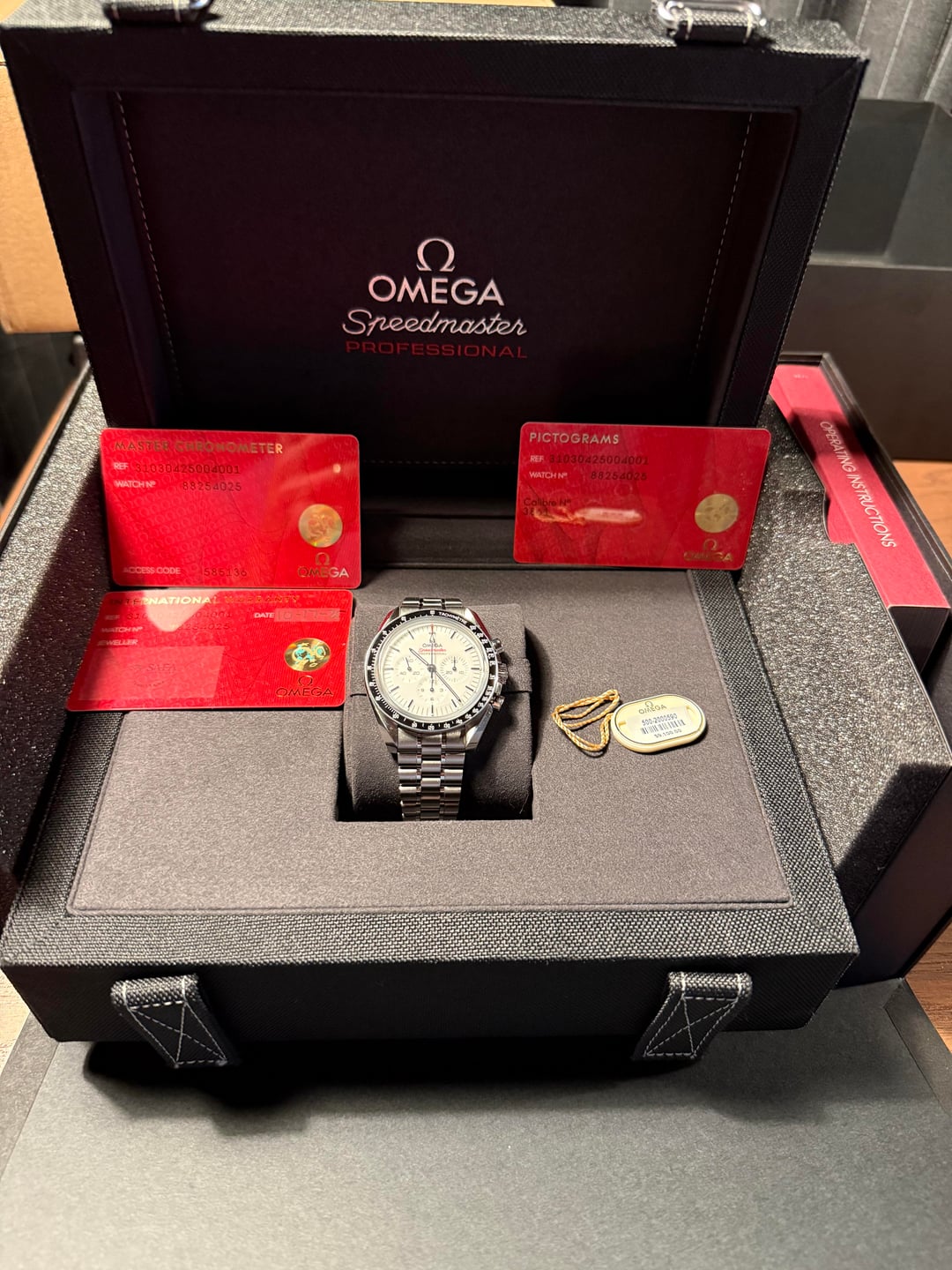 Hello Everyone, Posting my Omega Speedmaster Professional for sale today to fund a home gym. This watch comes with the full kit, including outer black box, inner box, the booklets and pictogram, travel case, polishing cloth, and warranty card dated October 2025. The watch is in great condition. There are a couple of small scuffs on the clasp from desk diving, and I did cause some small markings to show on the screws on the bracelet when changing the size for myself. It would be difficult to see these when not really looking! Price: $7,700 Located in Atlanta GA and I welcome an in person exchange. Timestamp: https://imgur.com/gallery/h-J7jTL7a